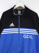 Trainingsjacke der Marke Adidas in Größe L aus den 90'ern. Sie ist aus Synthetik gemacht und in Blau im Angebot. Mit chiquem Vintage Print.