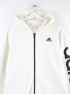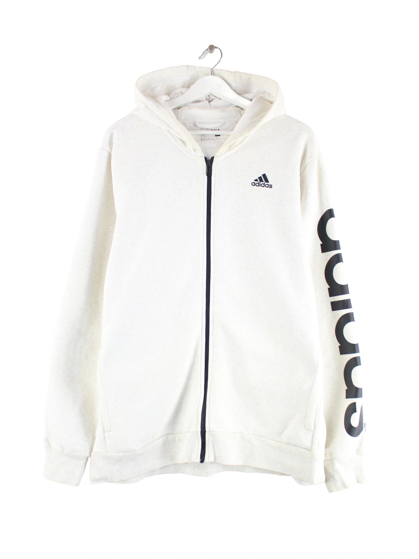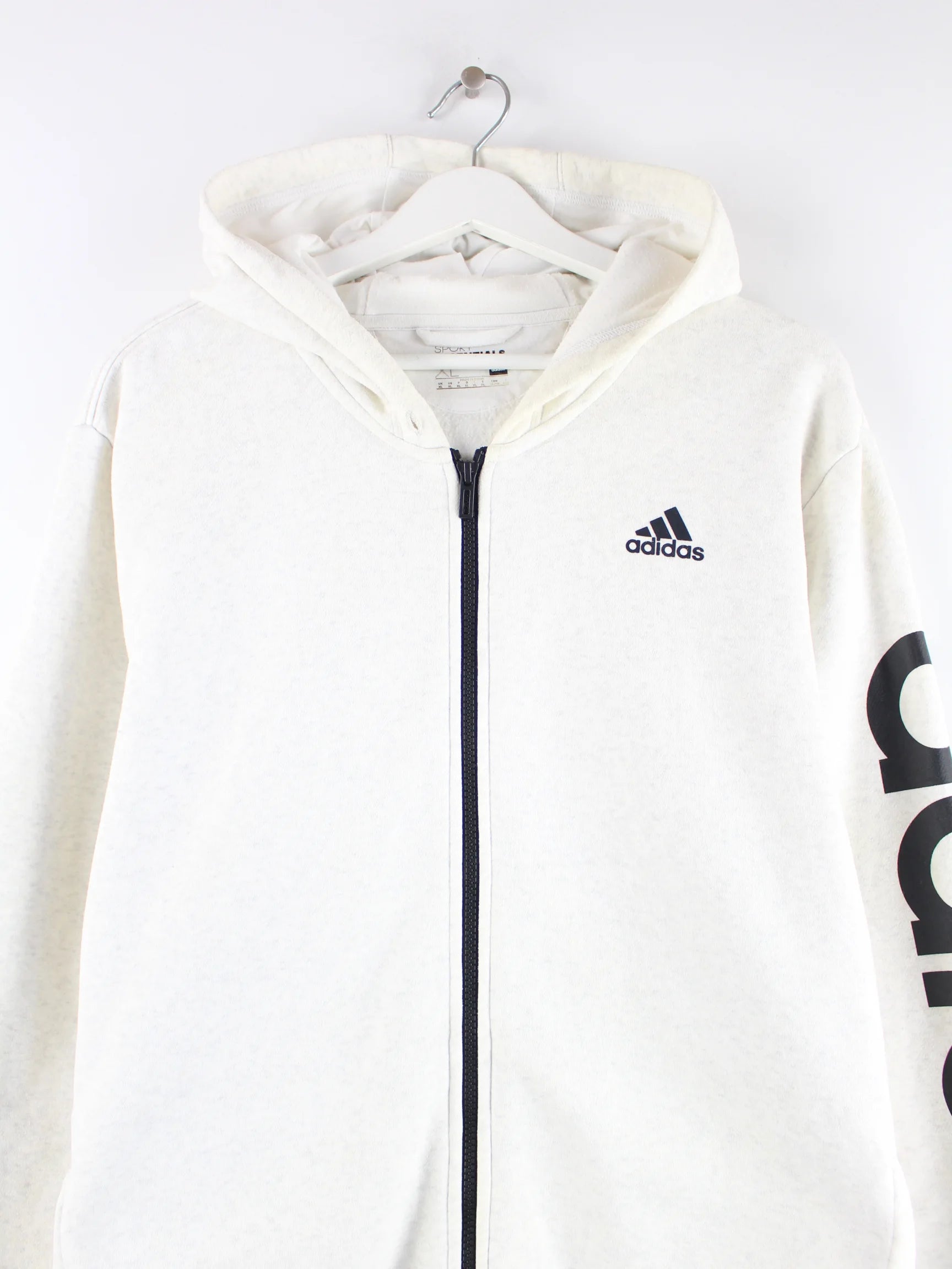 Hoodie der Brand Adidas mit langem Reißverschluß in Größe XL. Er ist aus einer Baumwollmischung angefertigt und in Grau auf Lager. Mit schickem undefined Print.