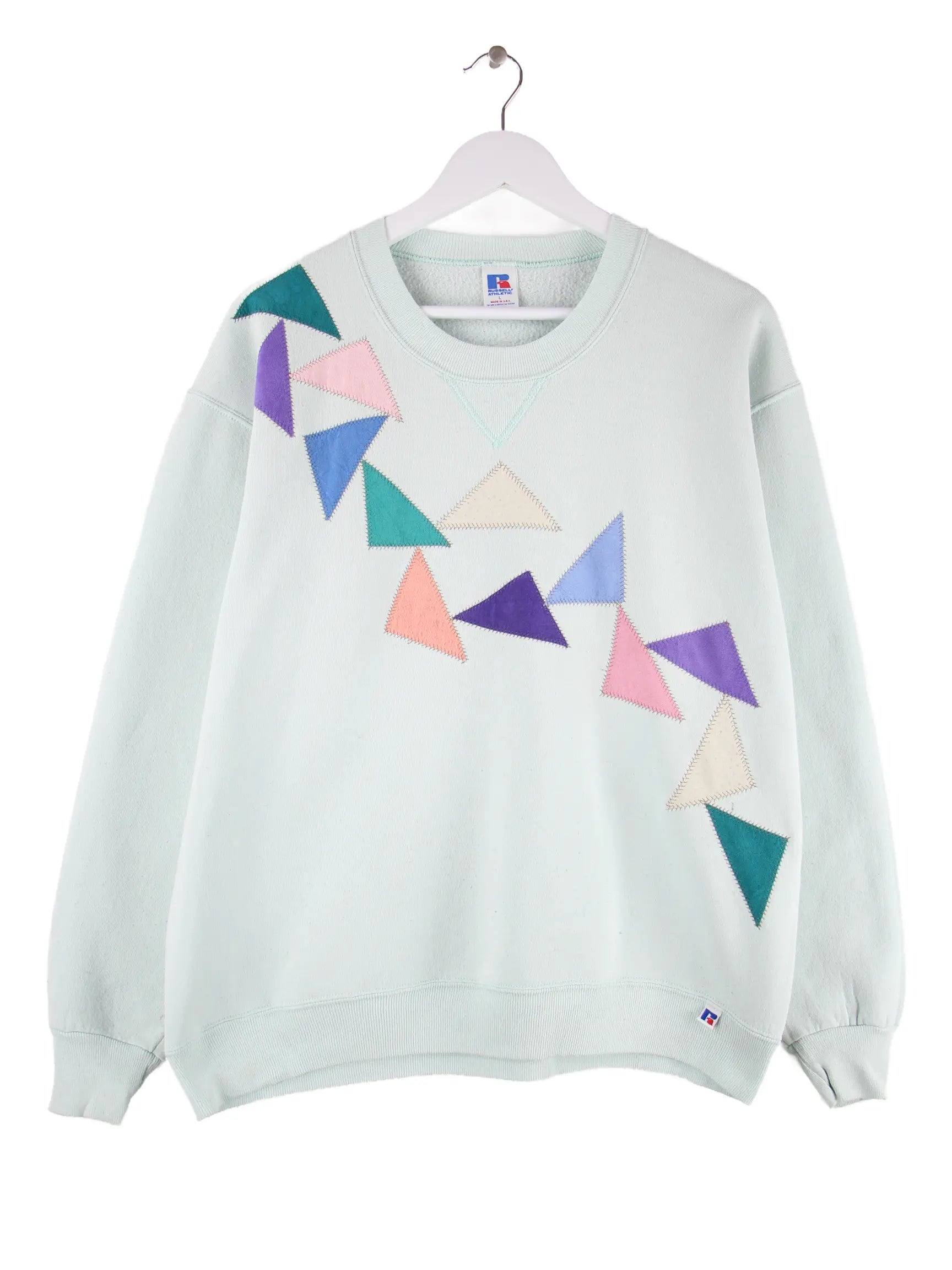 Türkisfarbener Sweater aus dem Hause Russell Athletic aus den 90'ern in Größe L. Er ist aus einer Baumwollmischung gefertigt. Den Zustand würden wir als 'In Ordnung' bezeichnen (vergl. Bilder).