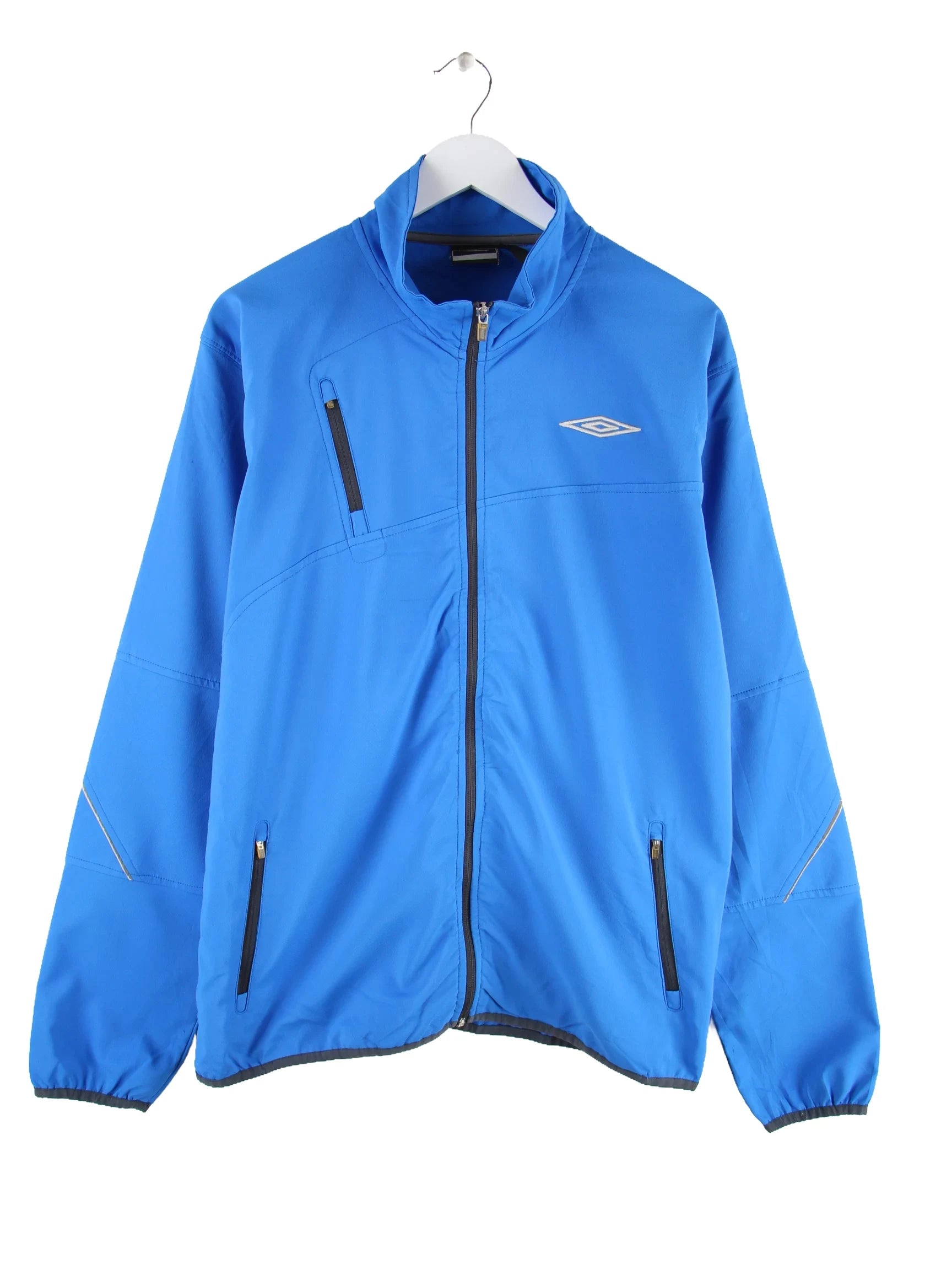 Blaue Trainingsjacke aus dem Hause Umbro in Größe XL. Sie ist aus Synthetik angefertigt und in sehr gutem Zustand im Bestand.