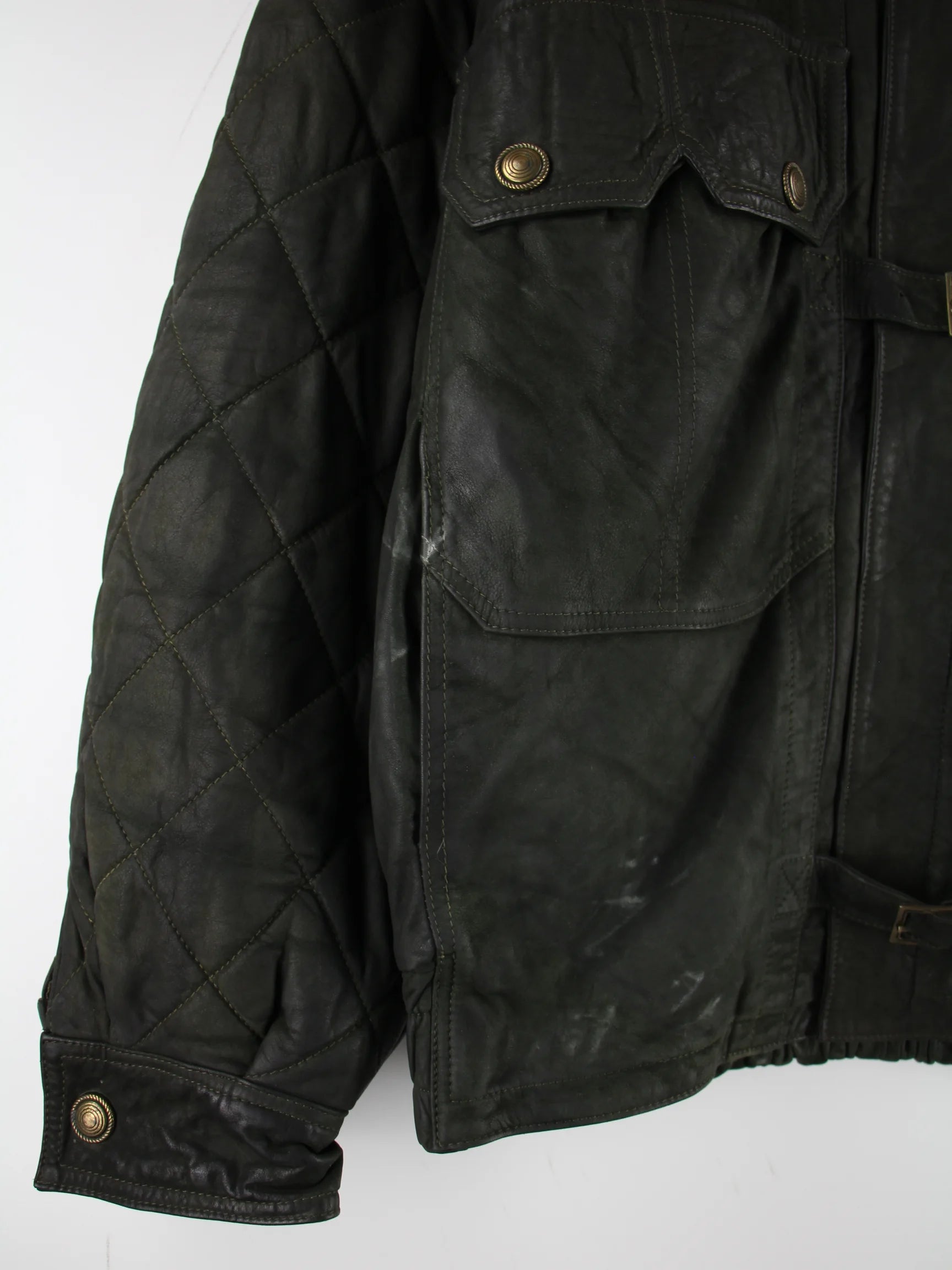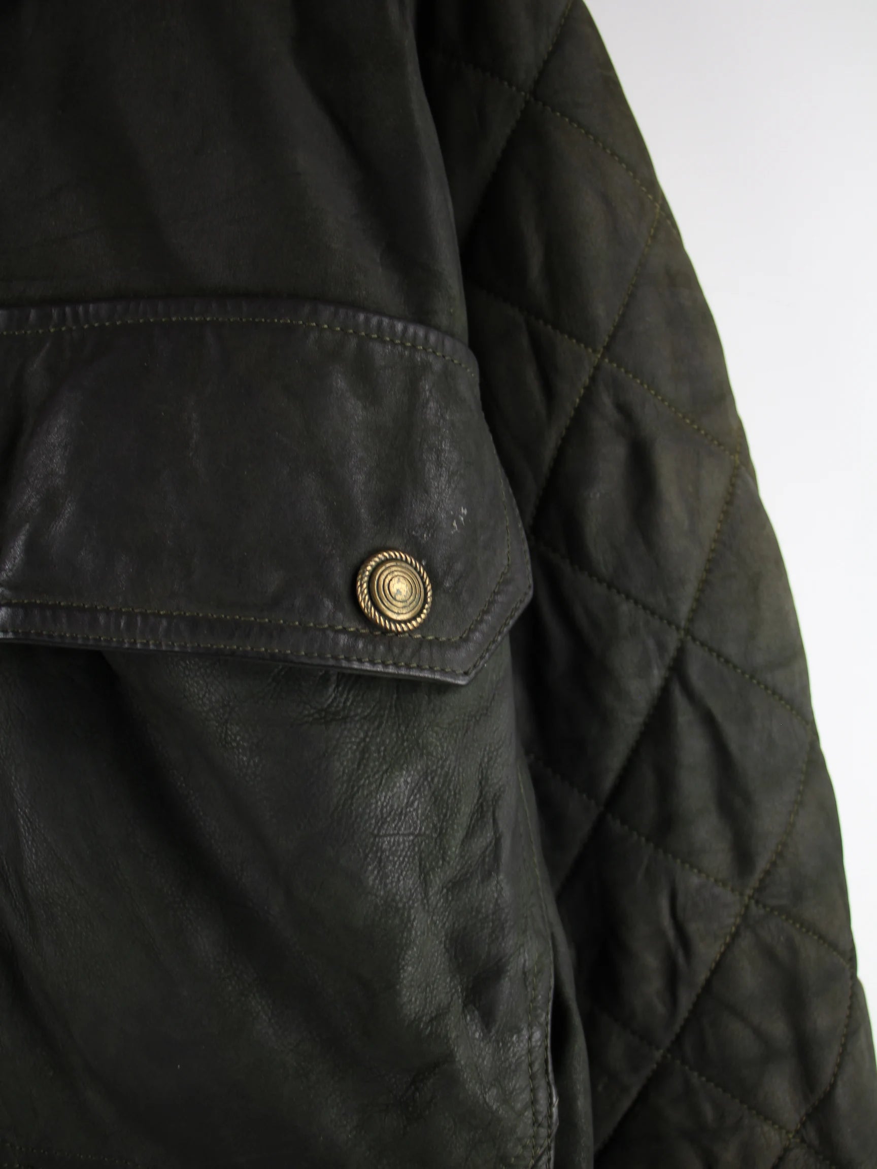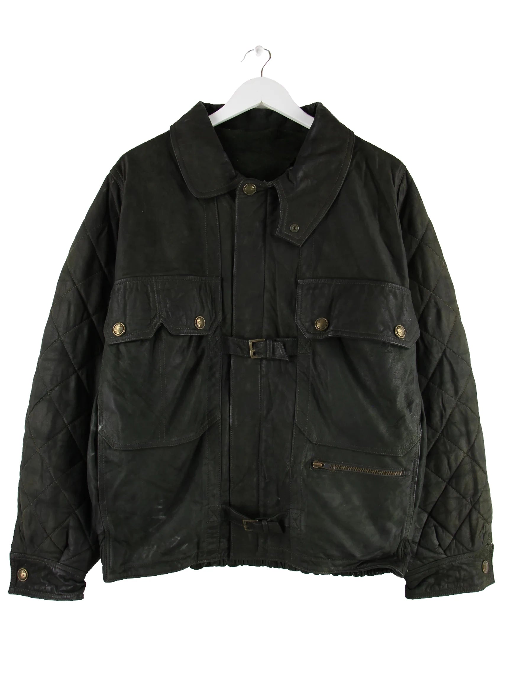 Grüne Vintage Jacke aus den 90'ern in Größe L. Sie ist aus Leder produziert. Den Zustand würden wir als 'In Ordnung' bezeichnen (vergl. Bilder).