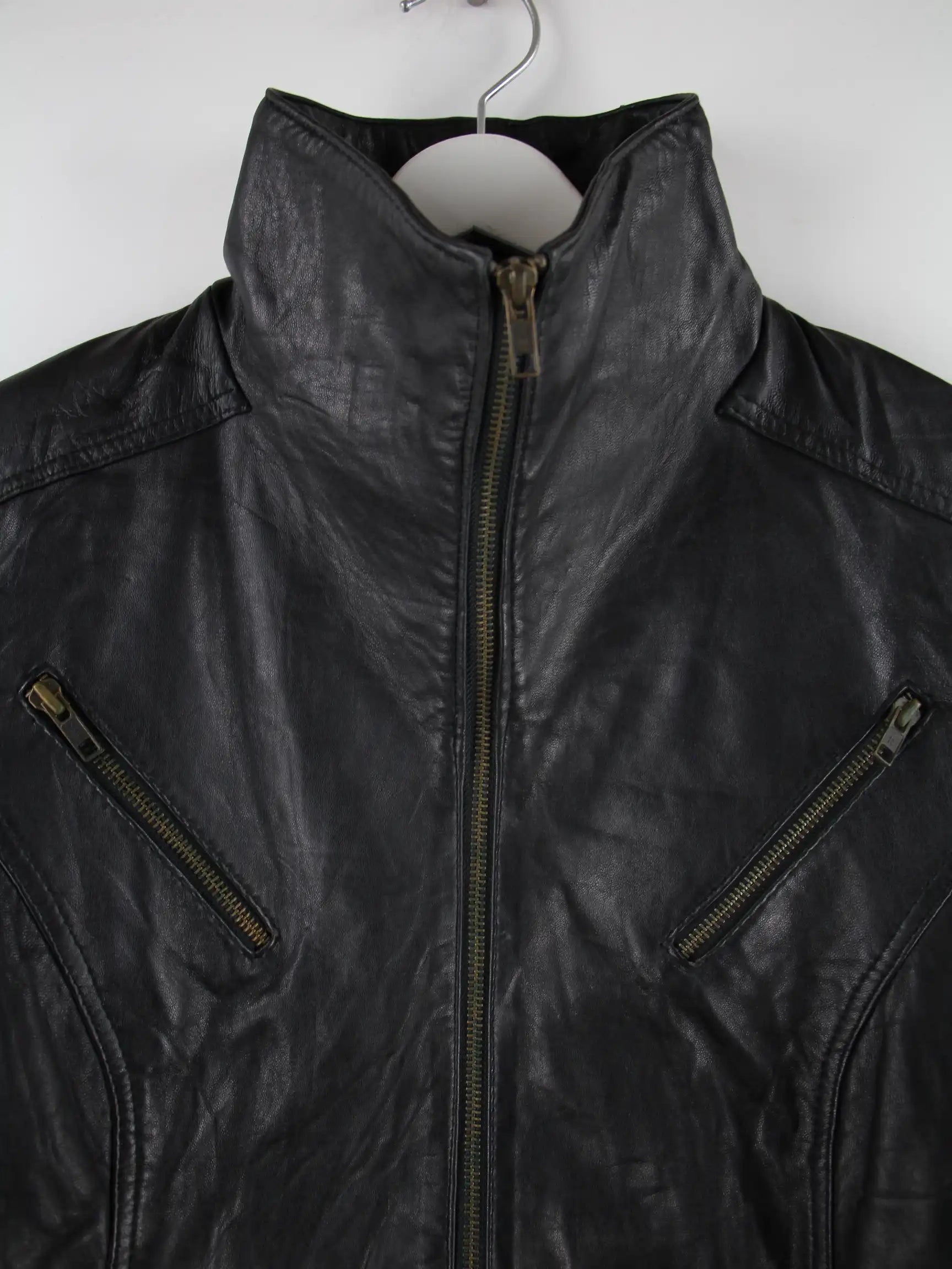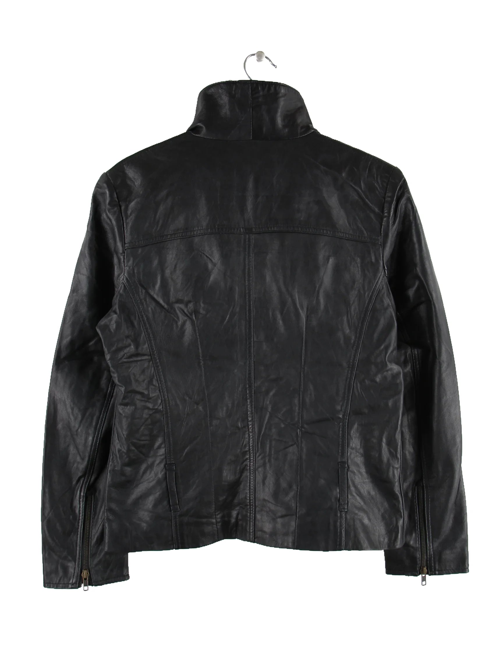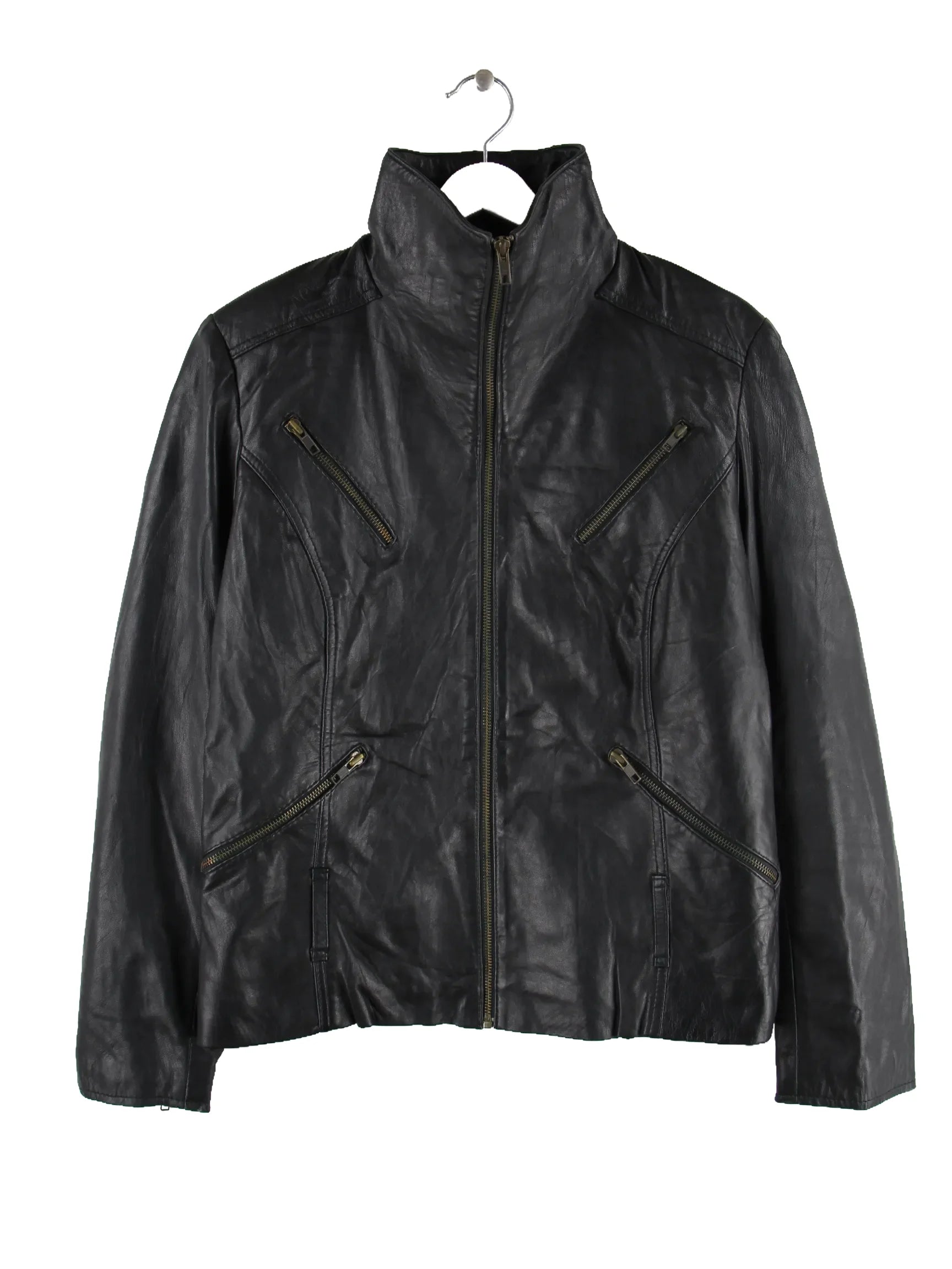 Vintage Jacke in Größe M. Sie ist aus Leder und in Schwarz lieferbar.