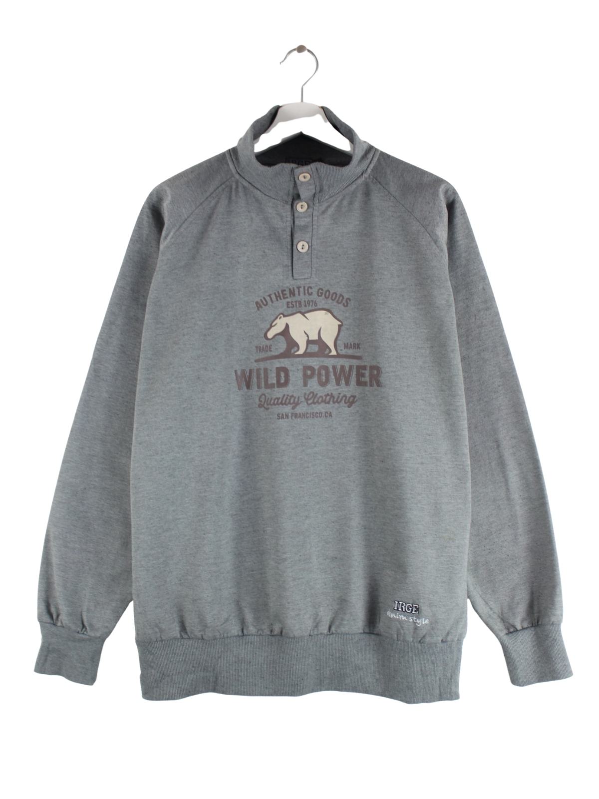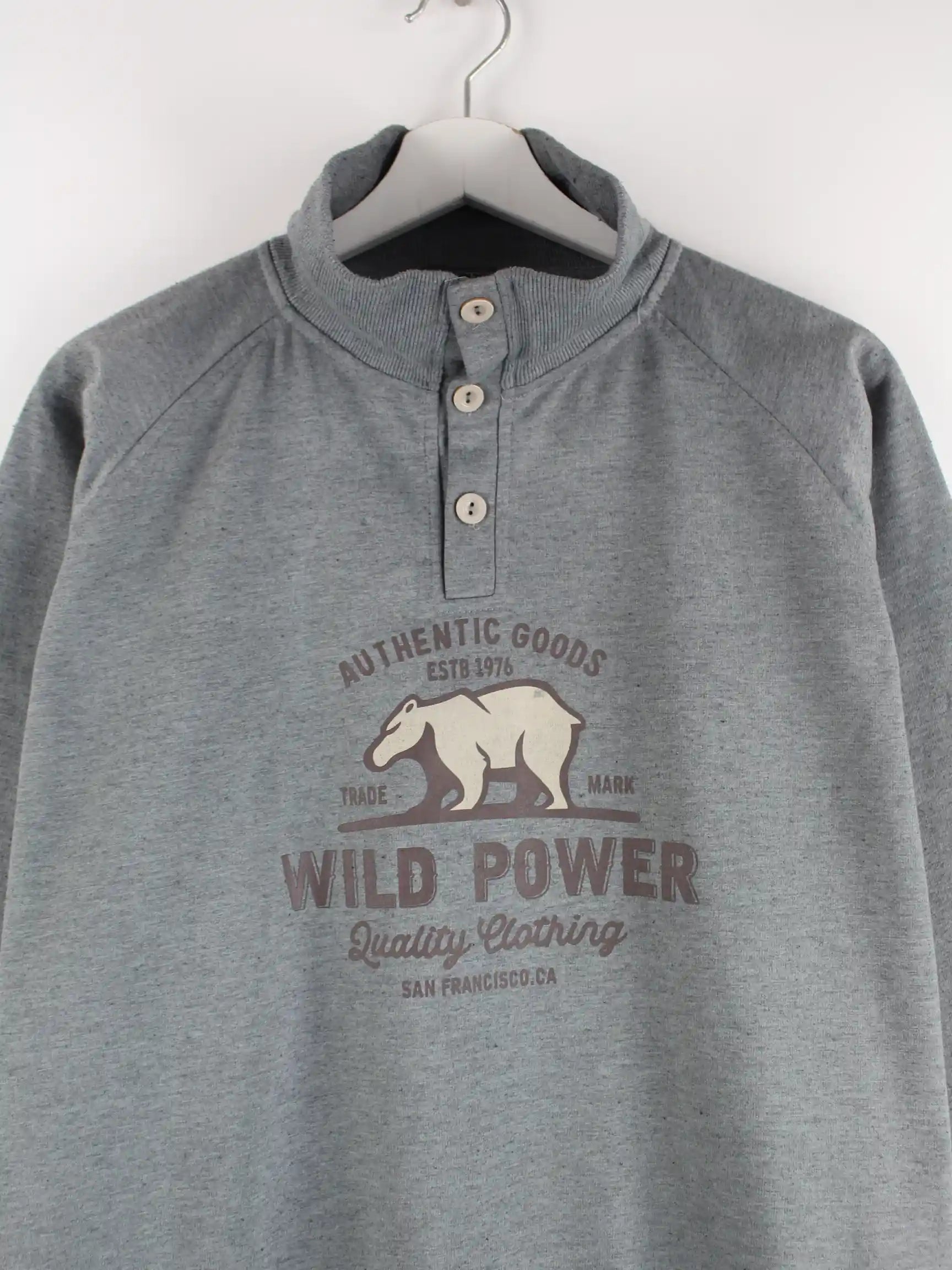 Vintage Sweater in Größe XL. Er ist aus einer Baumwollmischung und in Grau auf Lager. Mit schönem Power Print.