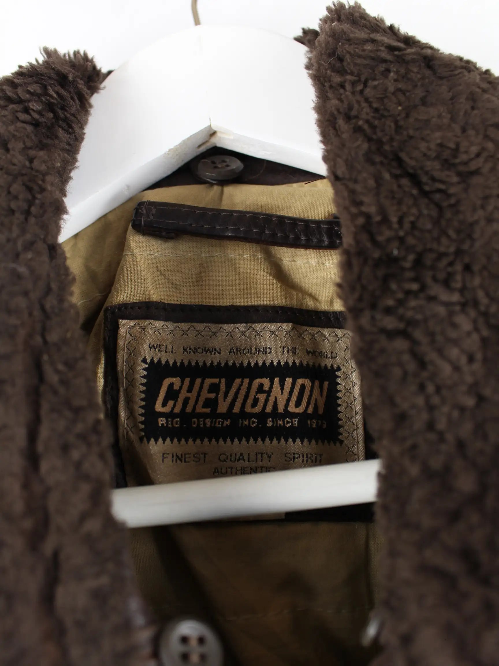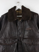 Jacke aus dem Hause Chevignon in Größe L aus den 90'ern. Sie ist aus Leder gemacht und in Braun lieferbar.