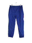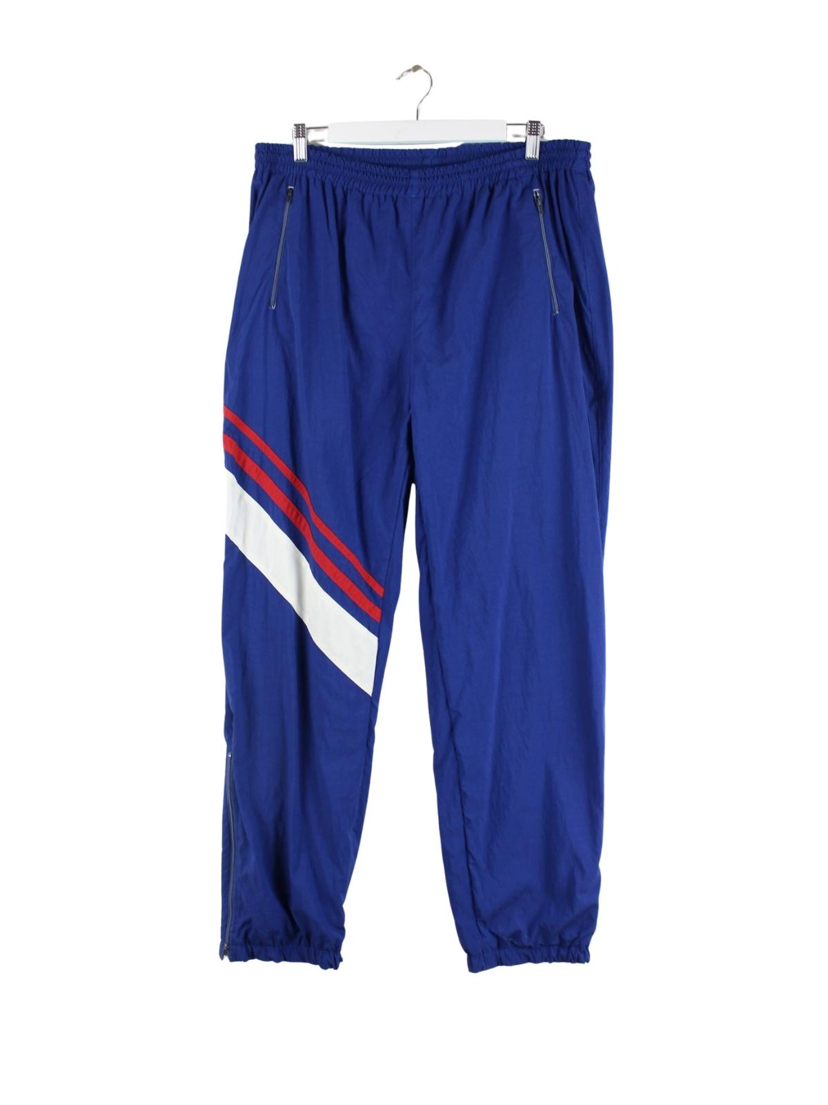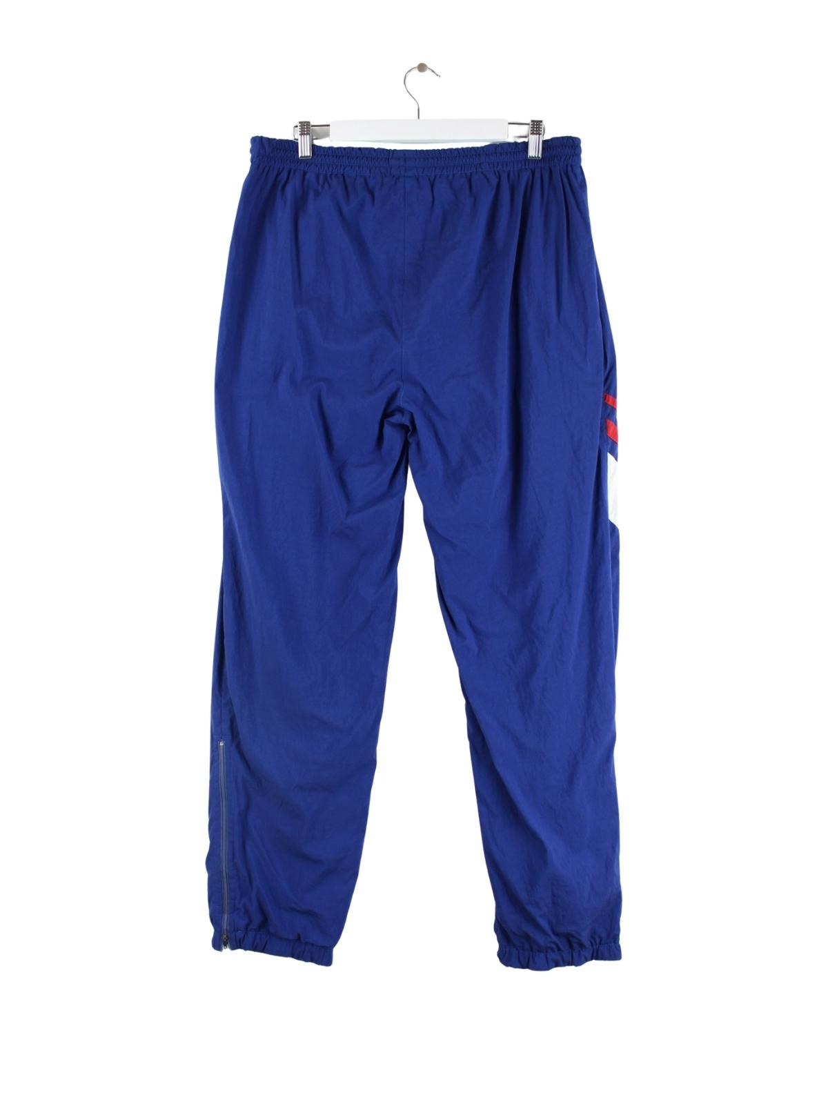 Blaue Vintage Track Pants aus den 90'ern in Größe L. Sie sind aus Synthetik gefertigt und in sehr gutem Zustand bei uns vorrätig.