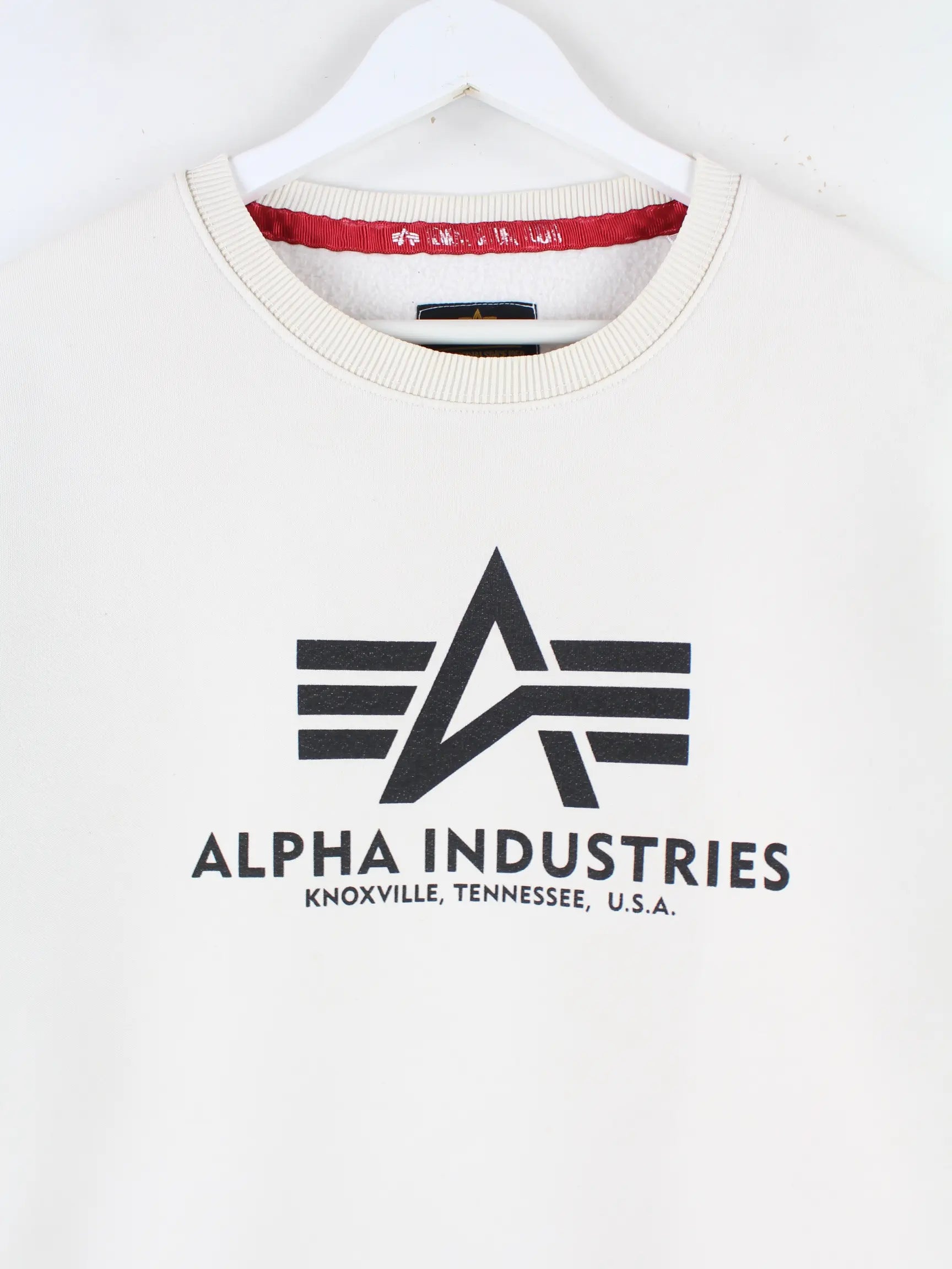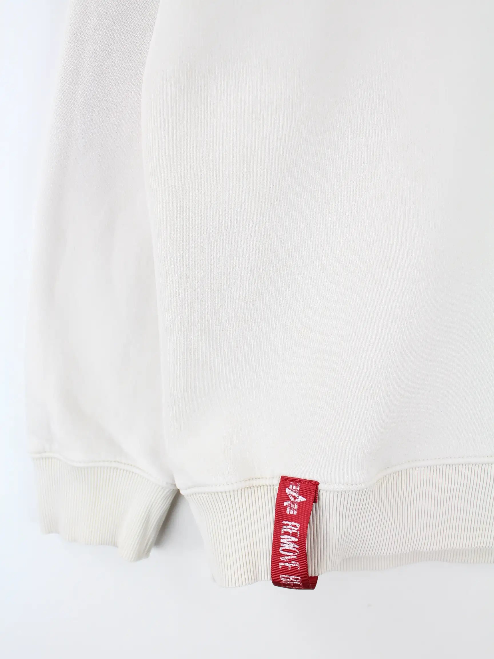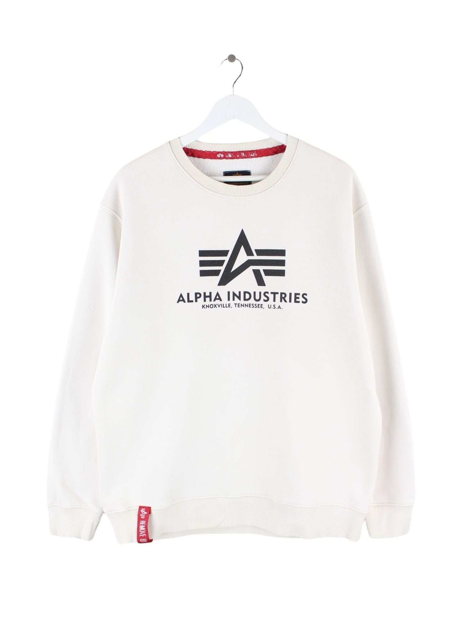 Weißer Sweater vom Label Alpha Industries in Größe XL. Er ist aus einer Baumwollmischung hergestellt und in gutem Zustand im Angebot. Mit tollem Print.