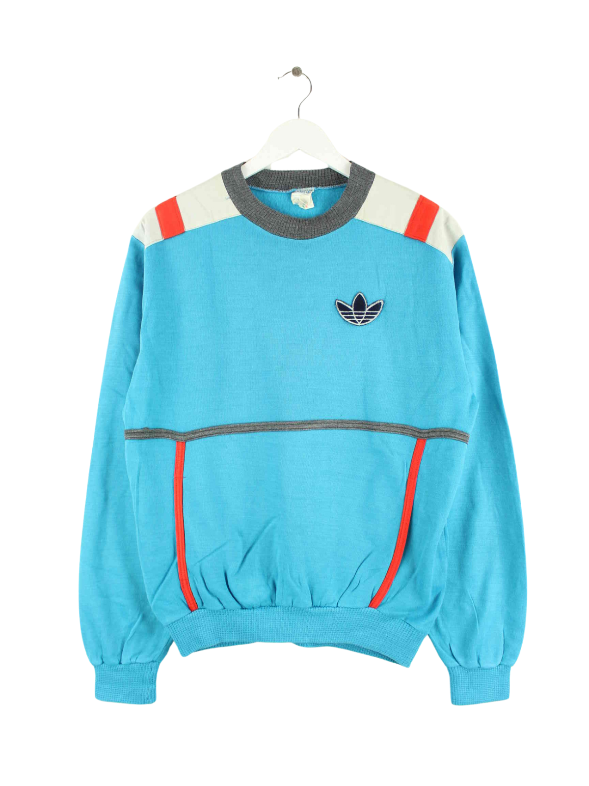 Sweater des Labels Adidas mit gesticktem Logo in Größe M. Er ist aus einer Baumwollmischung und in Blau vorrätig.