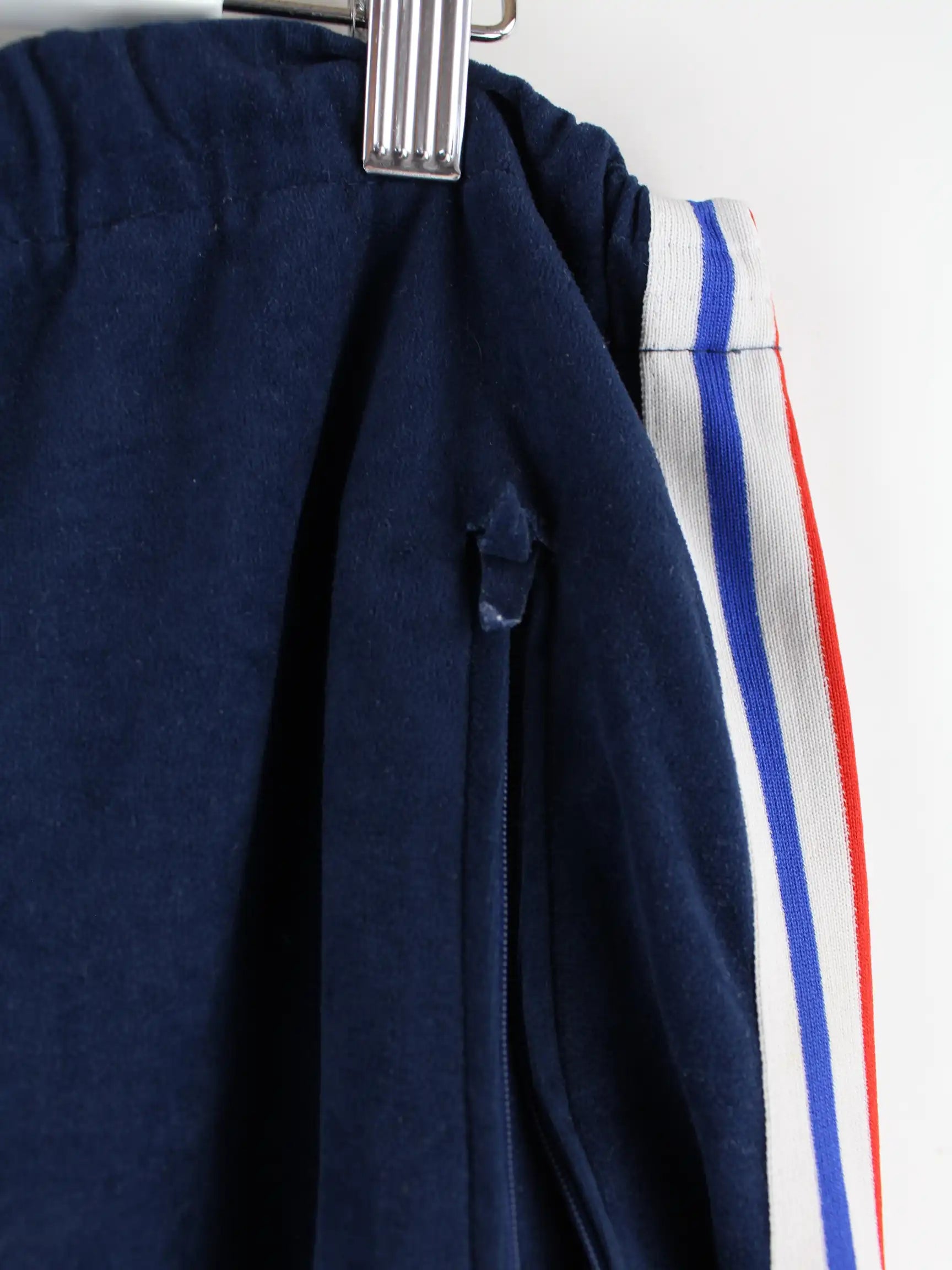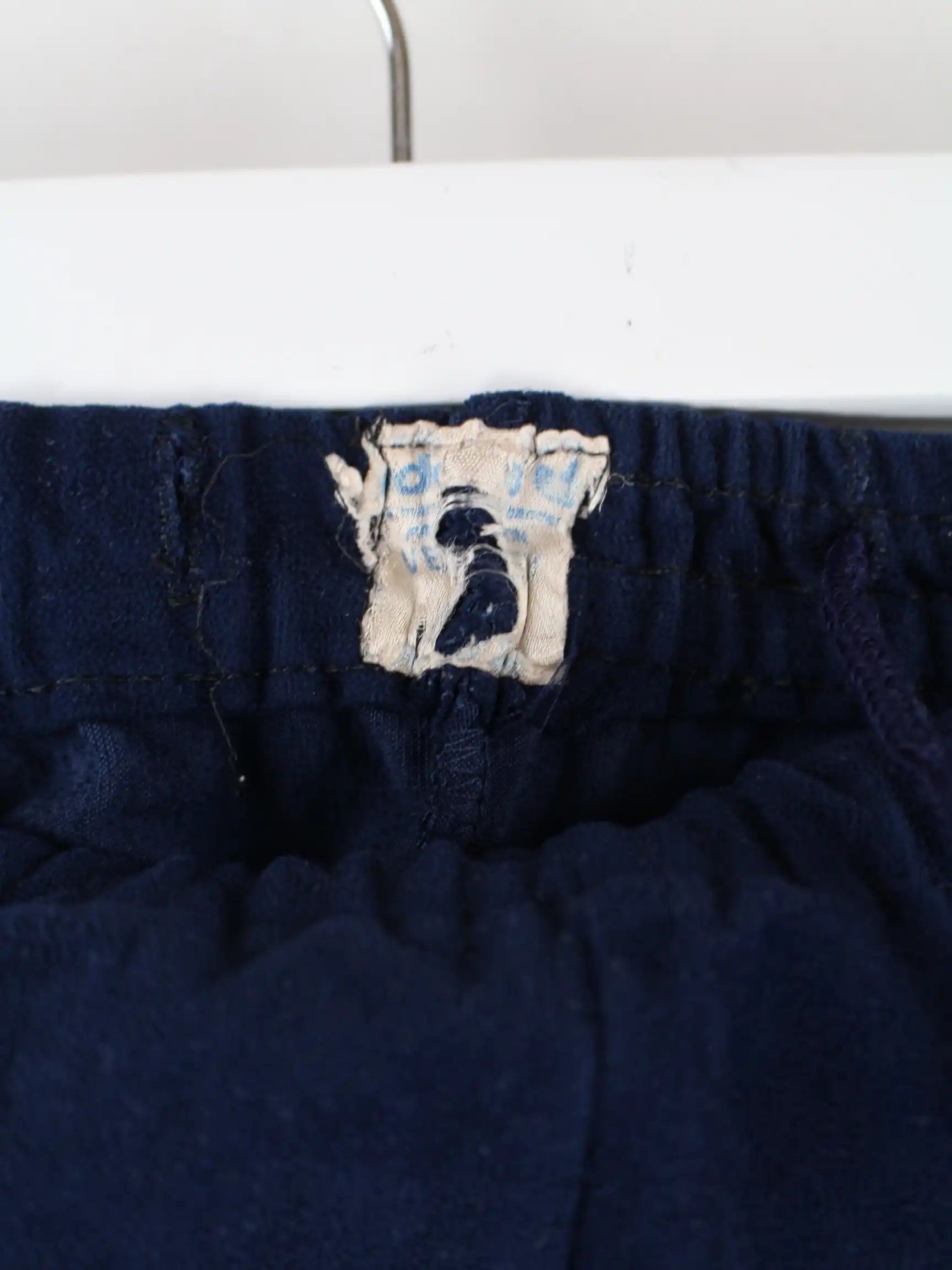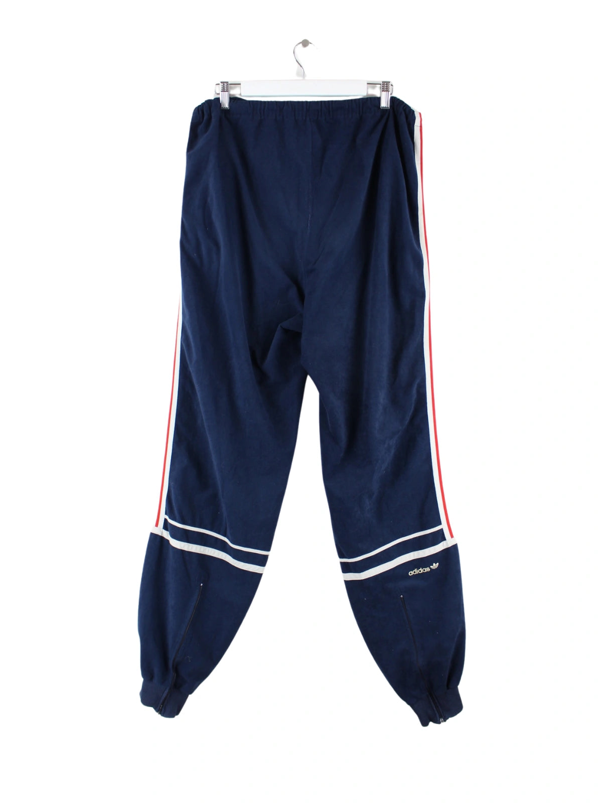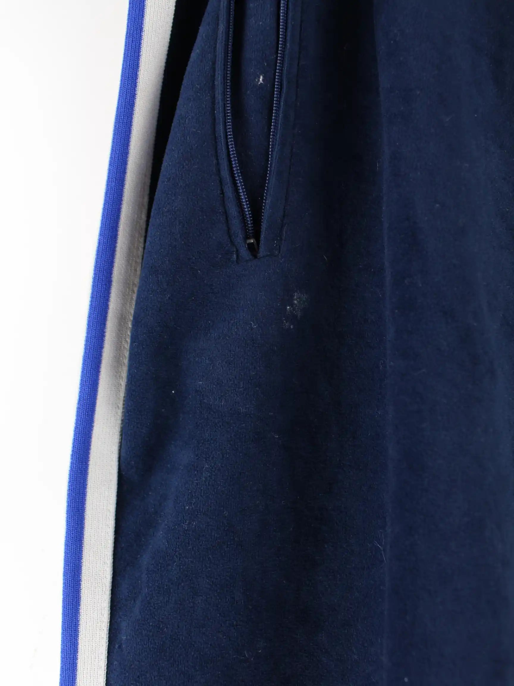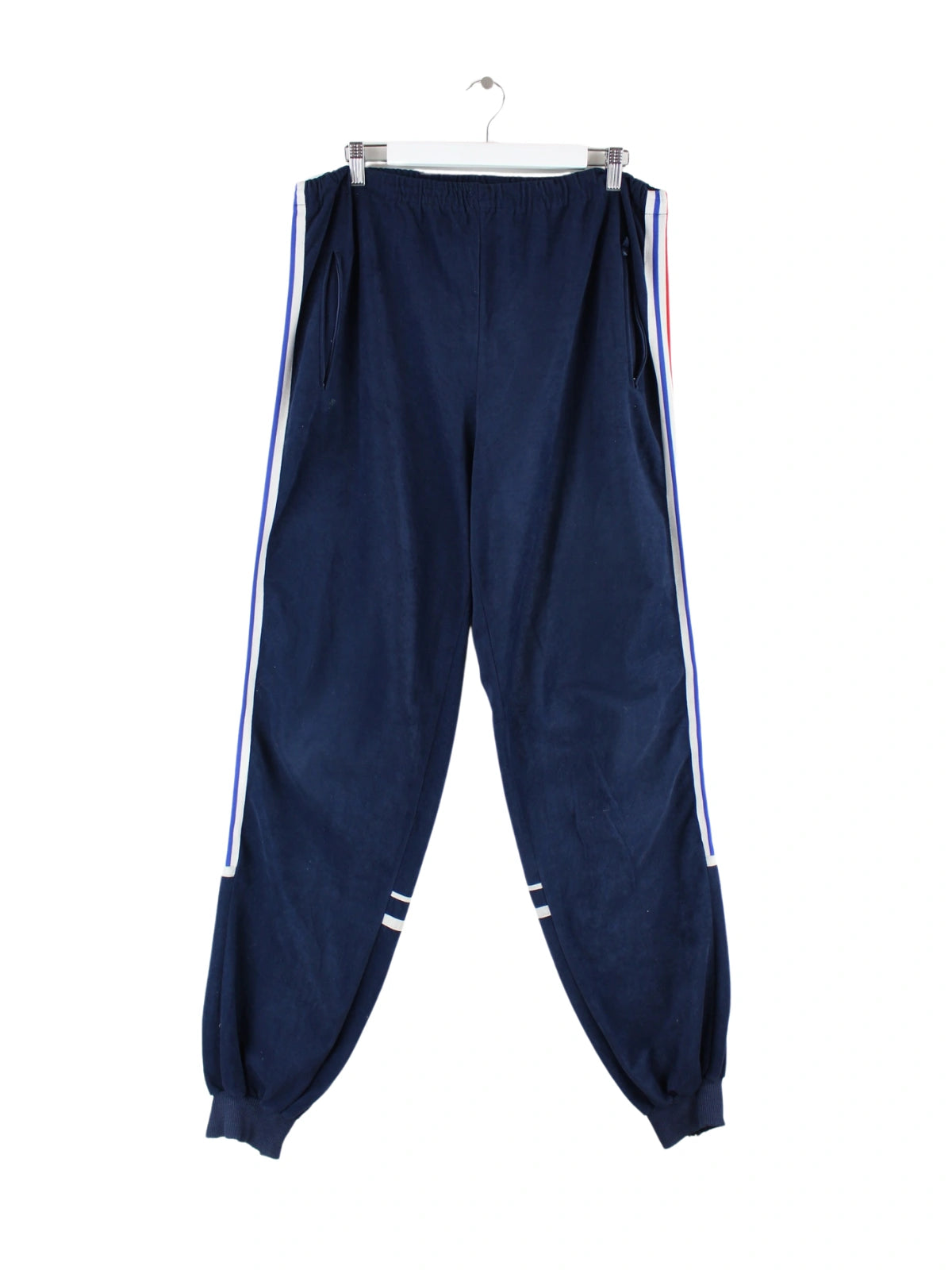 Track Pants aus dem Hause Adidas in Größe XL aus den 70'ern. Sie sind aus Synthetik angefertigt und in Blau bei uns zu bekommen.
