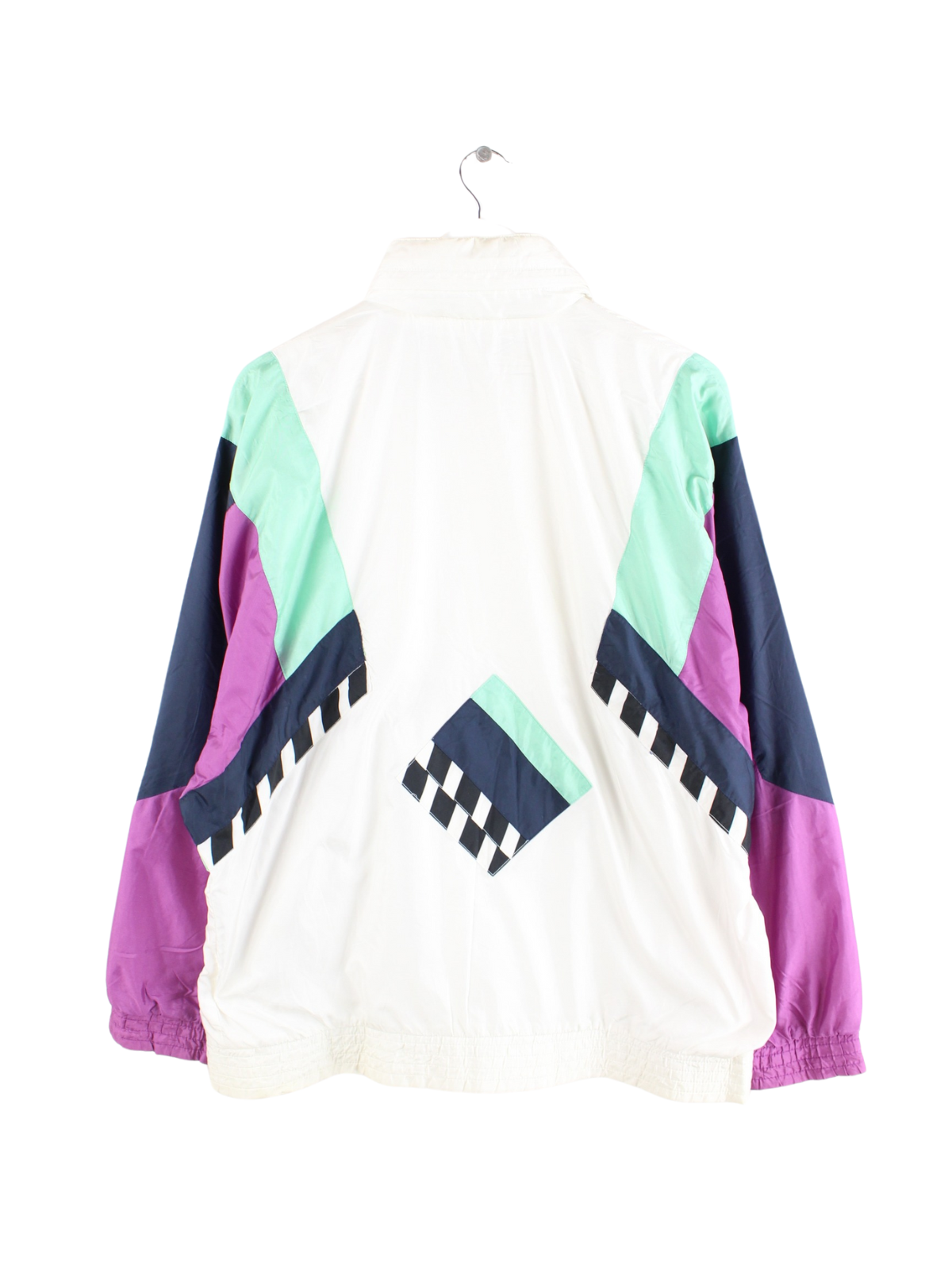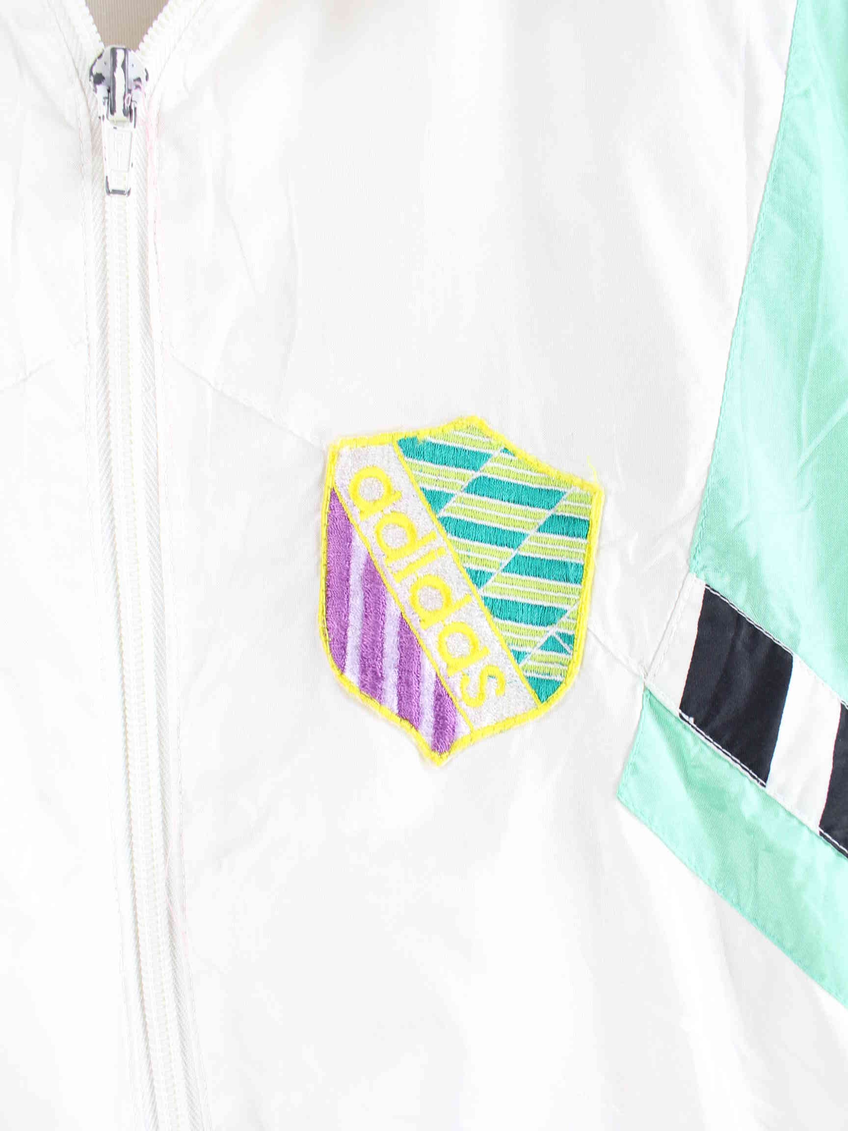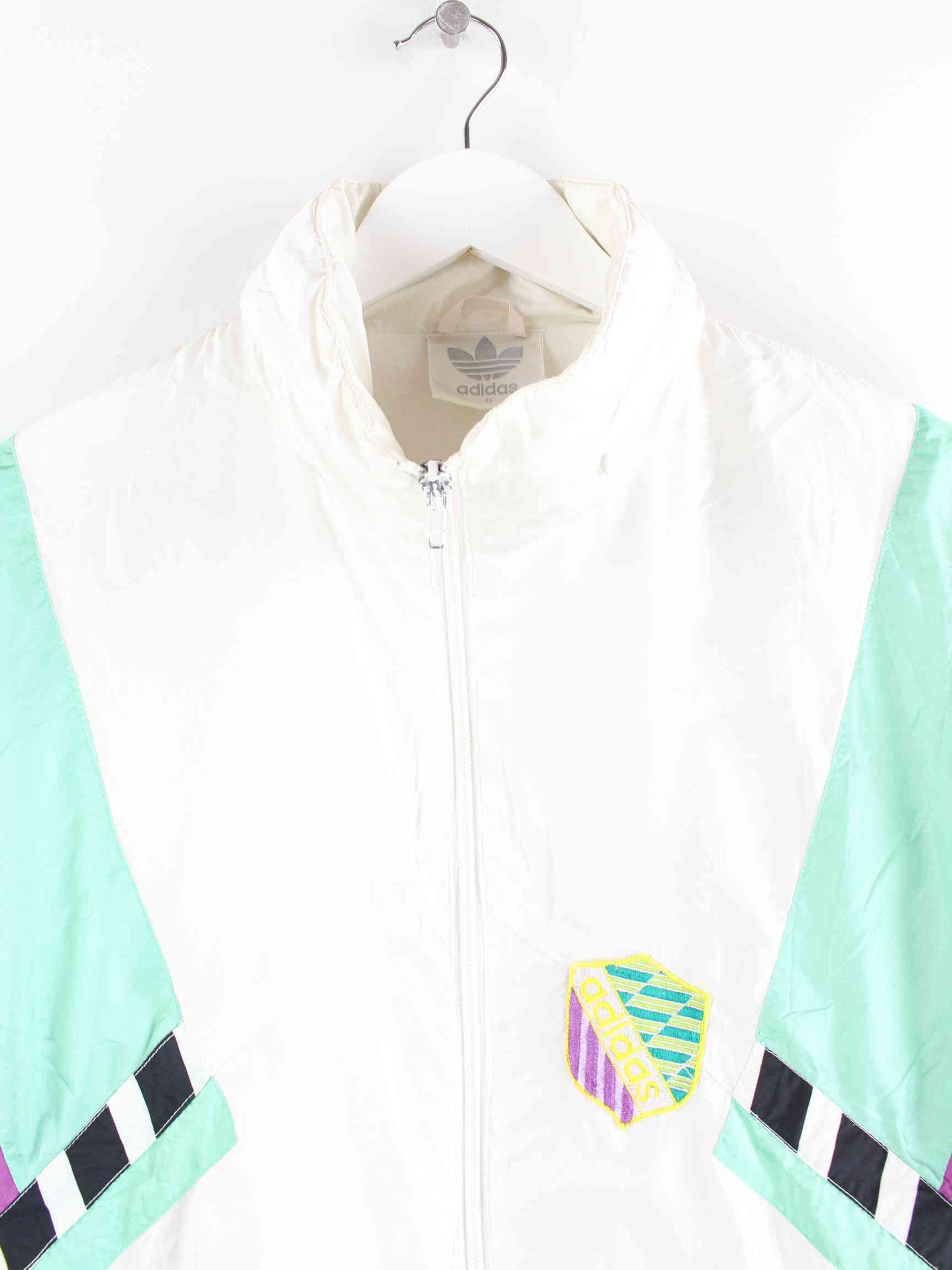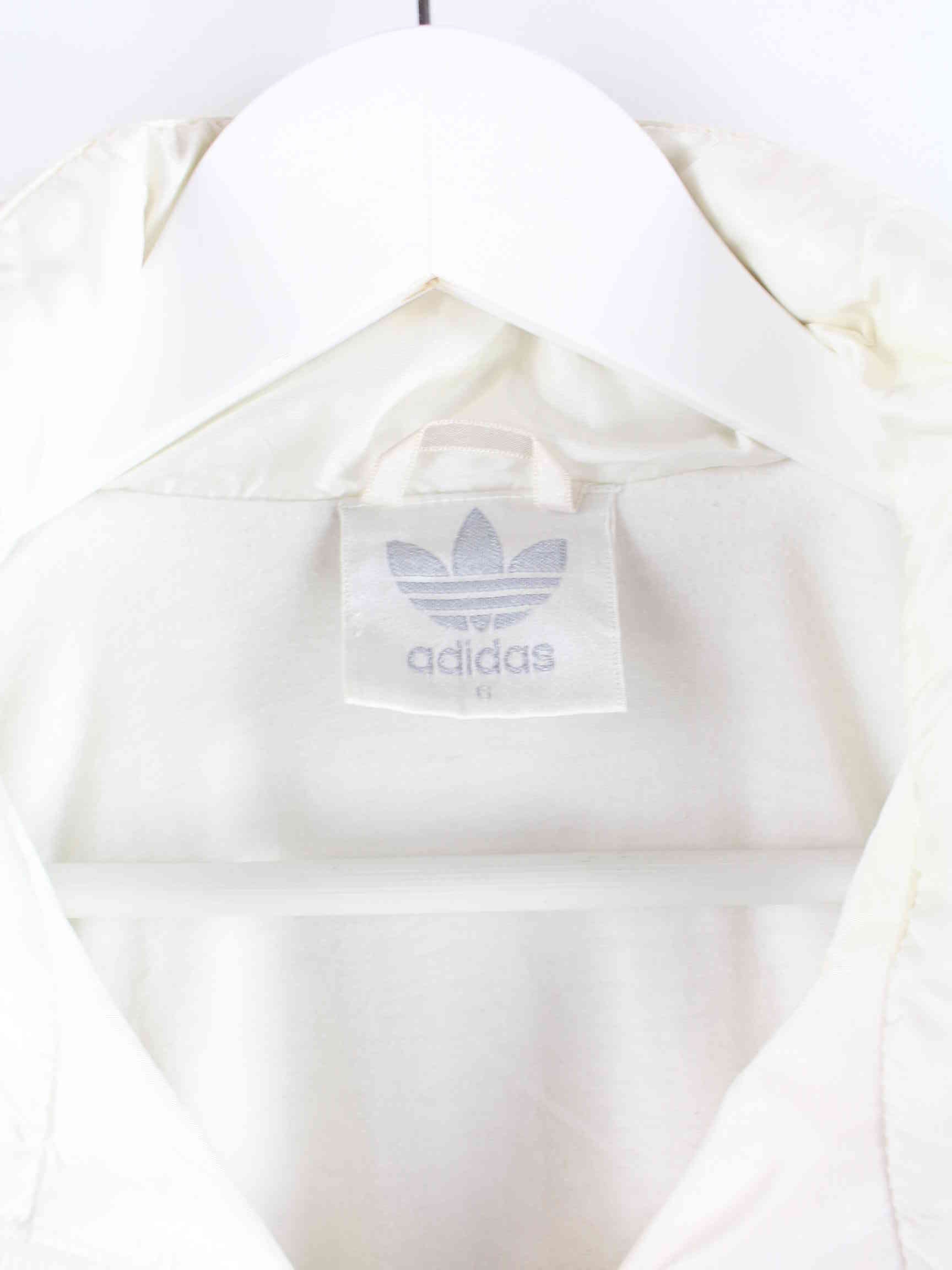 Trainingsjacke der Brand Adidas in Größe XL aus den 80'ern. Sie ist aus Synthetik angefertigt und in Weiß zu haben.