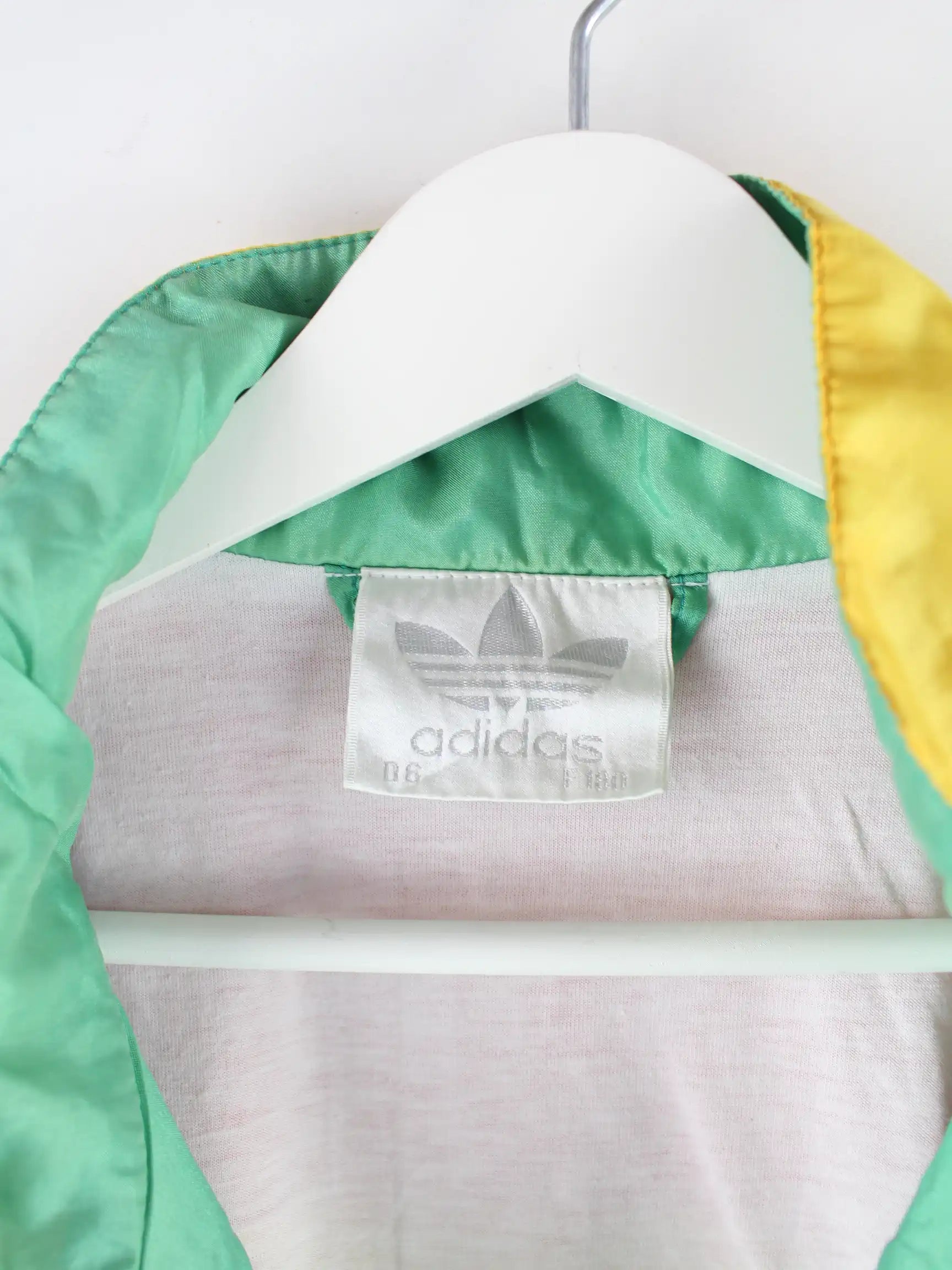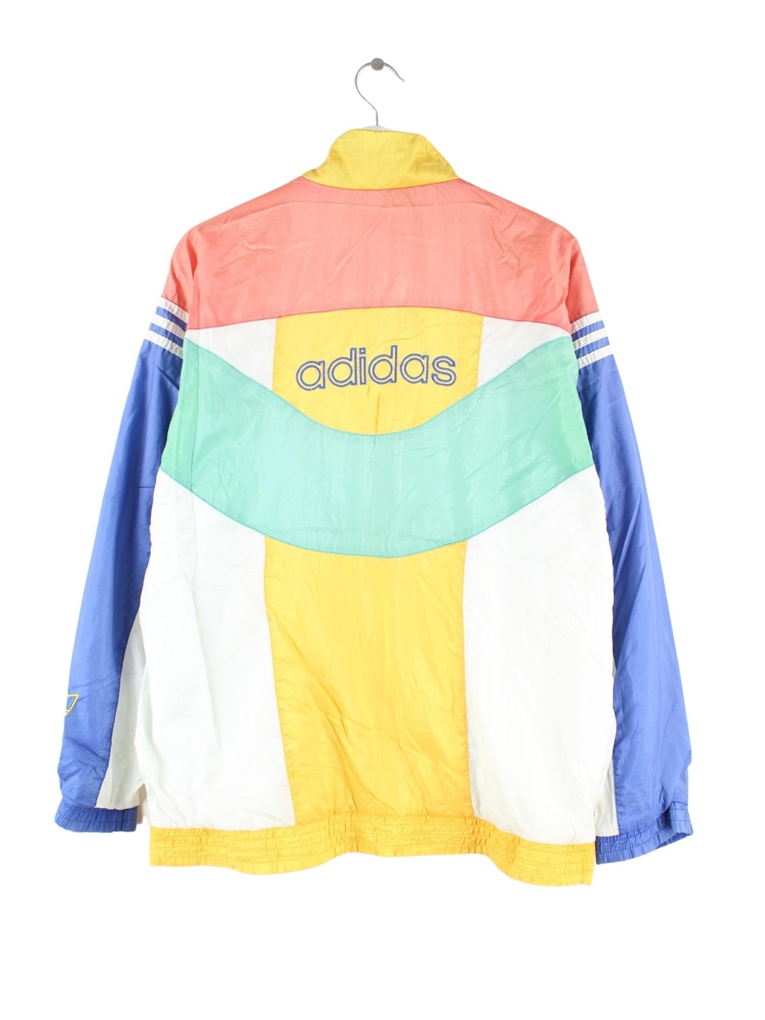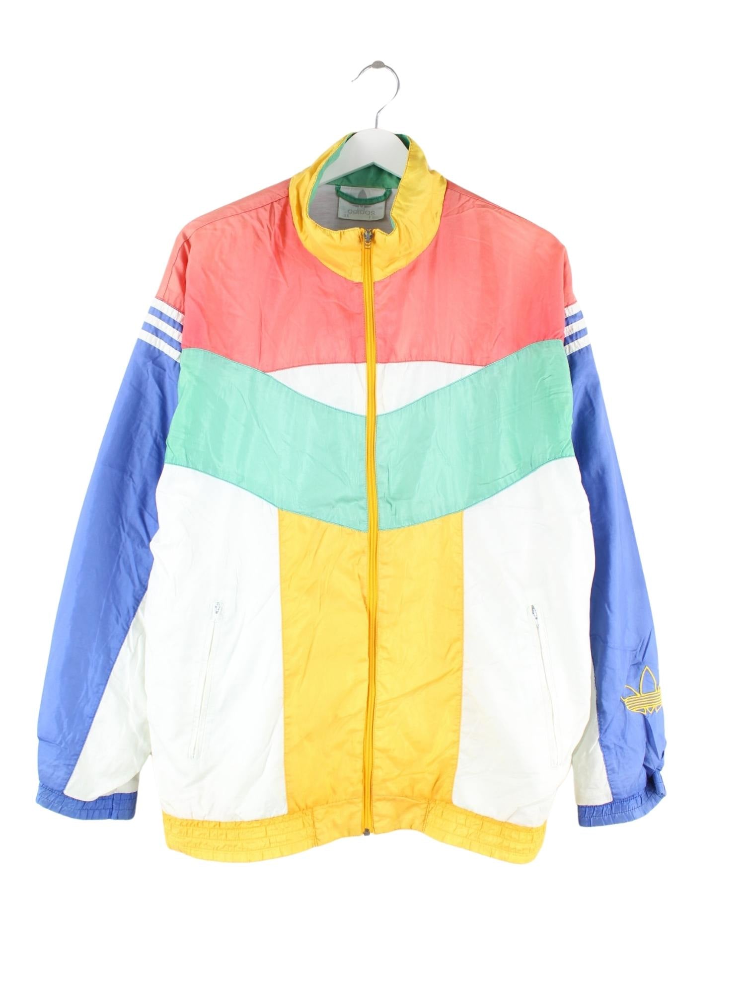 Mehrfarbige Trainingsjacke mit Stick des Labels Adidas aus den 80'ern in Größe L. Sie ist aus Synthetik produziert und in sehr gutem Zustand auf Lager.