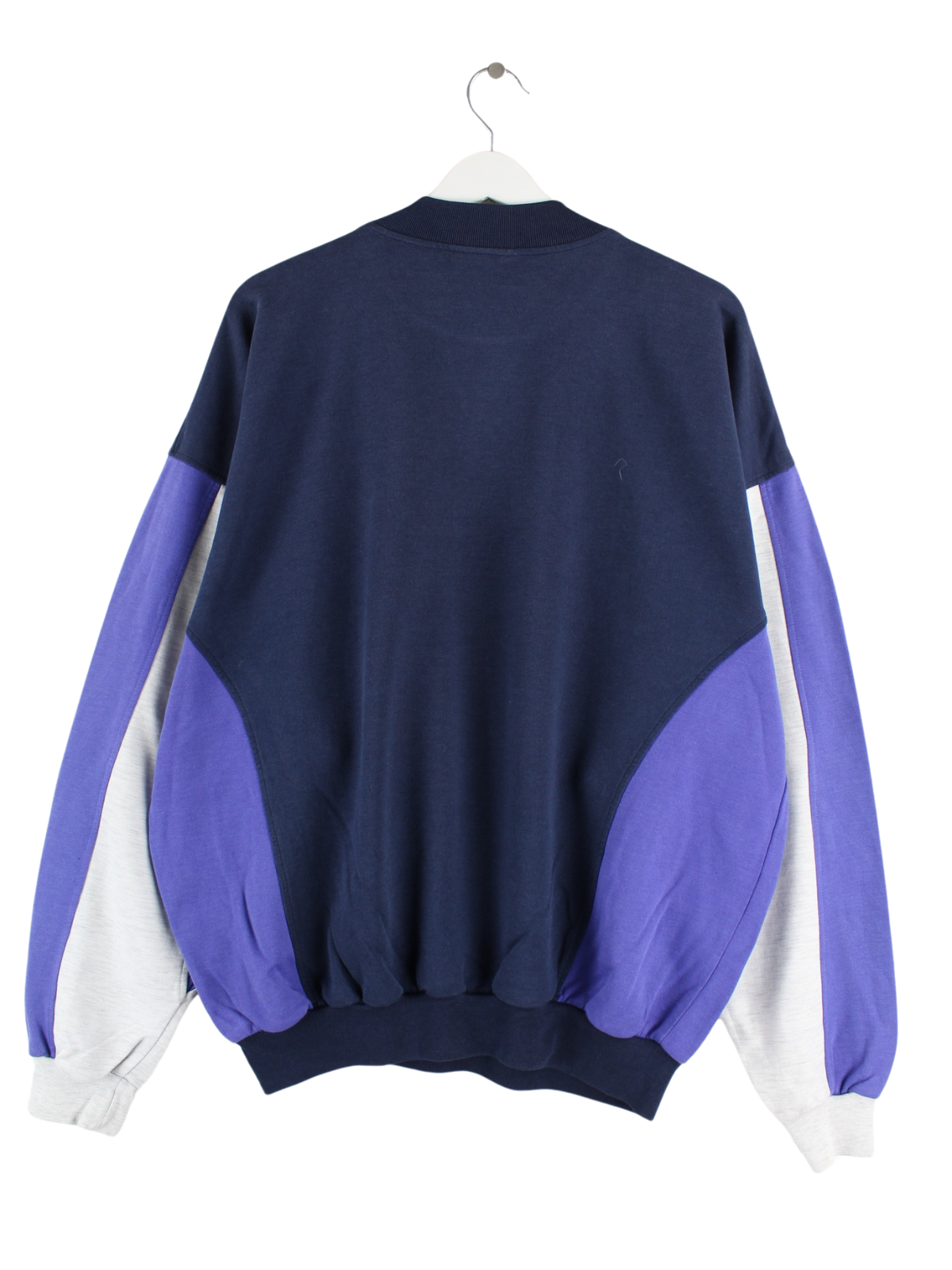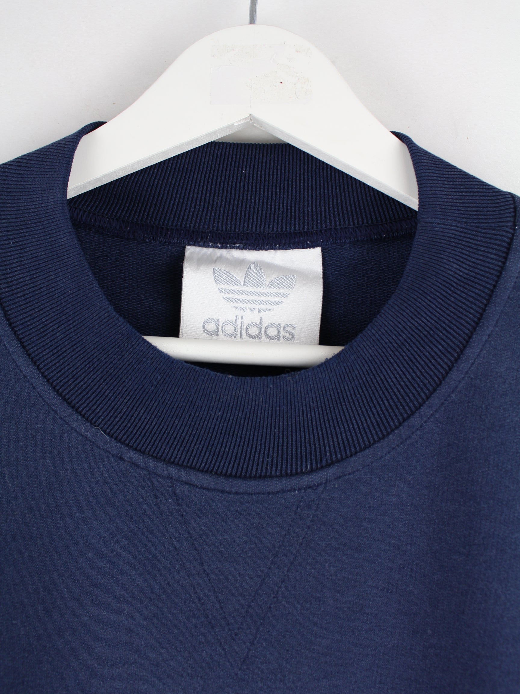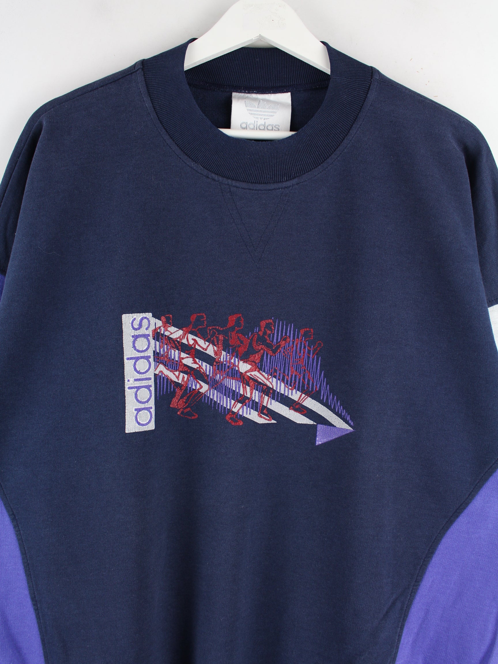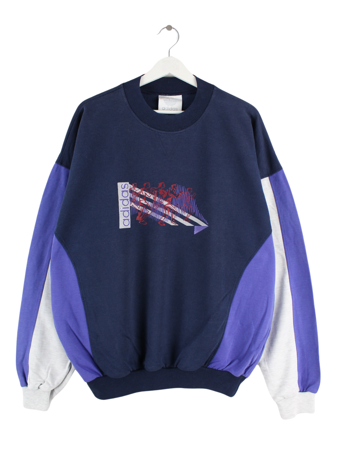 Blauer Sweater aus dem Hause Adidas aus den 80'ern in Größe XL. Er ist aus einer Baumwollmischung hergestellt und in sehr gutem Zustand in Stock. Mit schickem Vintage Print.