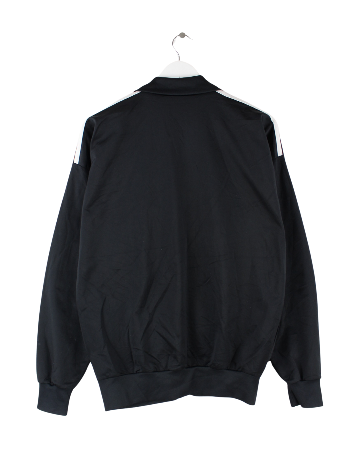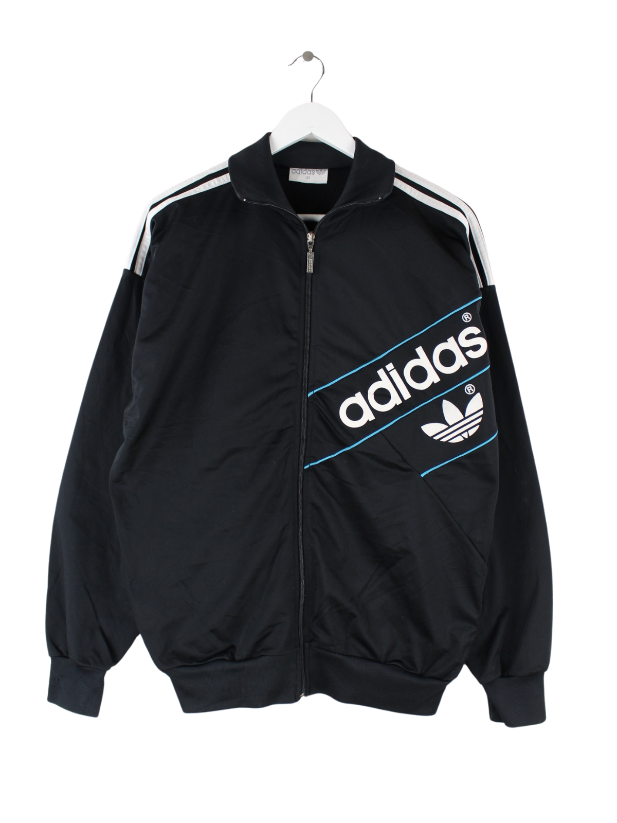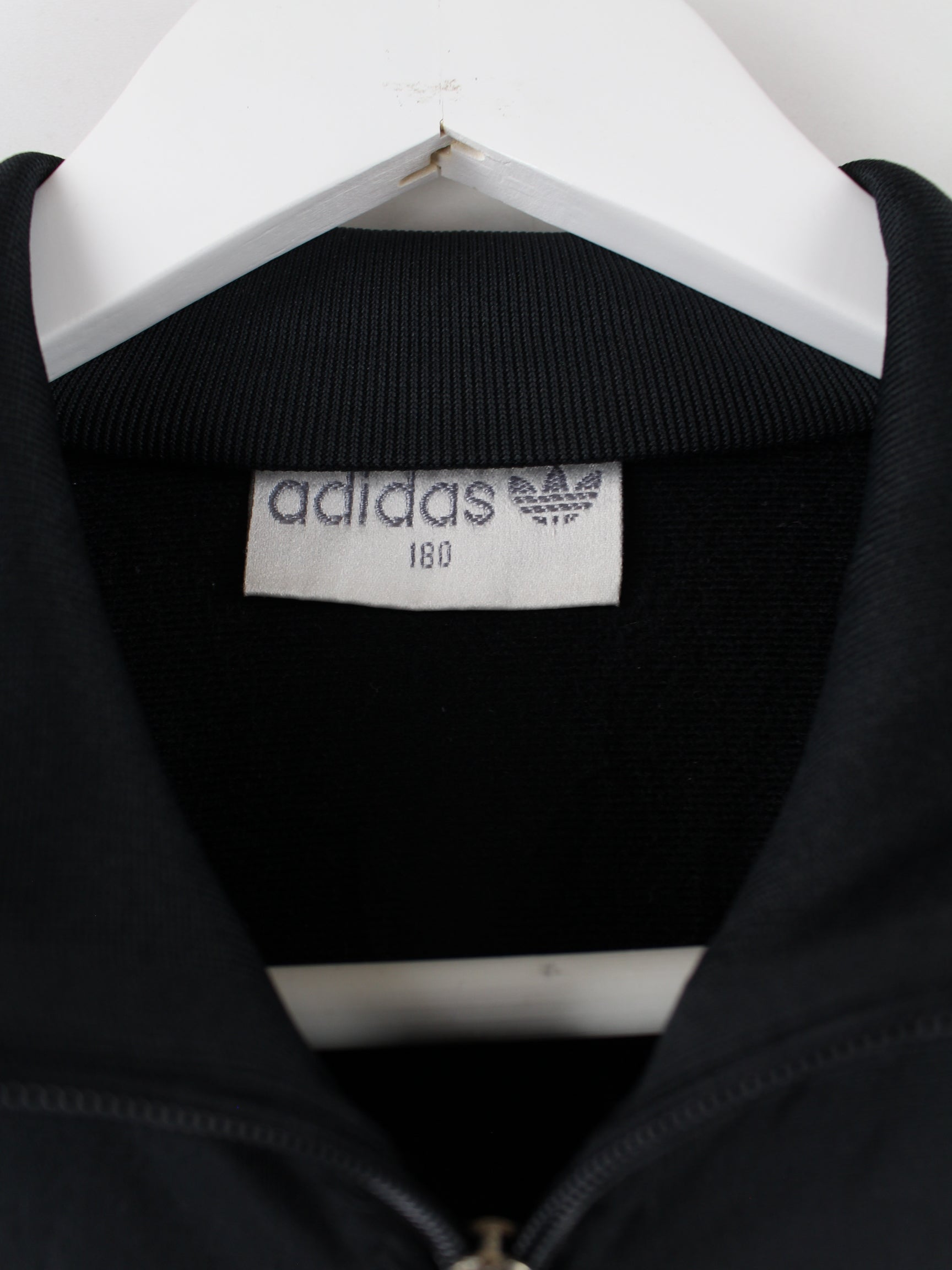 Schwarze Trainingsjacke vom Brand Adidas aus den 80'ern in Größe S. Sie ist aus Synthetik gefertigt und in gutem Zustand im Angebot. Mit tollem Vintage Print.