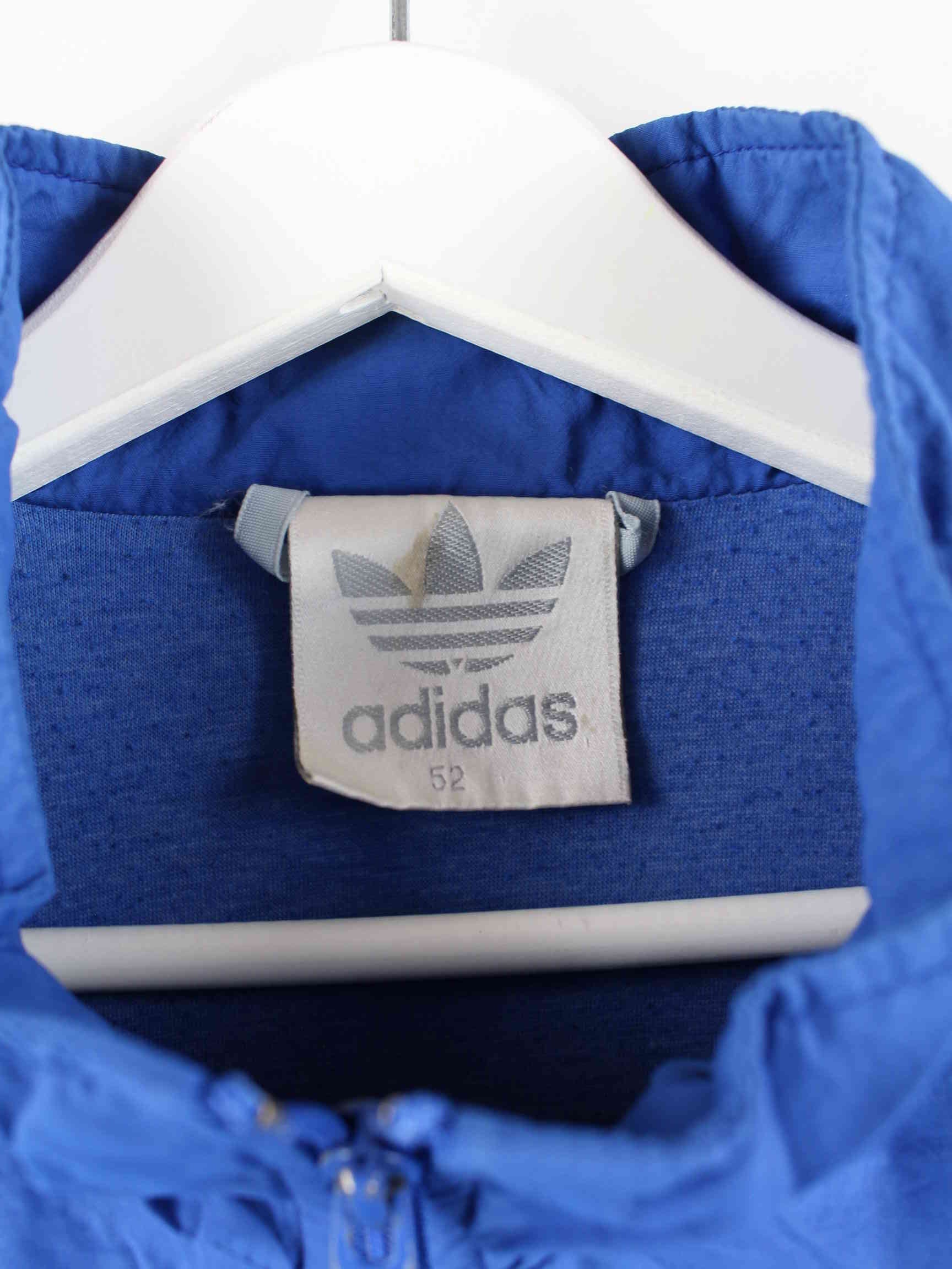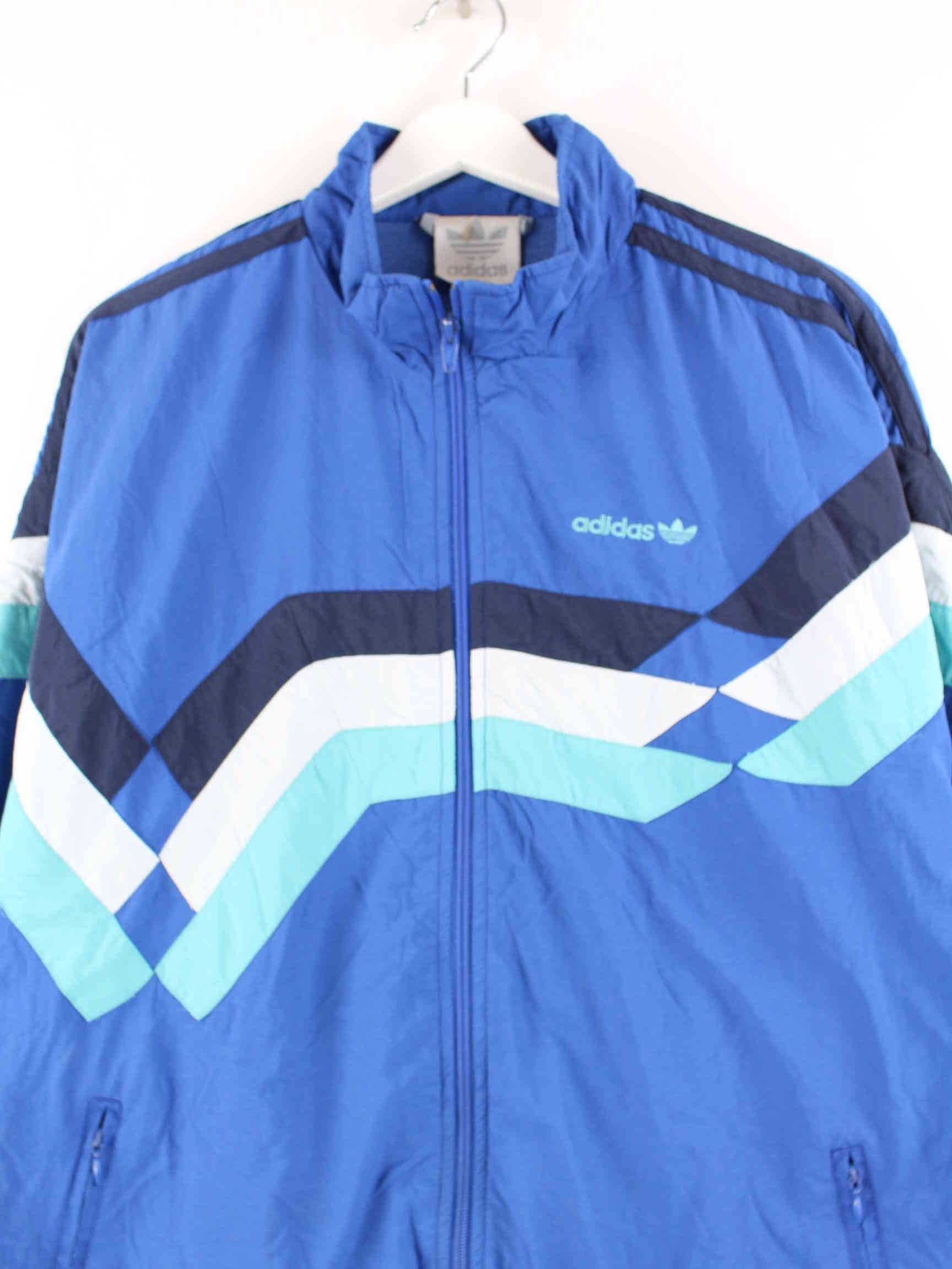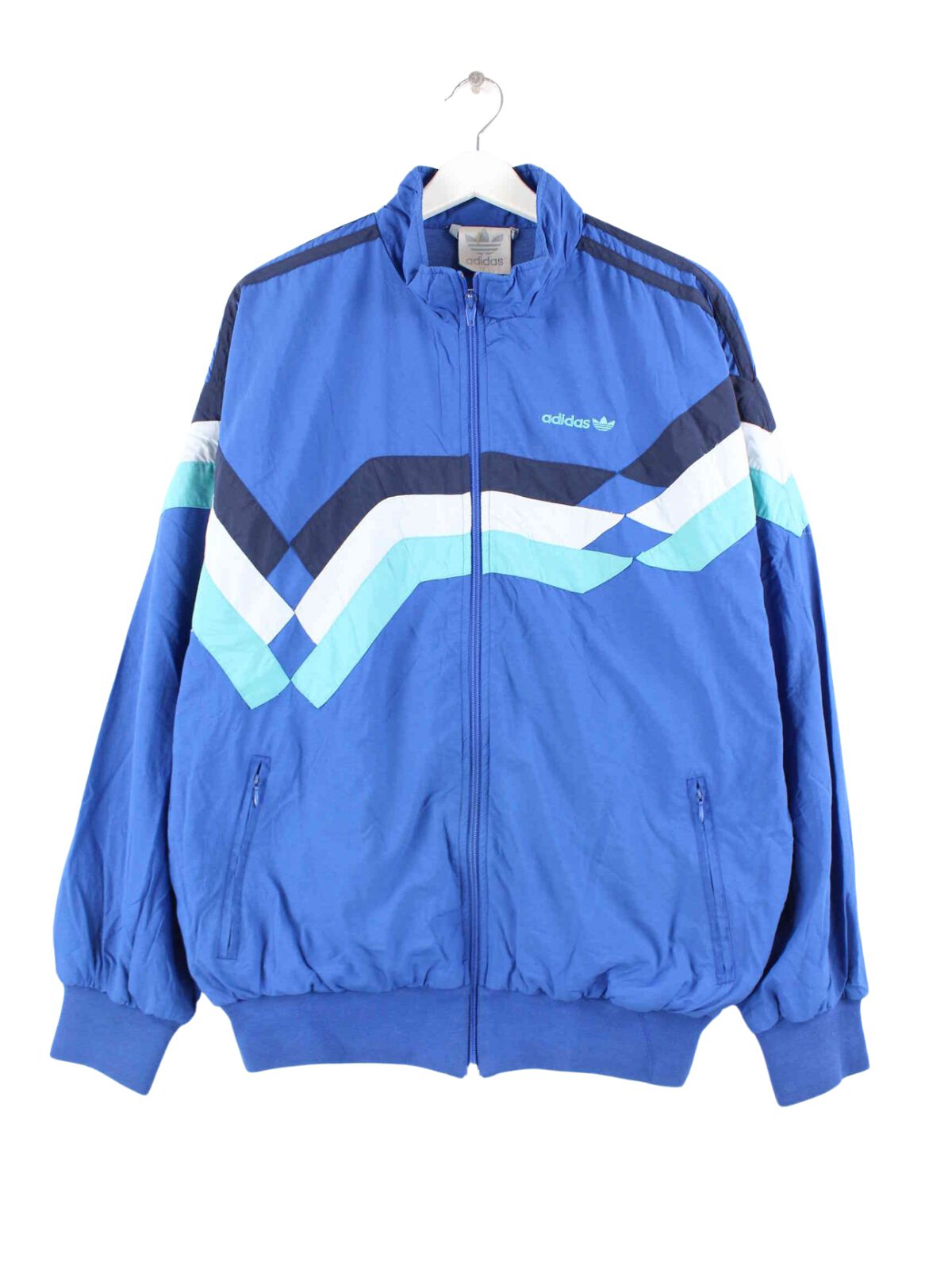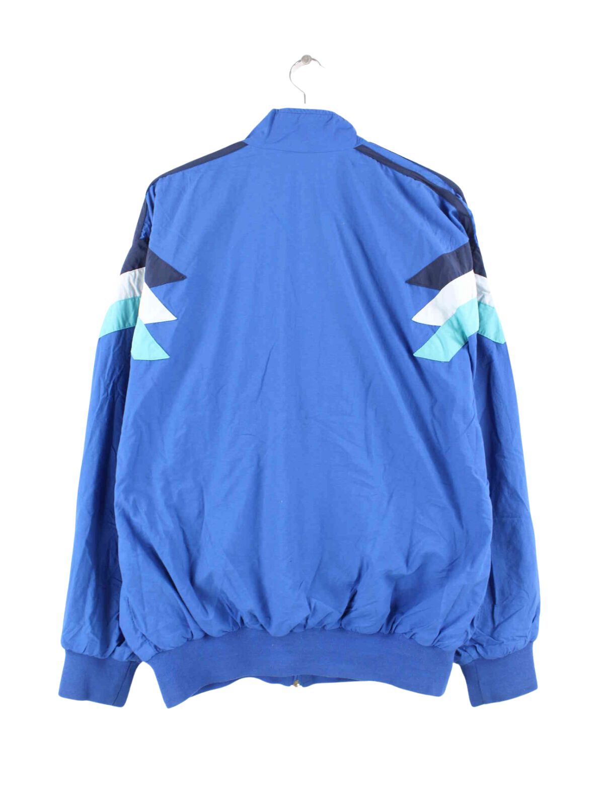 Blaue Trainingsjacke der Brand Adidas aus den 80'ern in Größe L. Sie ist aus Synthetik angefertigt und in sehr gutem Zustand zu bekommen.