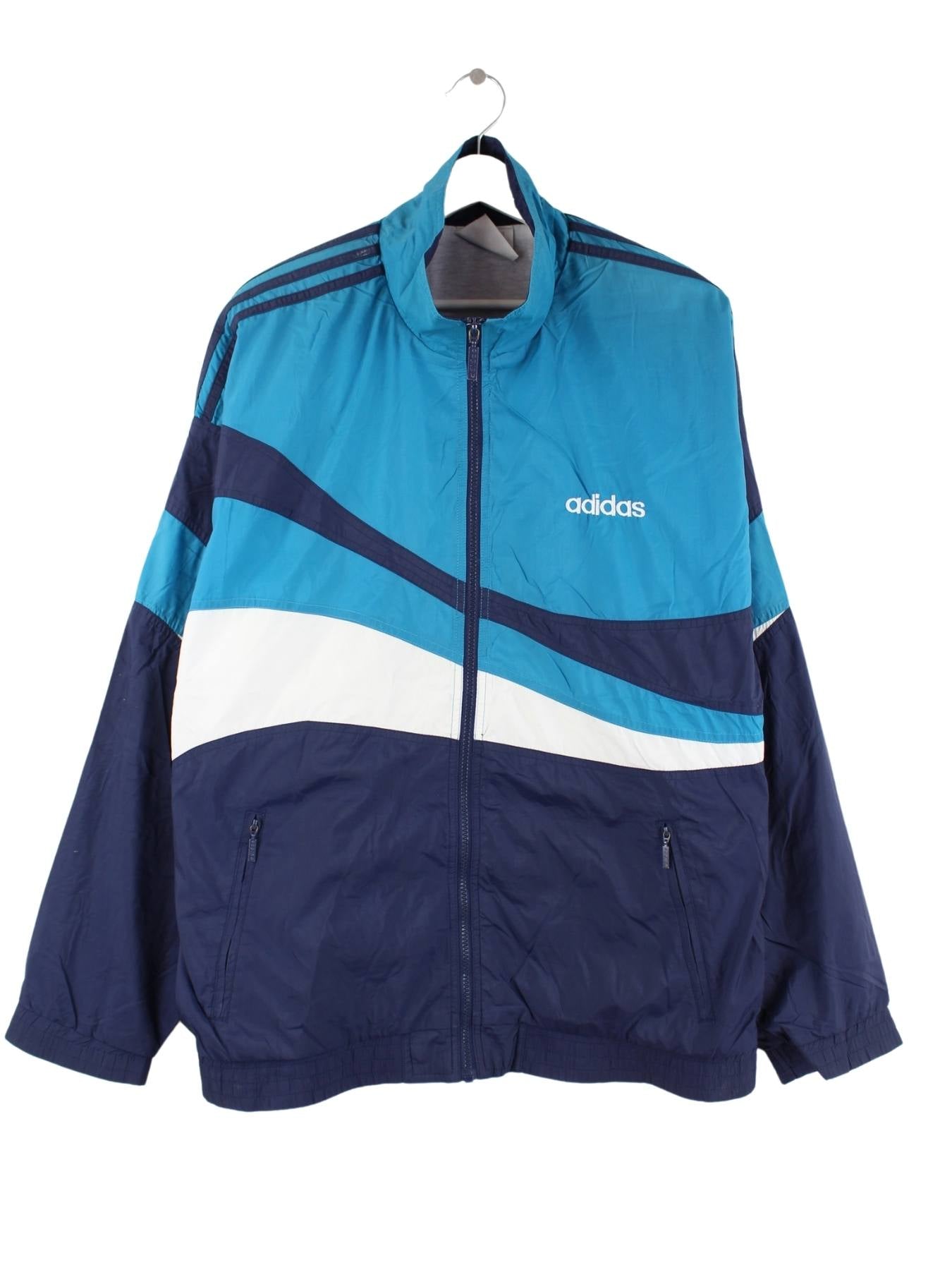 Trainingsjacke der Brand Adidas in Größe XXL aus den 80'ern. Sie ist aus Synthetik gefertigt und in Blau bei uns zu bekommen.