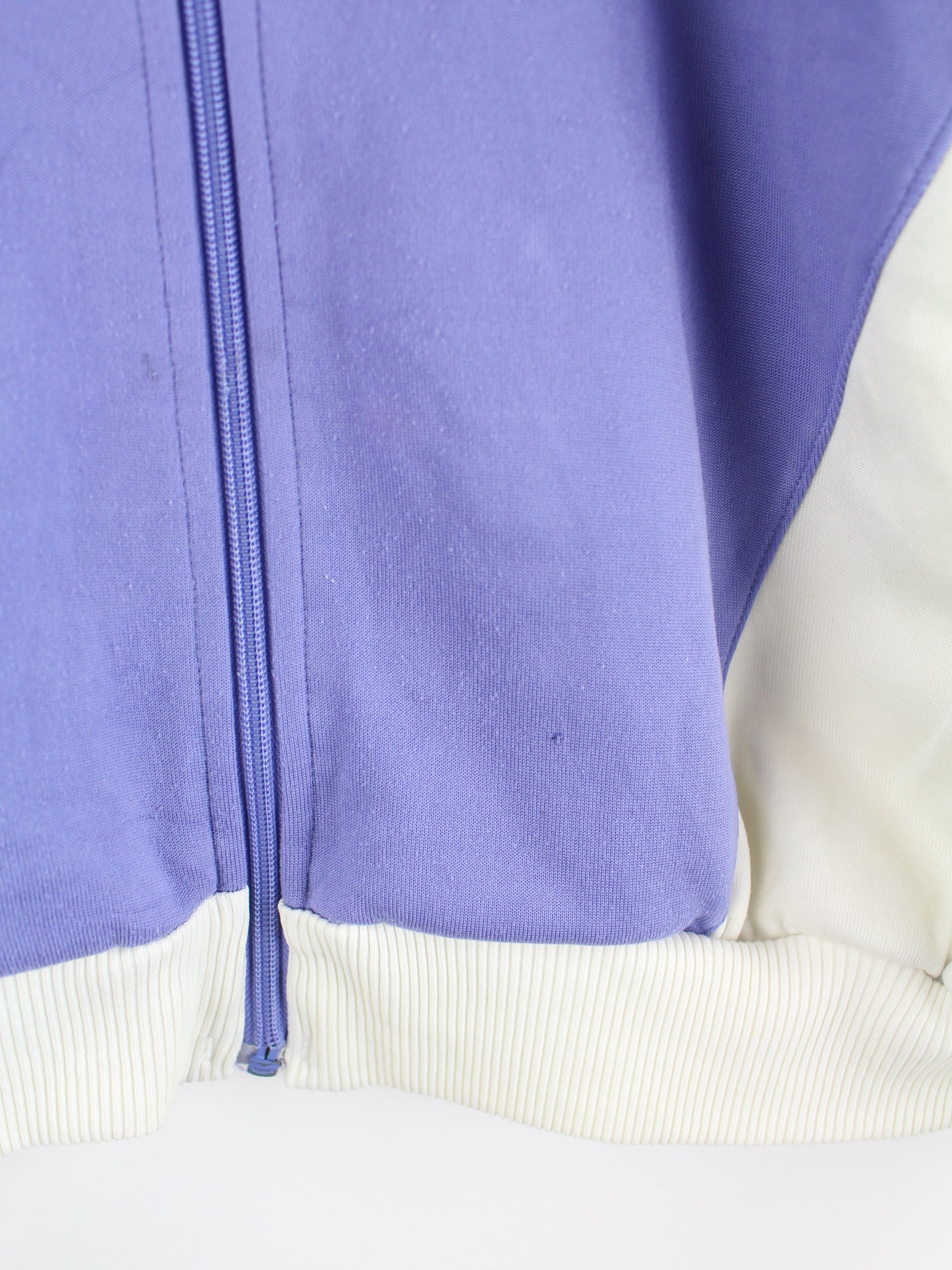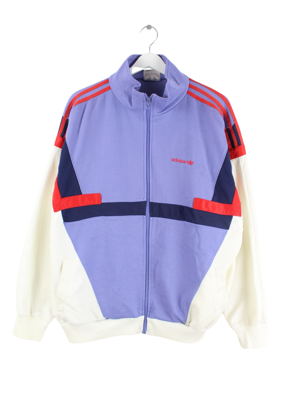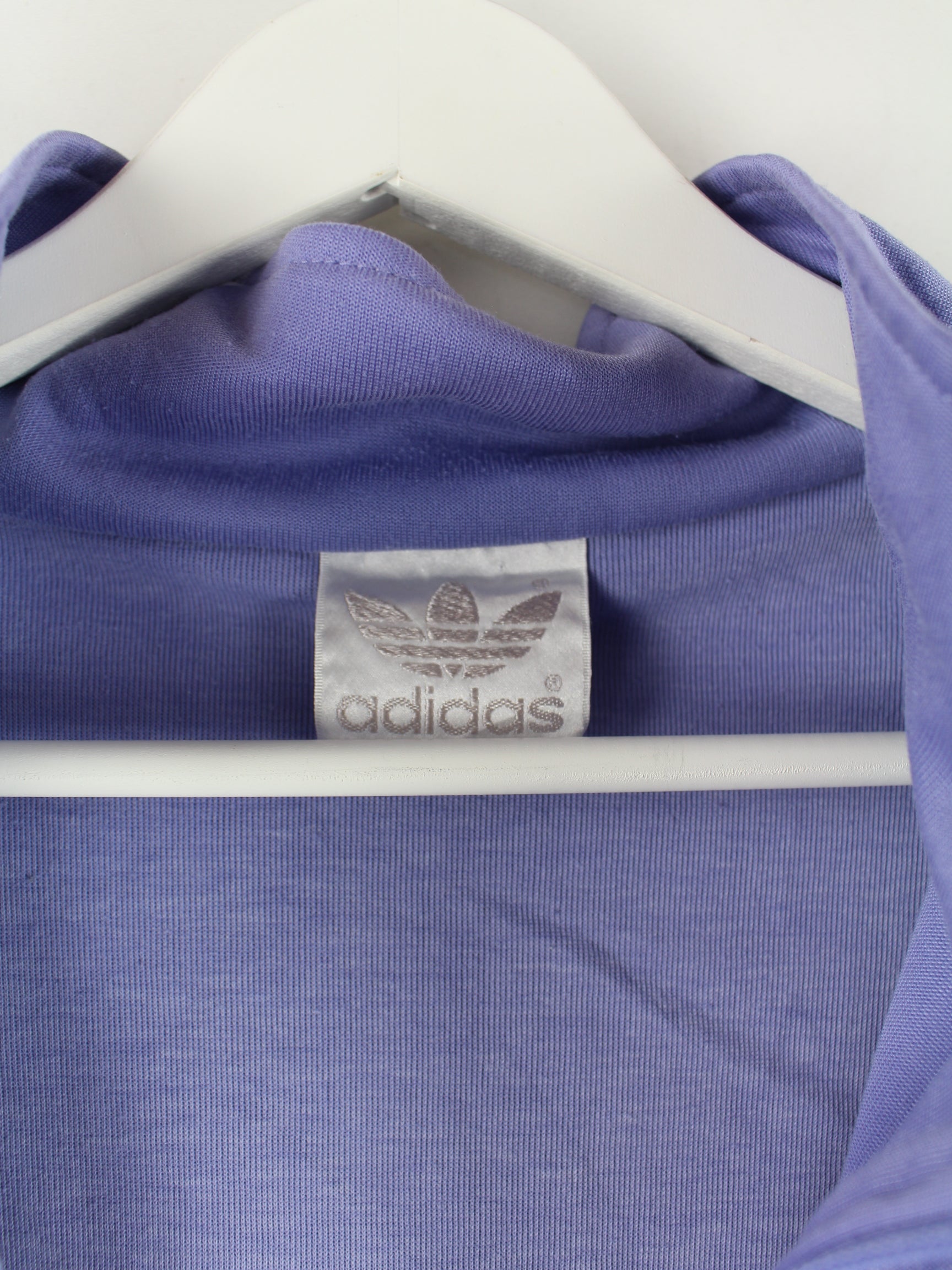 Trainingsjacke vom Brand Adidas in Größe L aus den 80'ern. Sie ist aus einer Baumwollmischung gemacht und in Lila bei uns zu bekommen.
