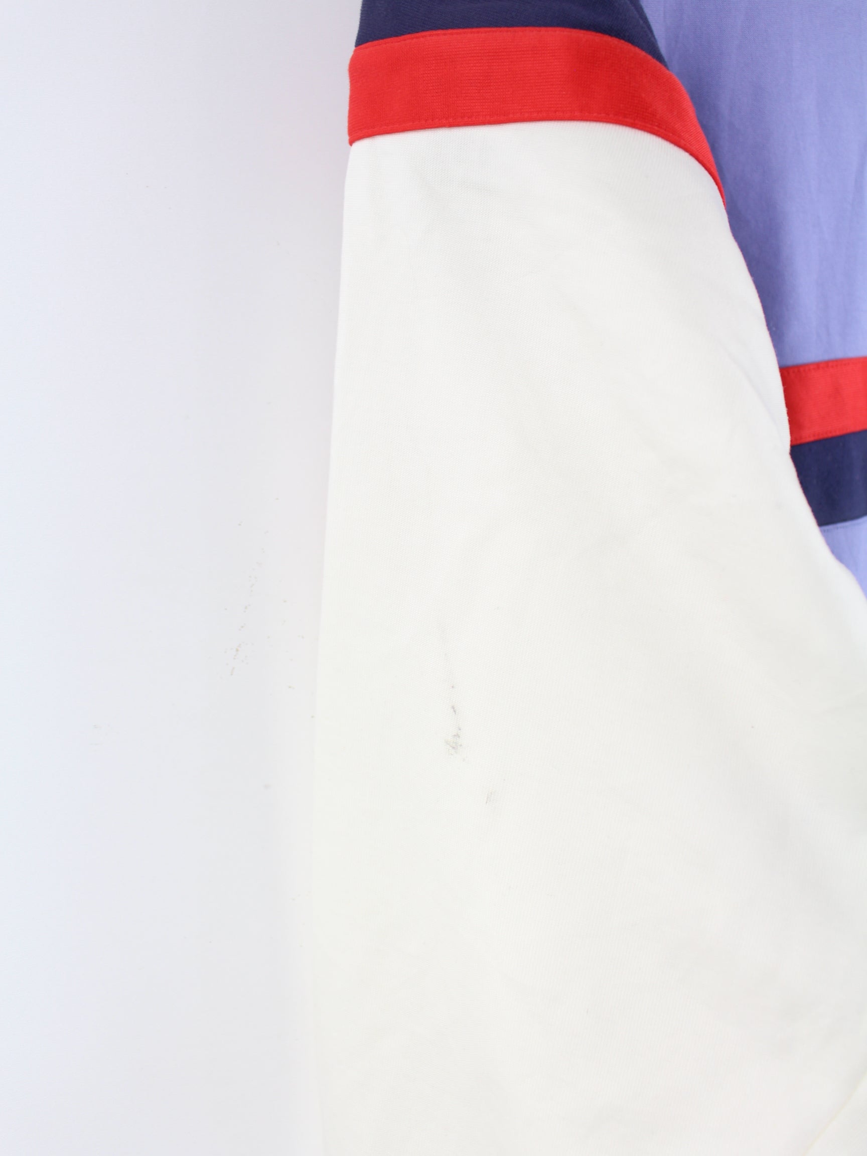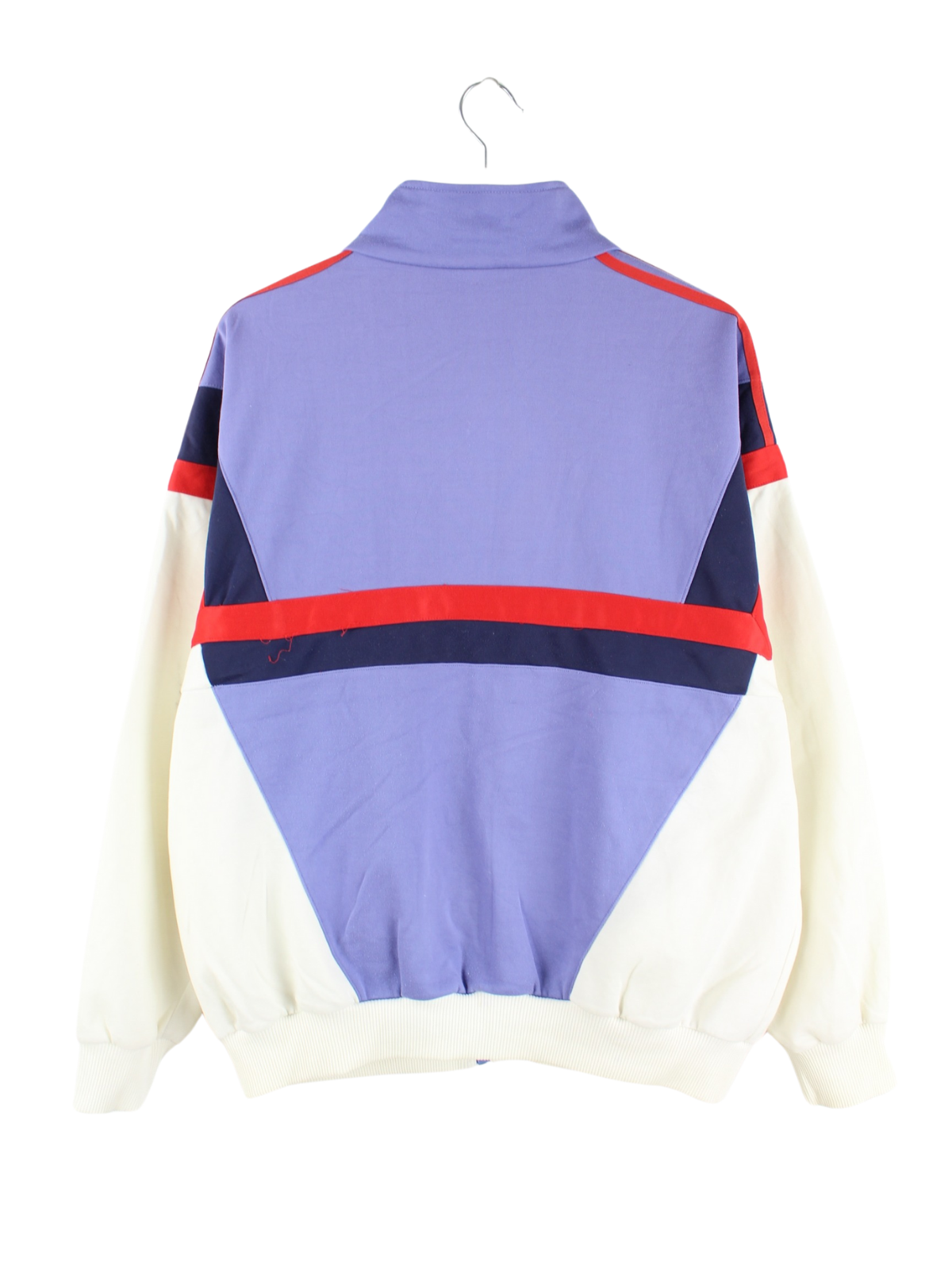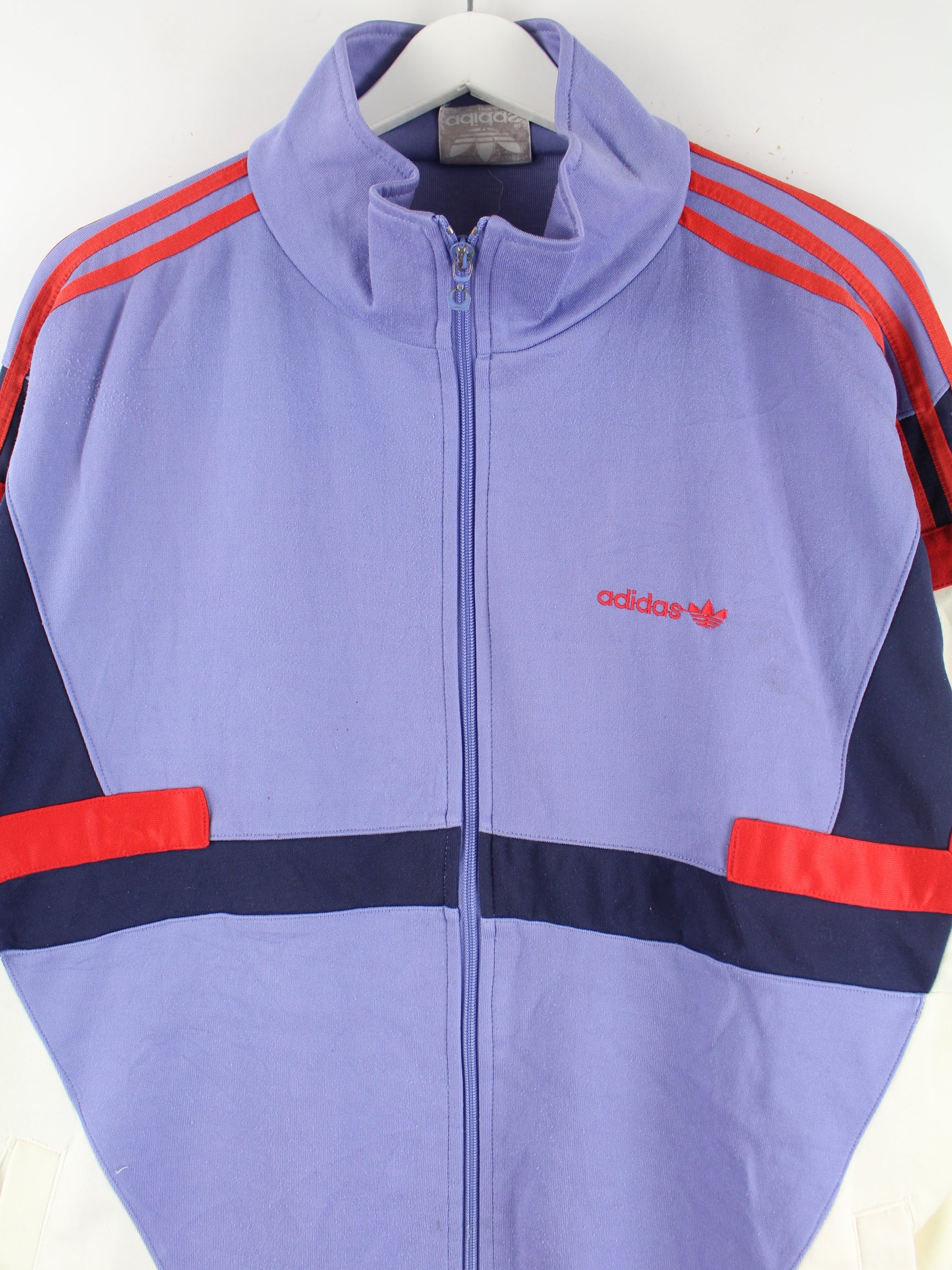 Trainingsjacke vom Brand Adidas in Größe L aus den 80'ern. Sie ist aus einer Baumwollmischung gemacht und in Lila bei uns zu bekommen.