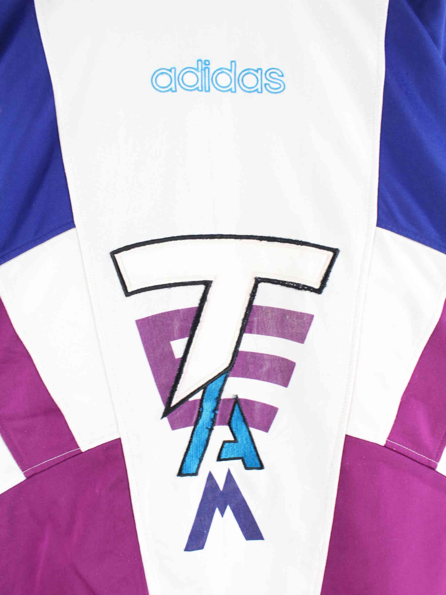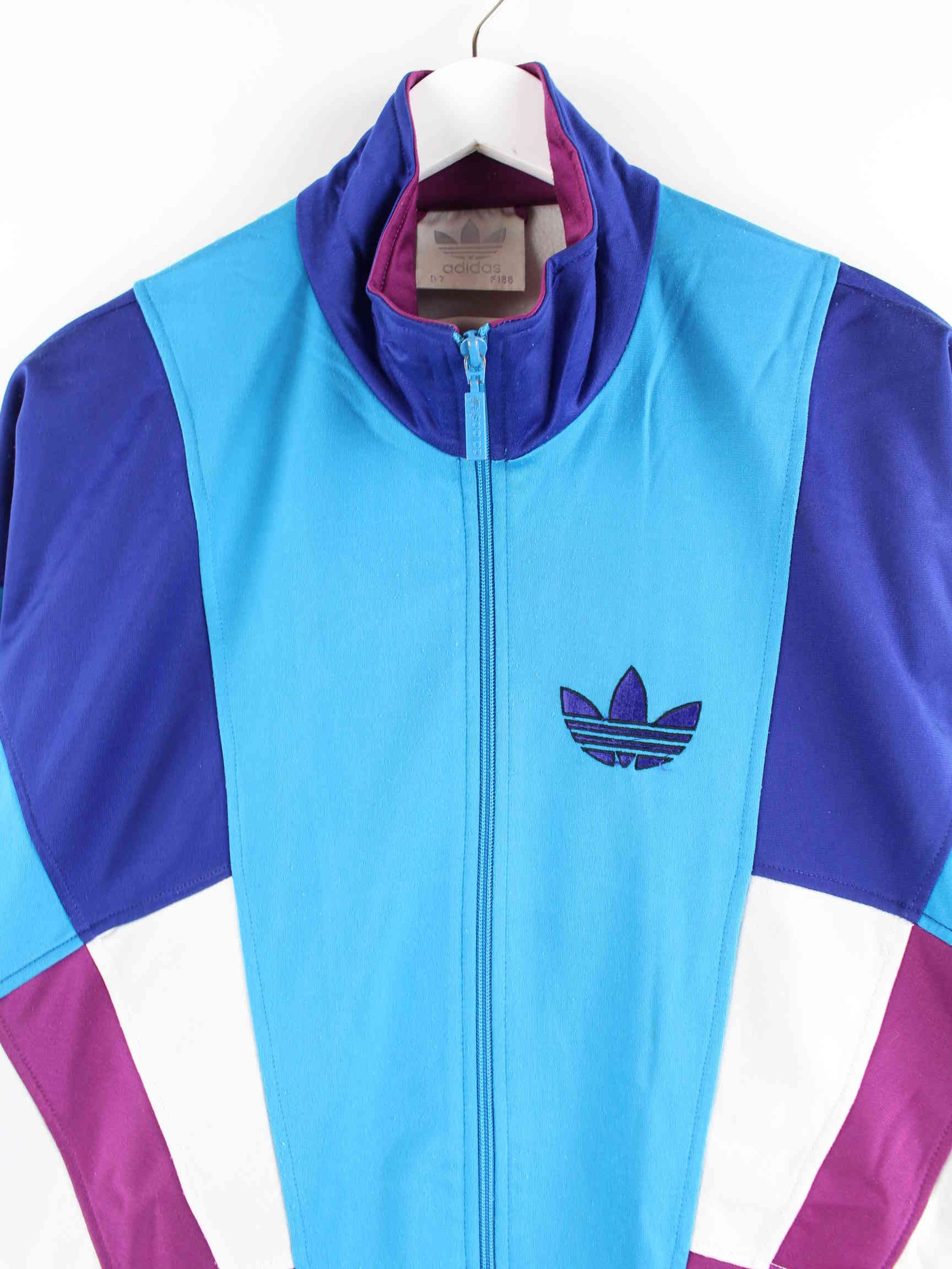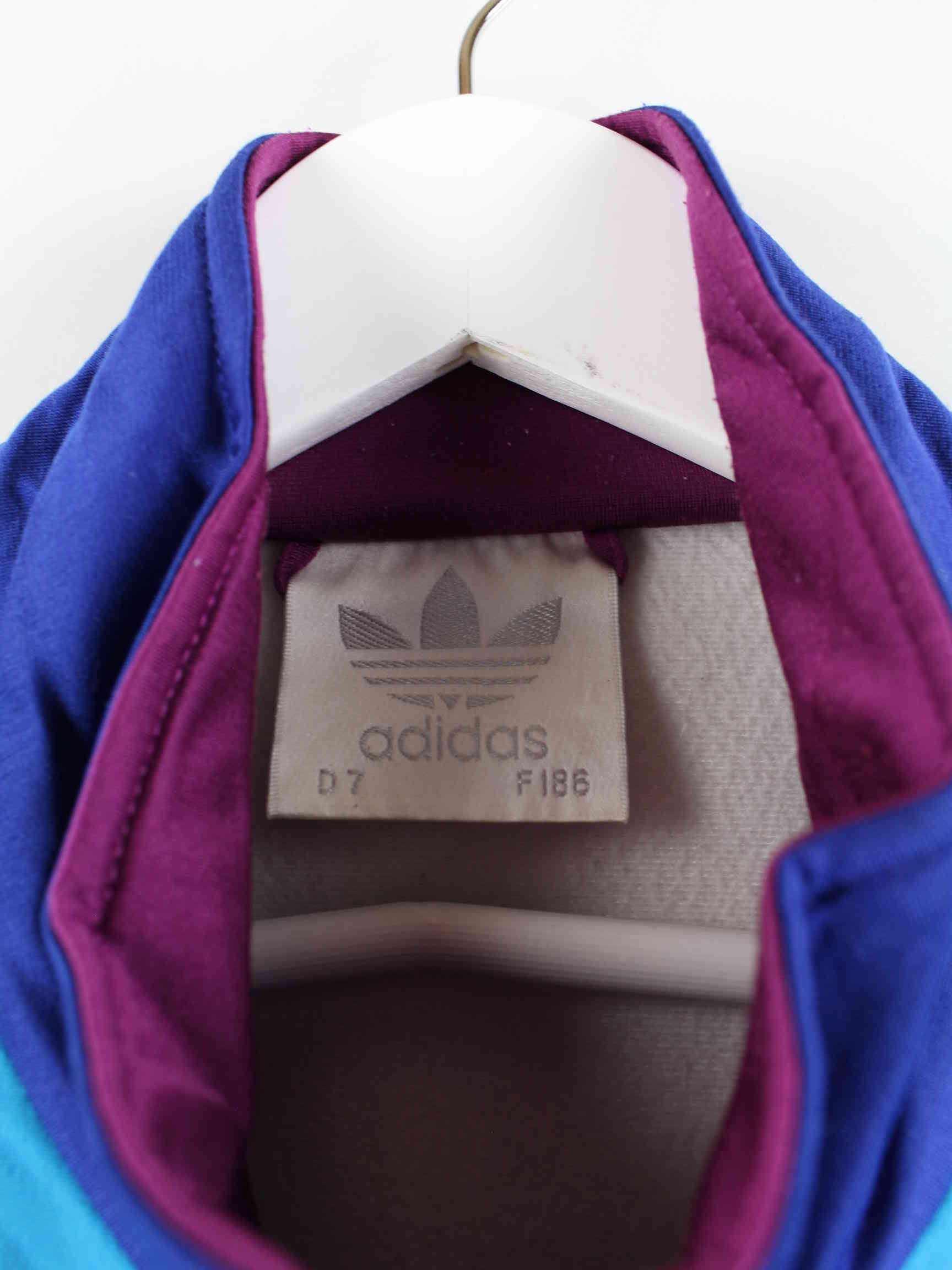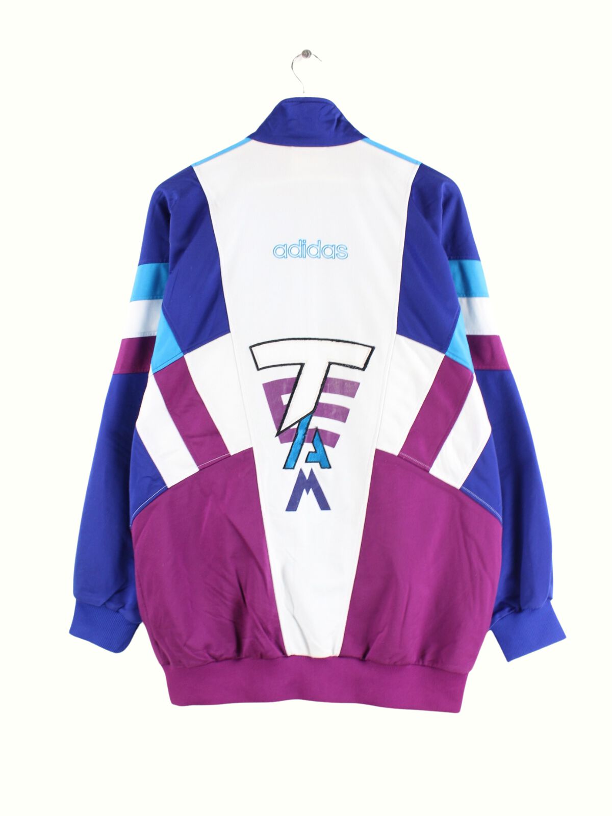 Trainingsjacke der Marke Adidas in Größe XL aus den 80'ern. Sie ist aus Synthetik gemacht und in bunten Farben im Bestand.