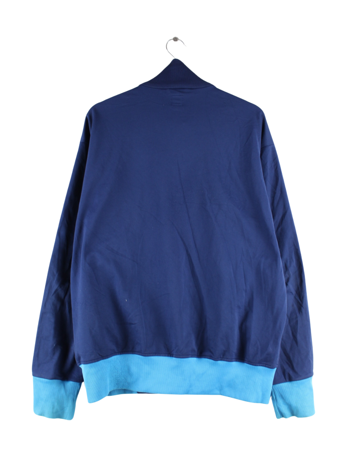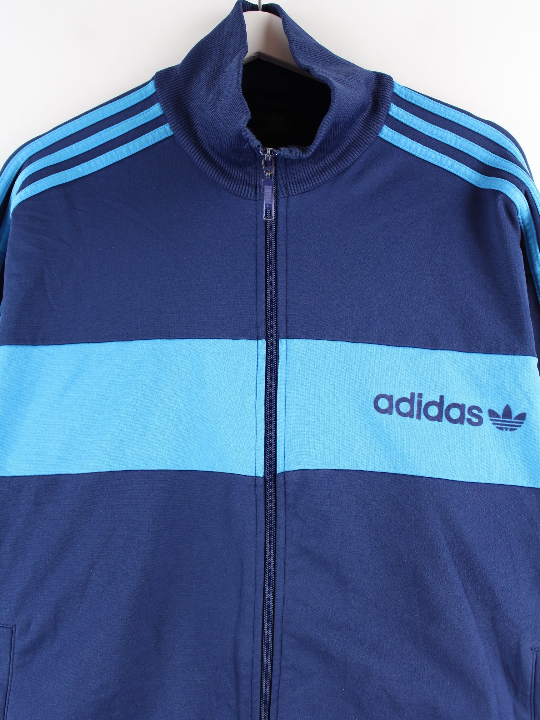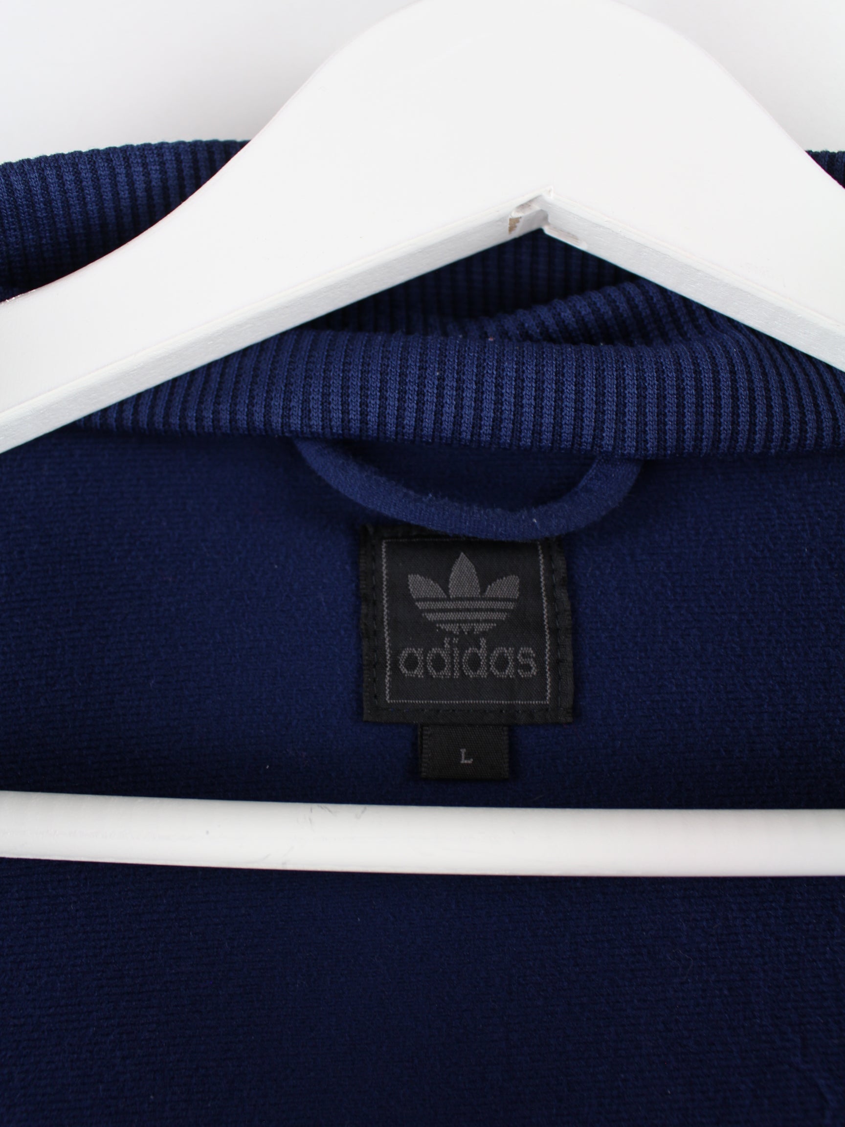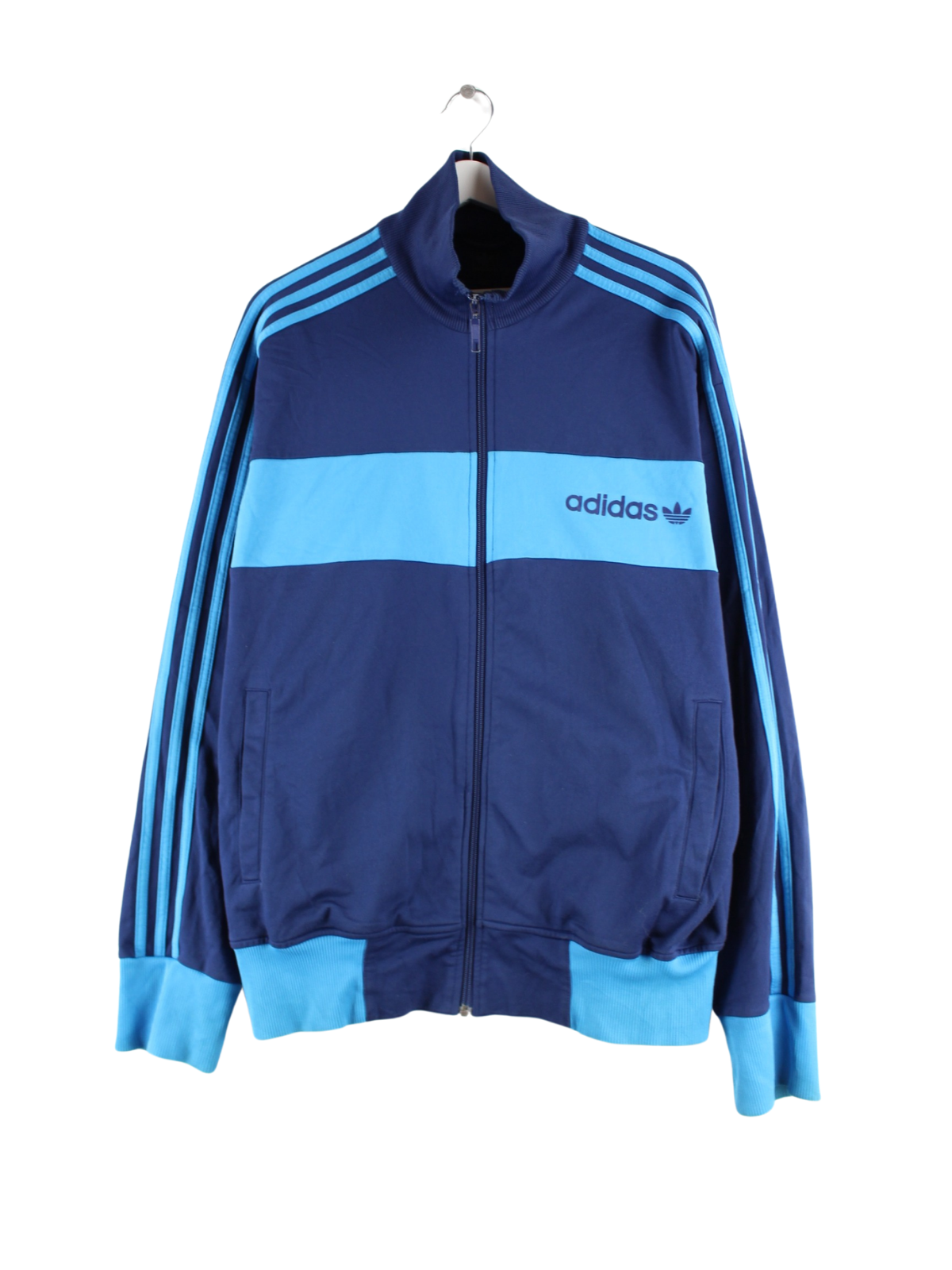 Trainingsjacke von Adidas in Größe L aus den 90'ern. Sie ist aus Synthetik angefertigt und in Blau vorrätig.