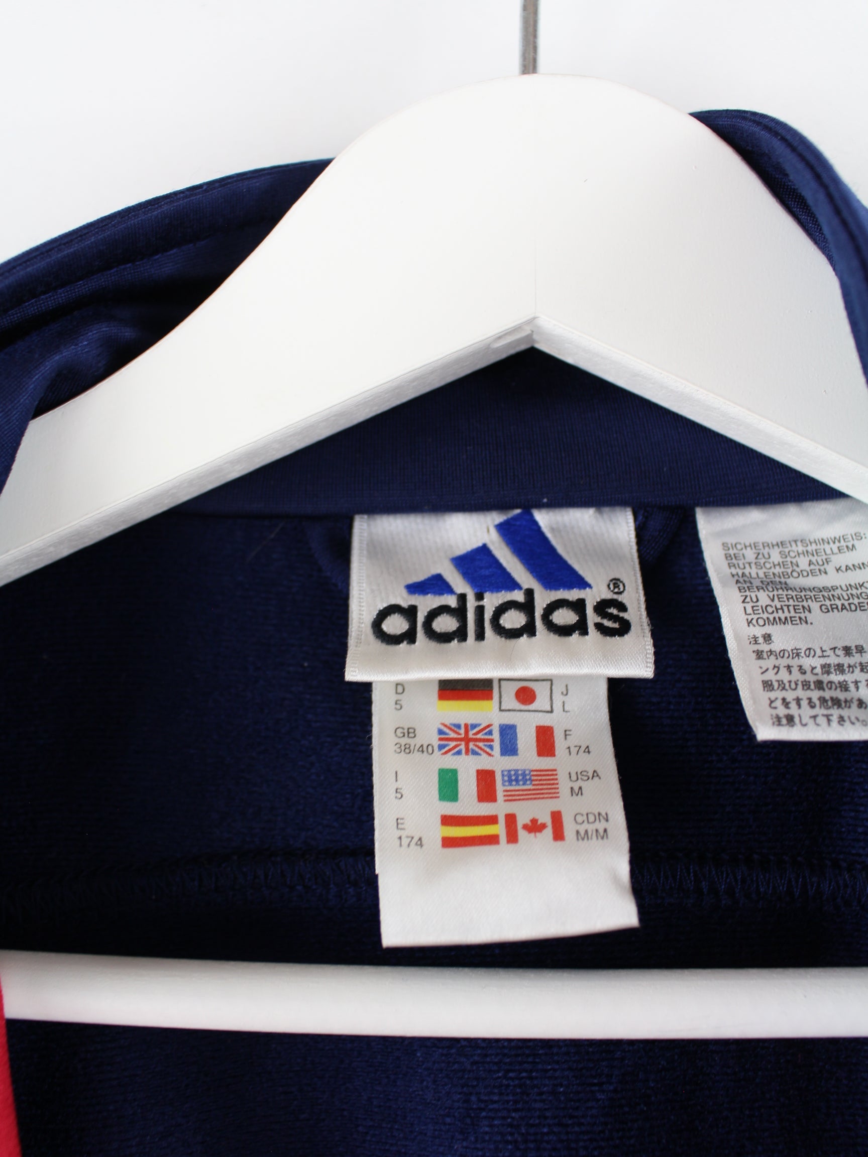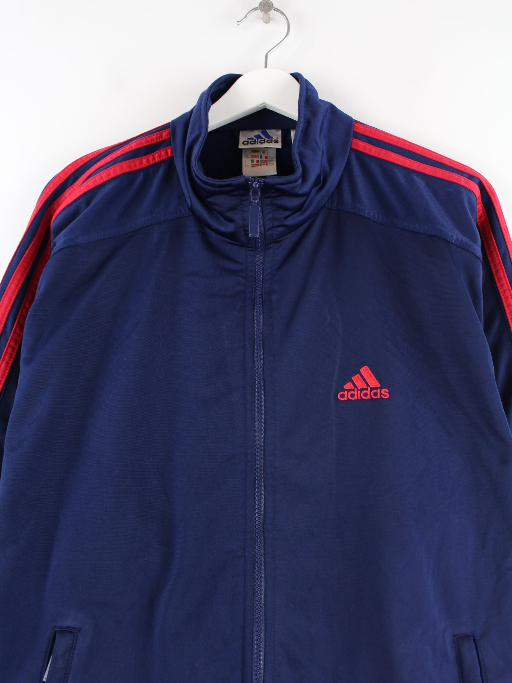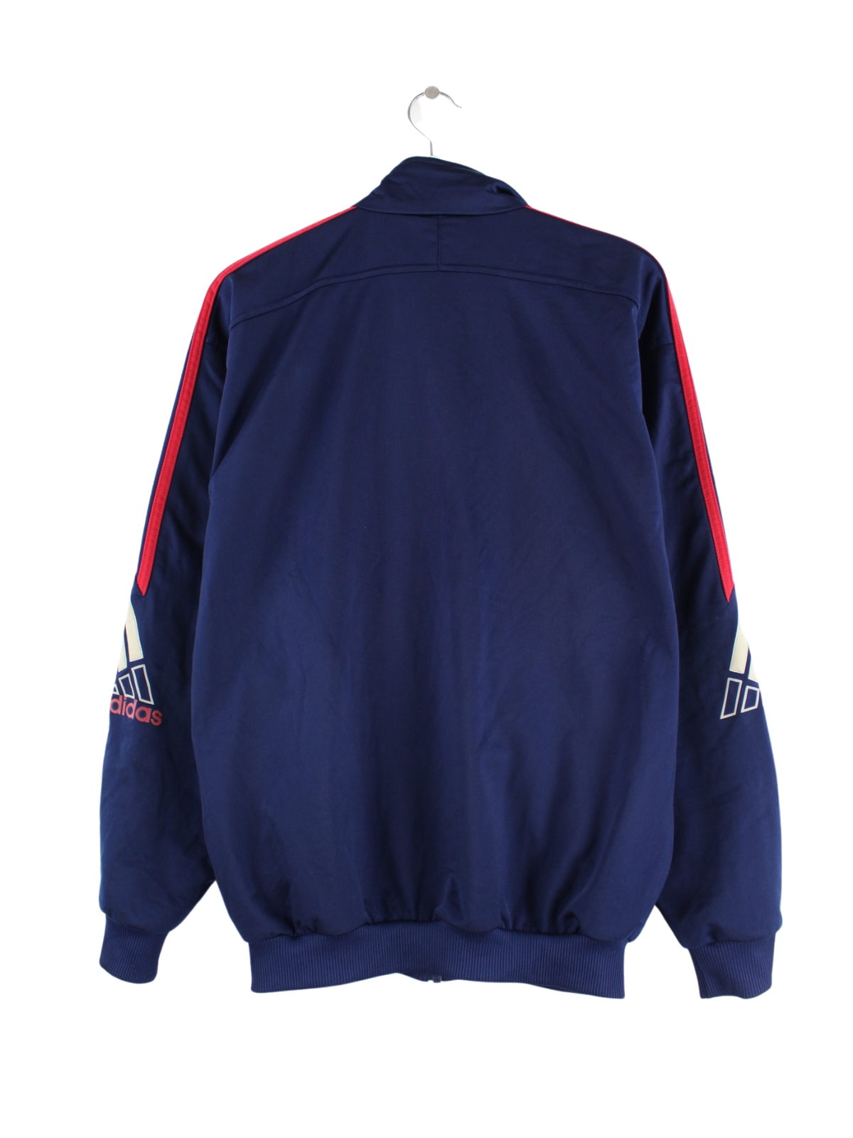 Trainingsjacke der Marke Adidas in Größe M aus den 90'ern. Sie ist aus Synthetik angefertigt und in Blau bei uns vorrätig.