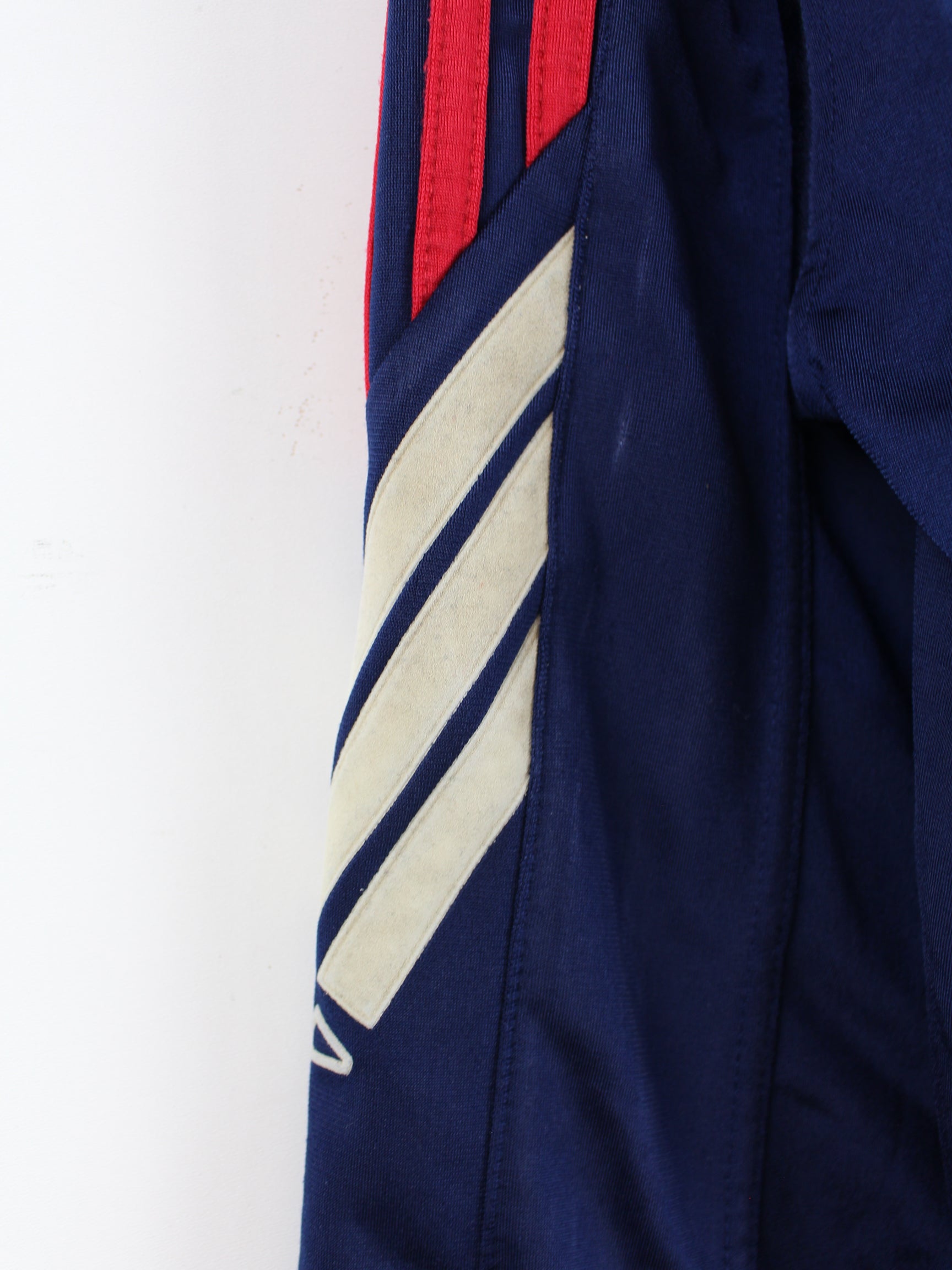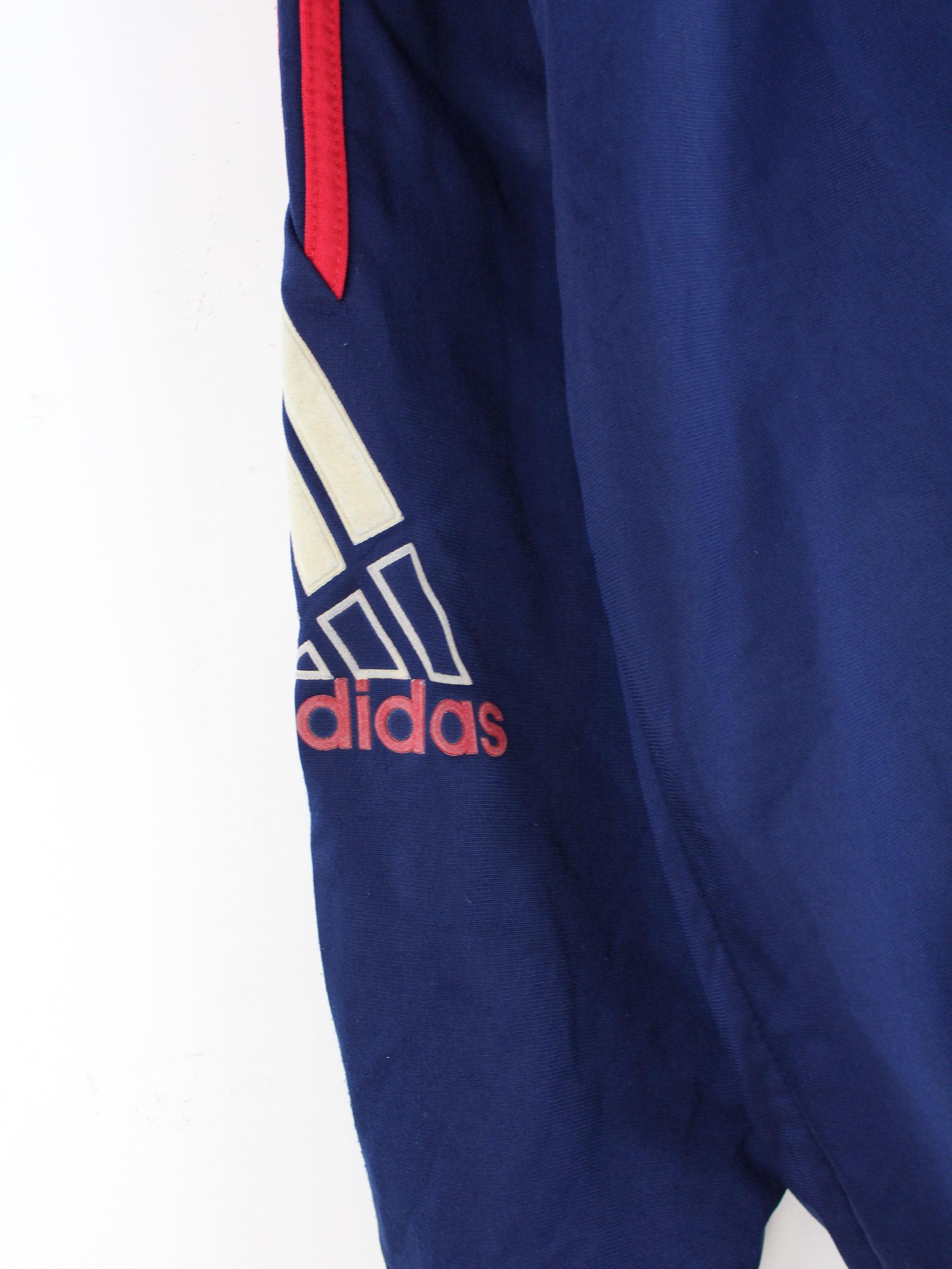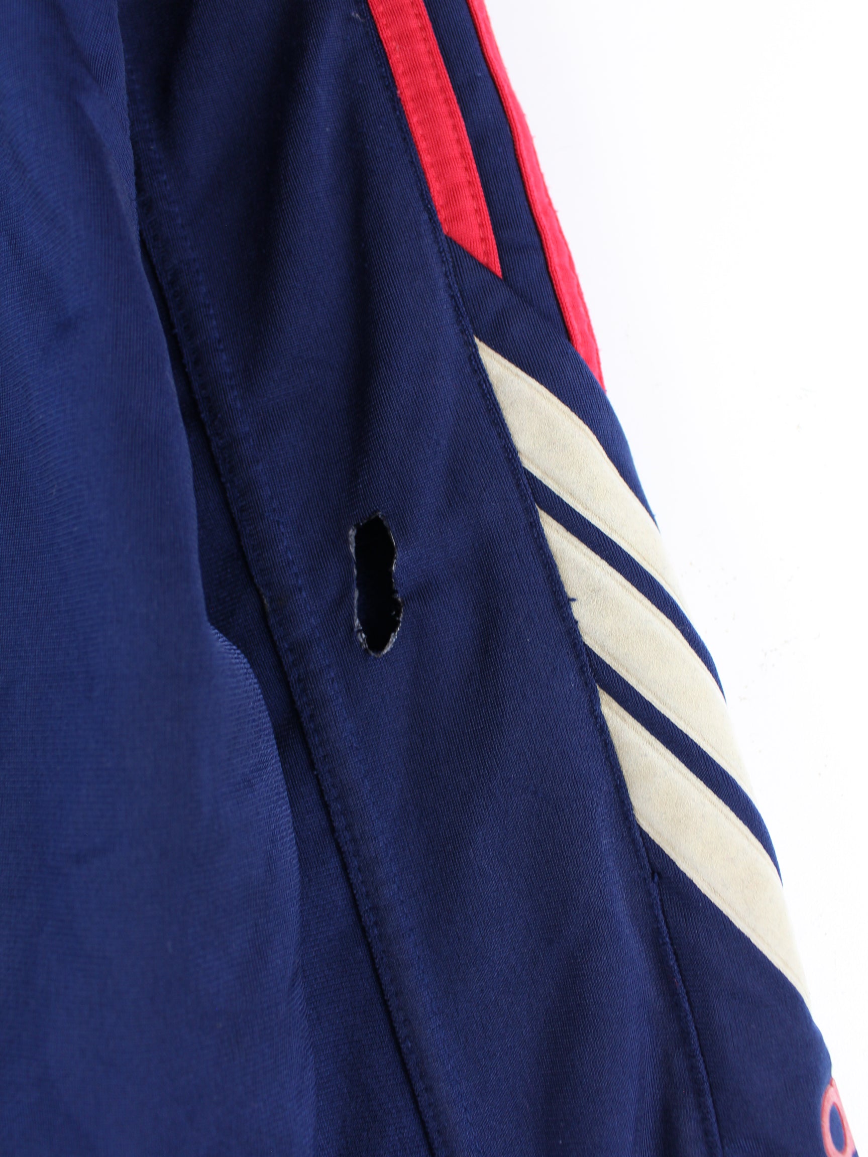 Trainingsjacke der Marke Adidas in Größe M aus den 90'ern. Sie ist aus Synthetik angefertigt und in Blau bei uns vorrätig.