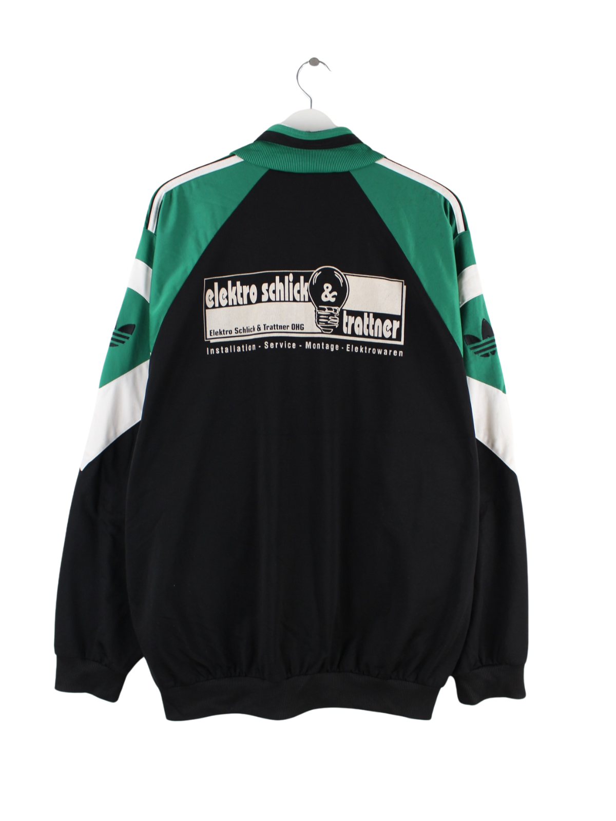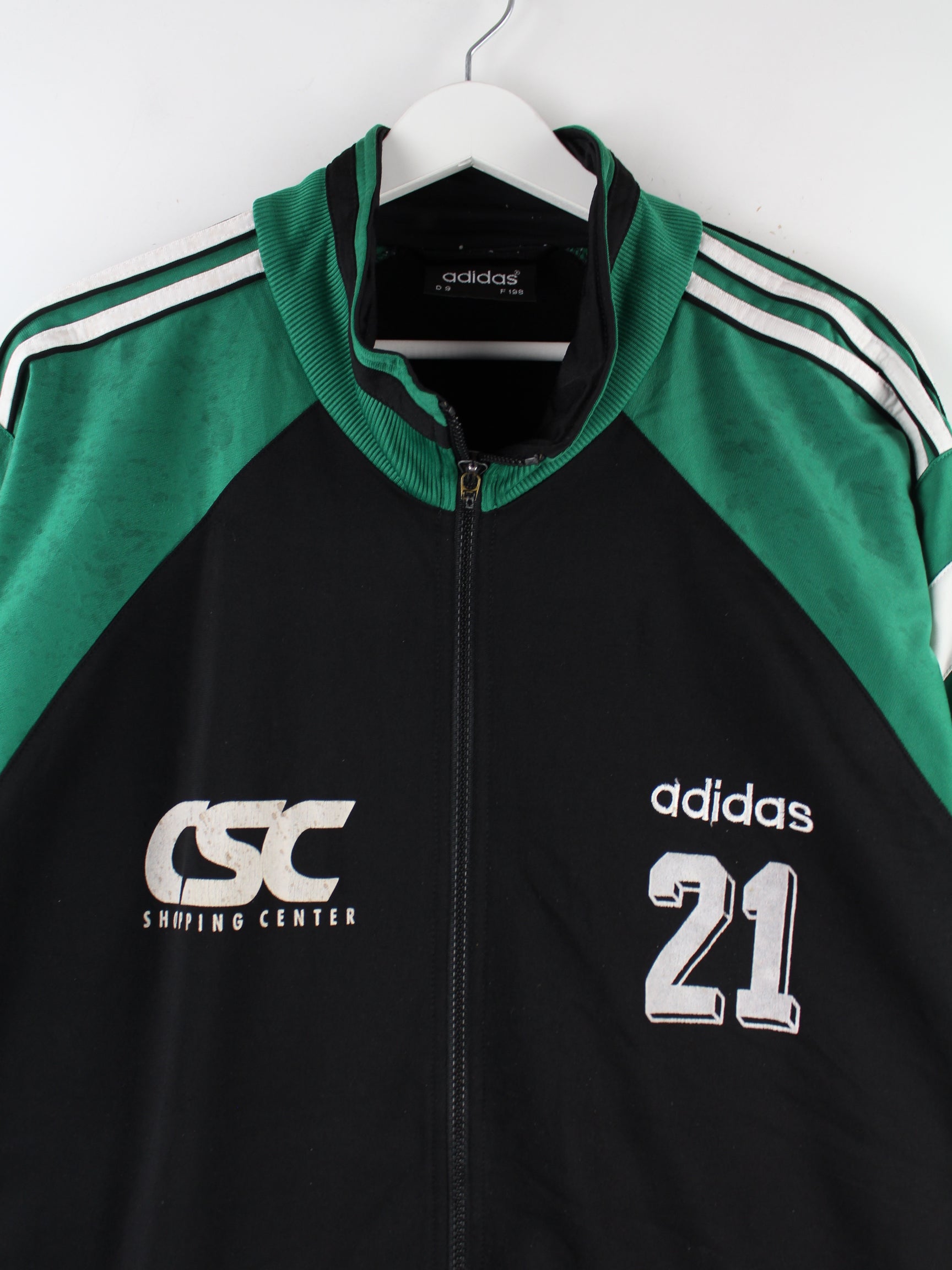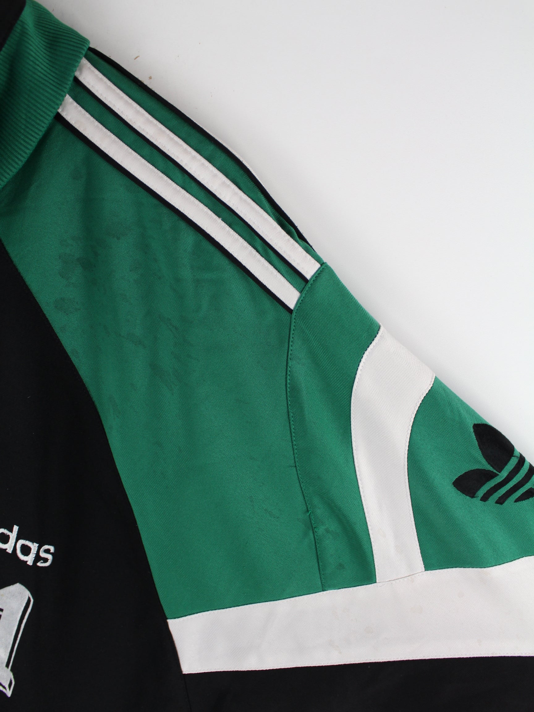 Schwarze Trainingsjacke der Brand Adidas aus den 90'ern in Größe XXL. Sie ist aus Synthetik . Den Zustand würden wir als 'In Ordnung' bezeichnen (vergl. Bilder).Mit schönem Vintage Print.
