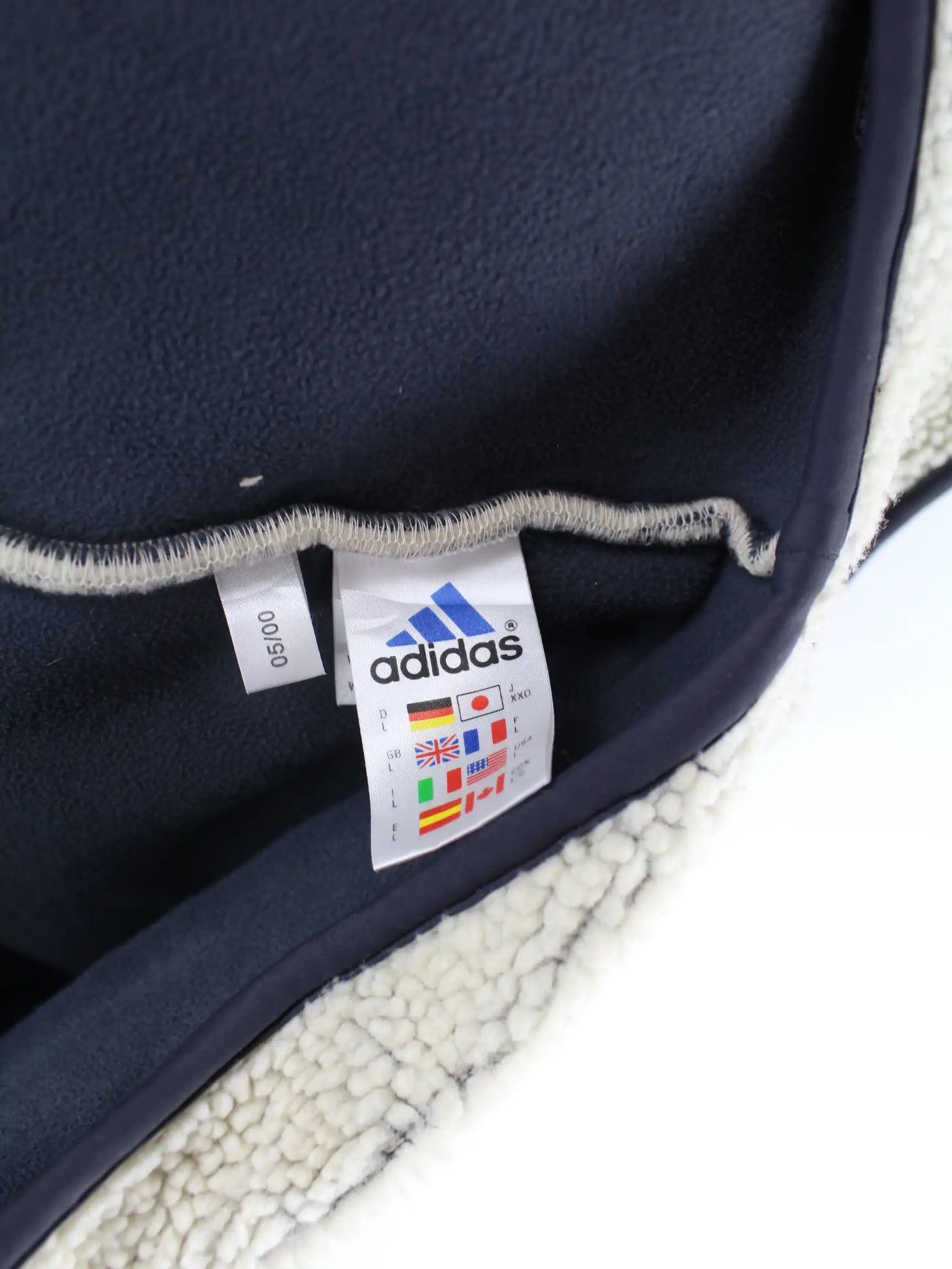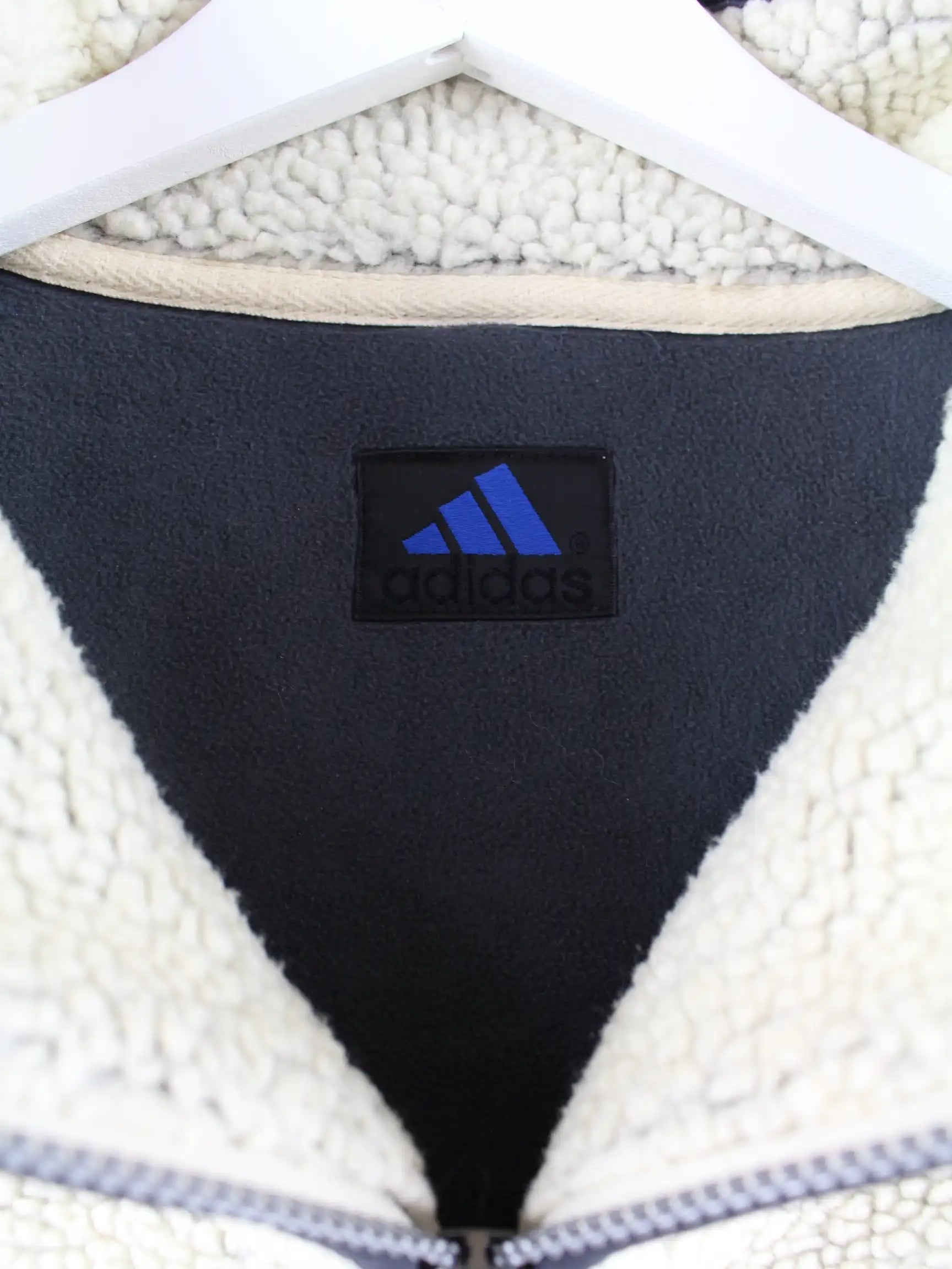 Weste vom Label Adidas in Größe XL aus den 90'ern. Sie ist aus kuscheligem Fleece gefertigt und in Beige bei uns zu bekommen.