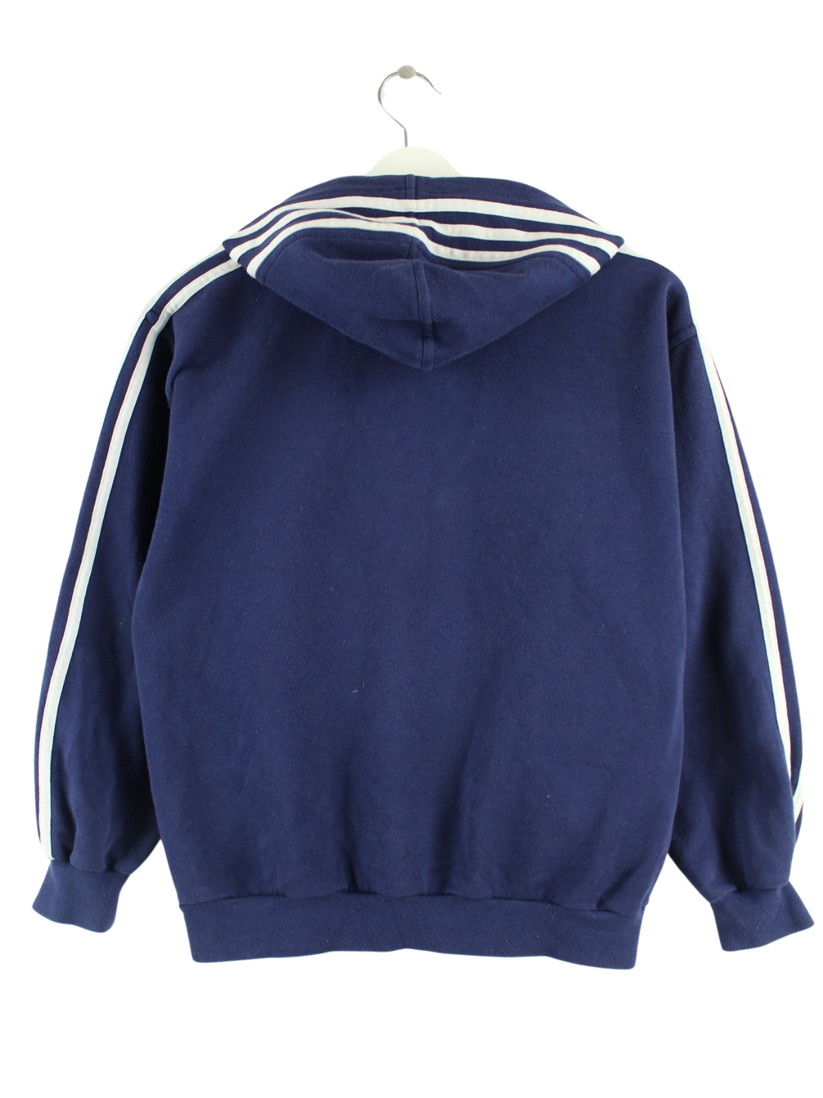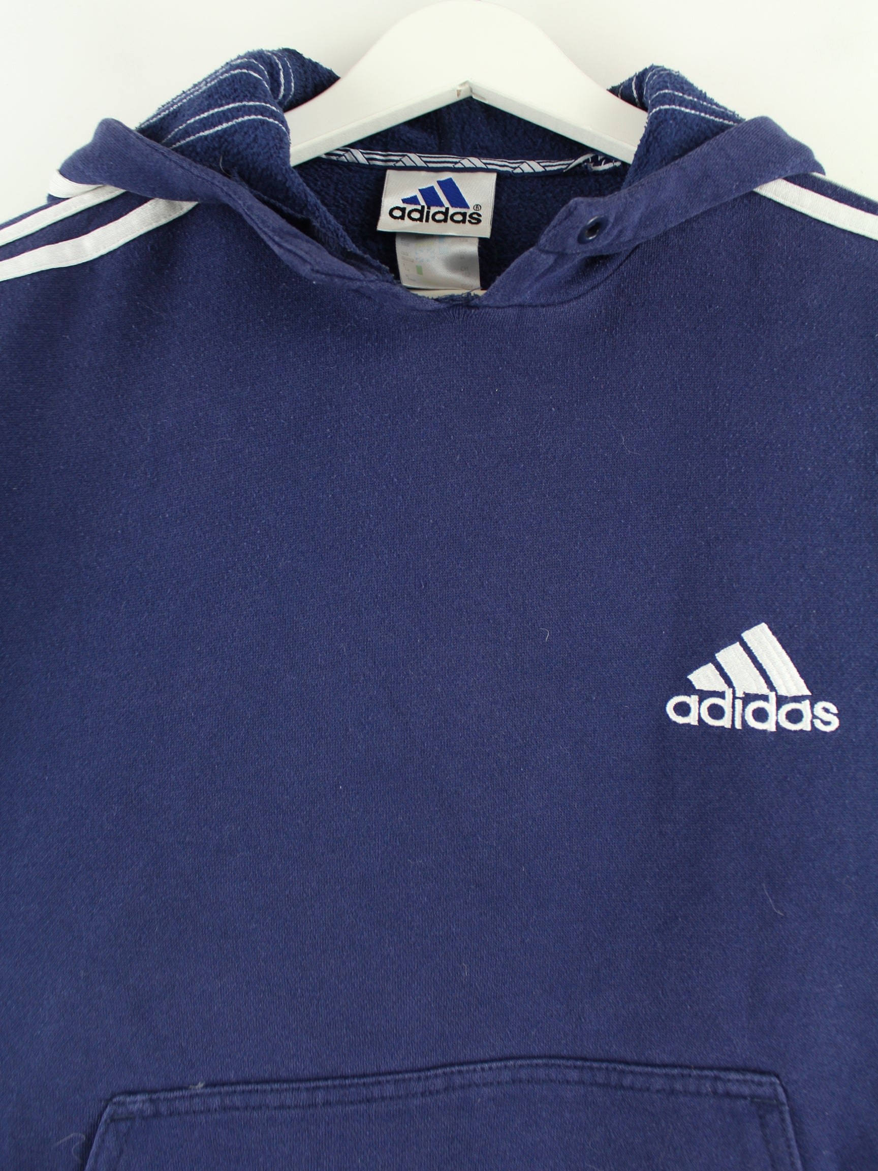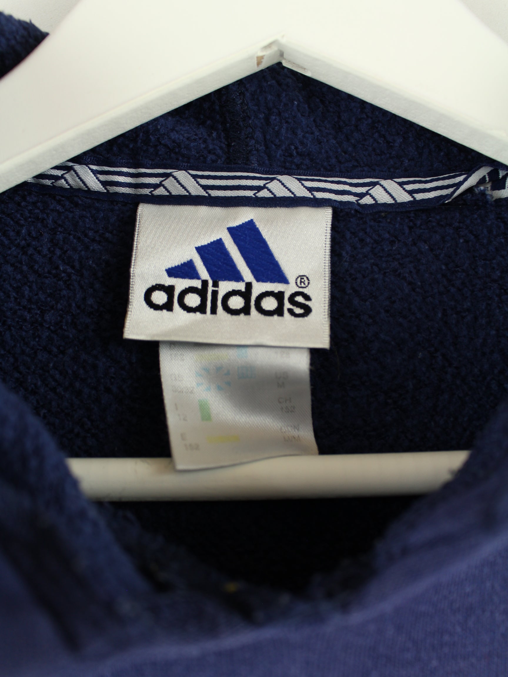 Hoodie von Adidas mit Stick in Größe XS aus den 90'ern. Er ist aus einer Baumwollmischung hergestellt und in Blau bei uns zu bekommen.