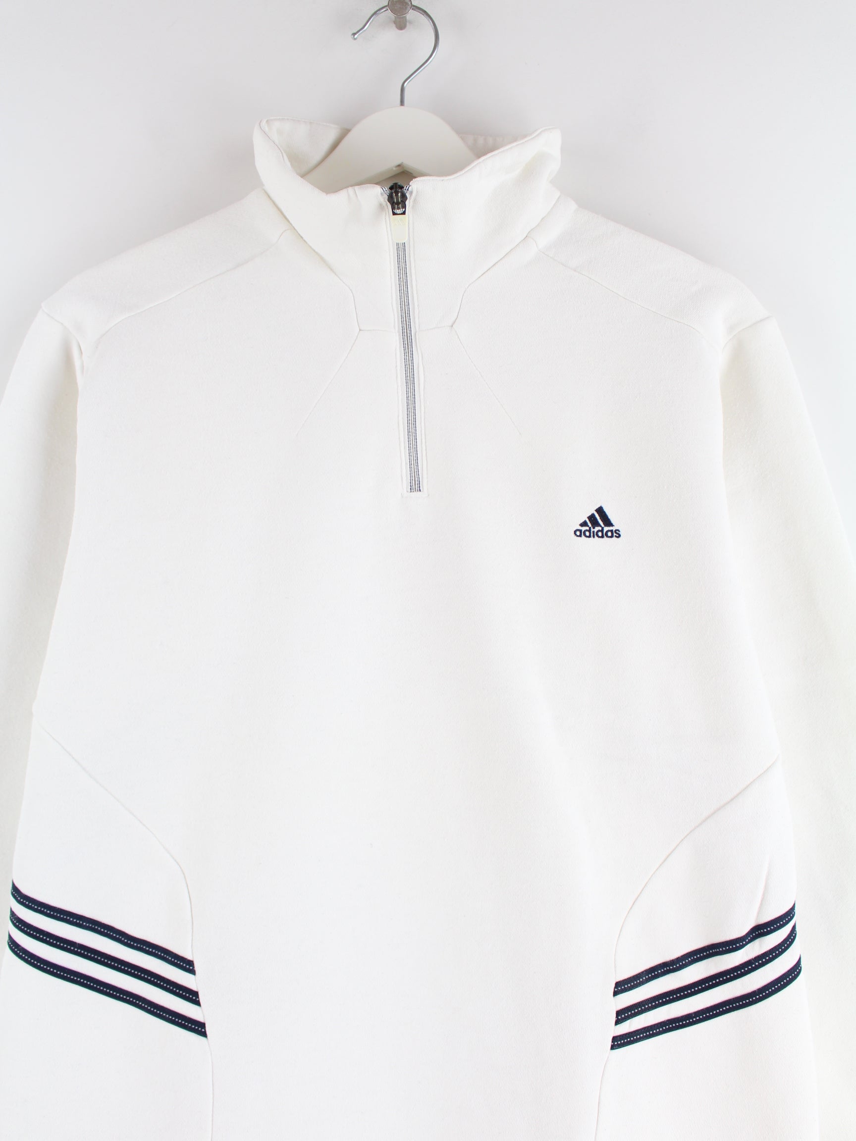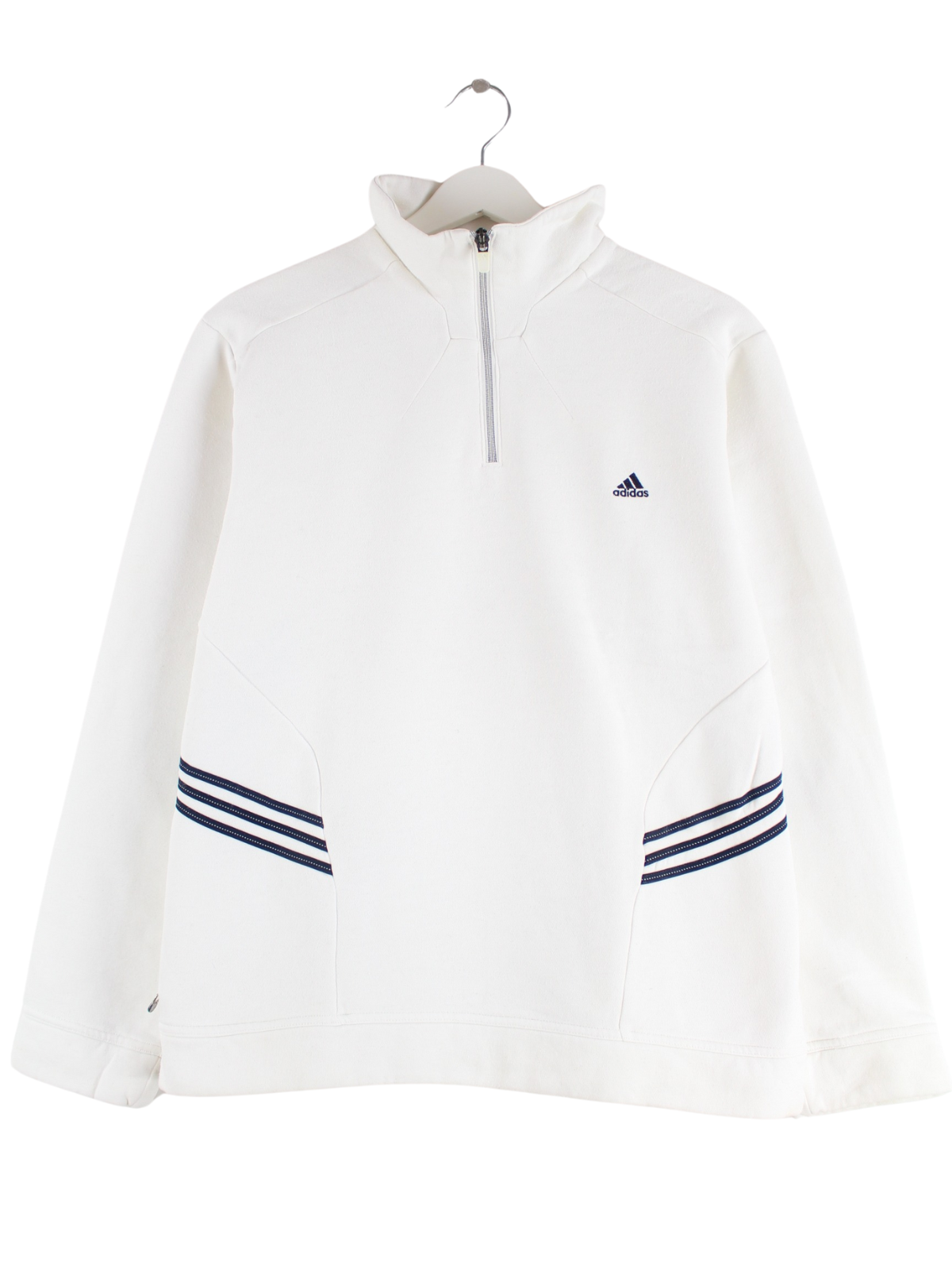 Sweater des Labels Adidas mit halbem Reißverschluß in Größe S aus den 90'ern. Er ist aus einer Baumwollmischung hergestellt und in Weiß vorrätig.