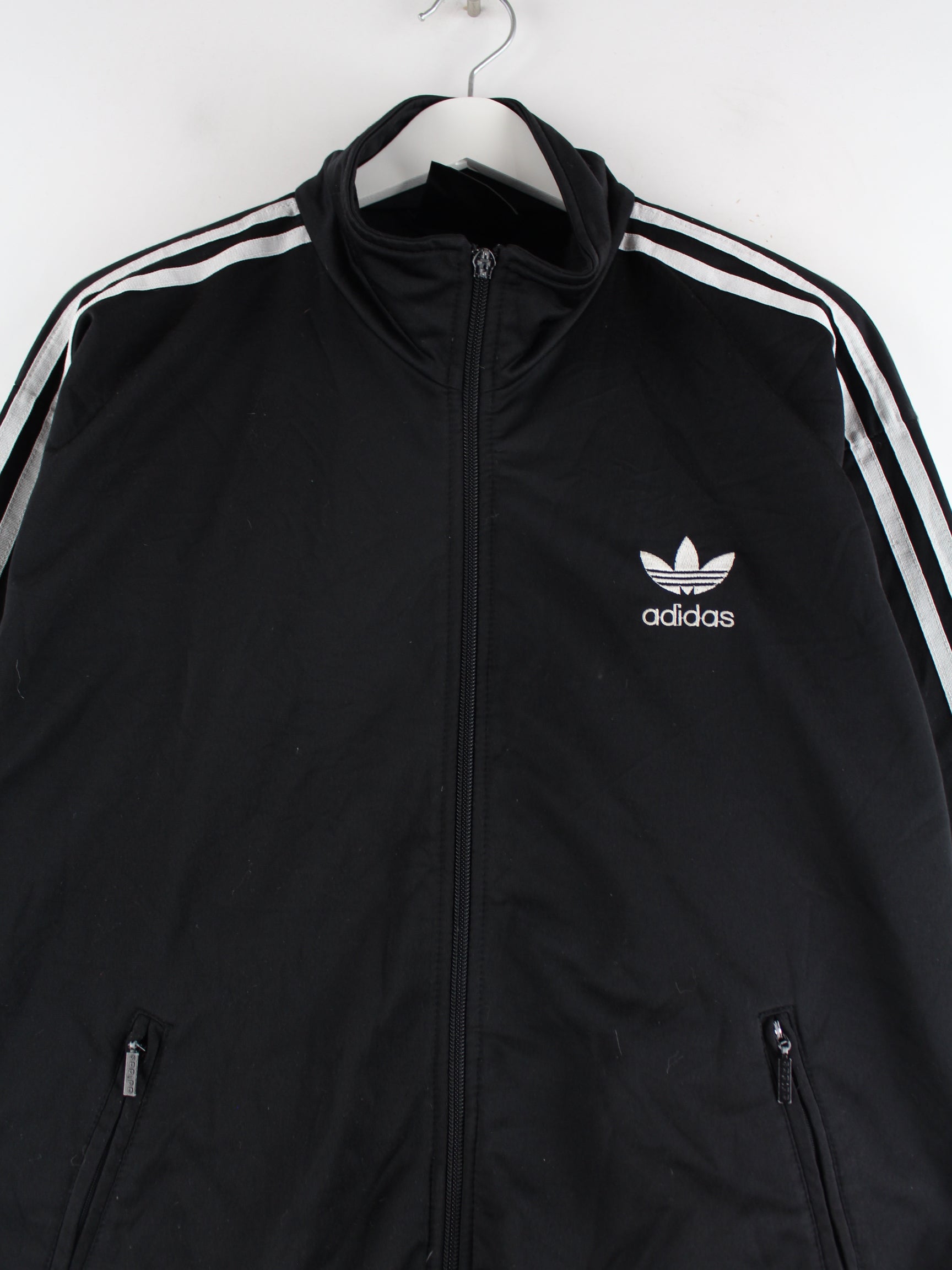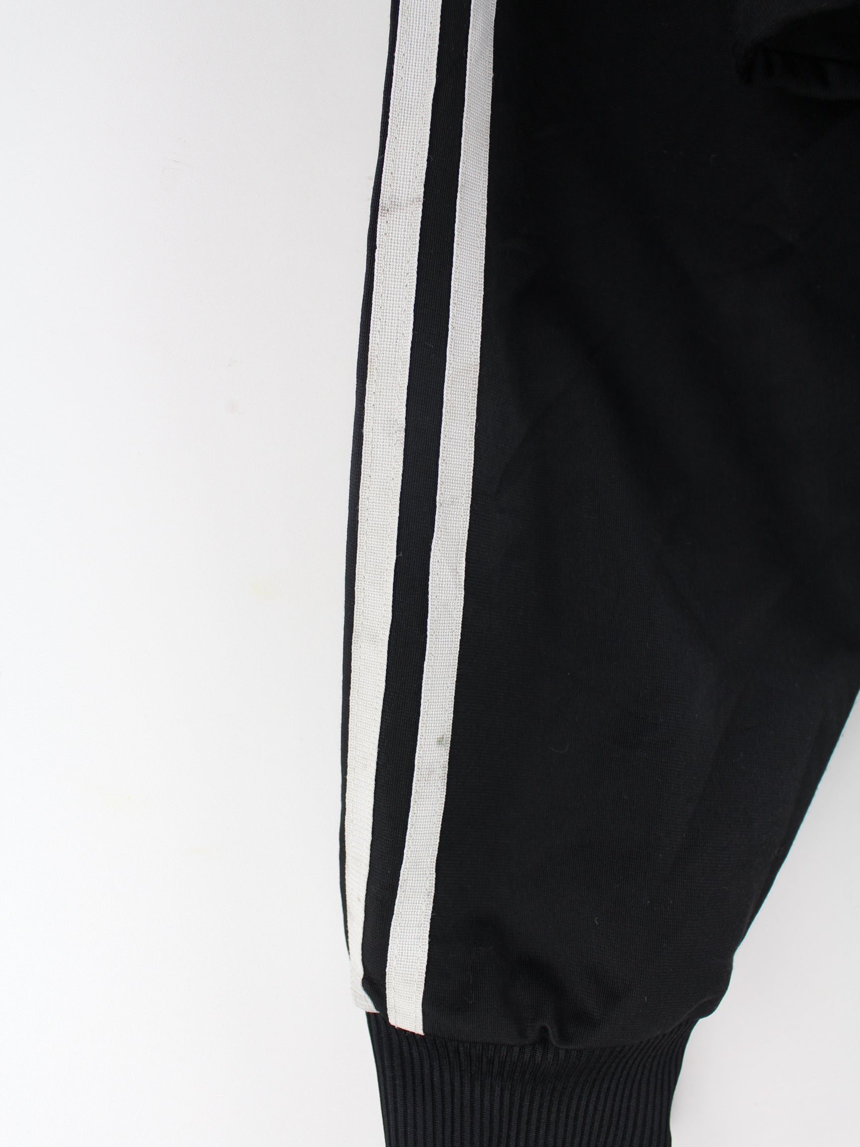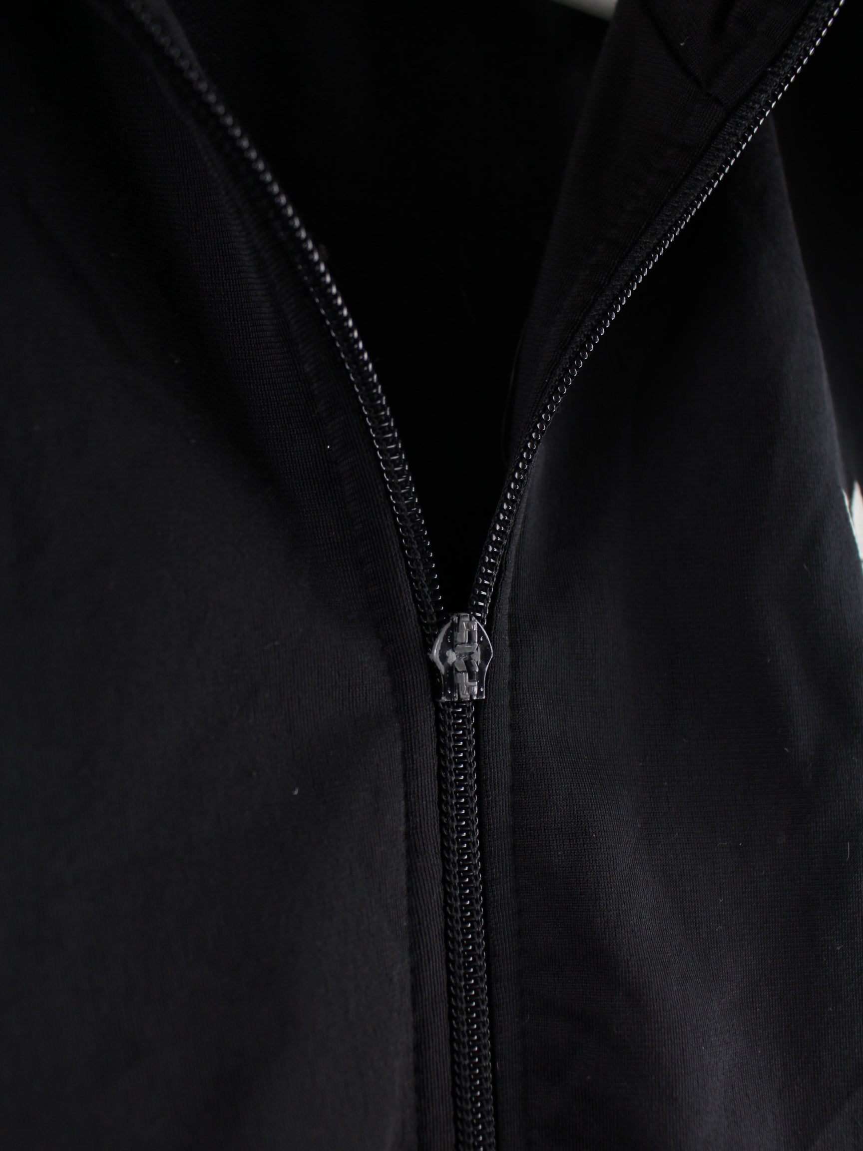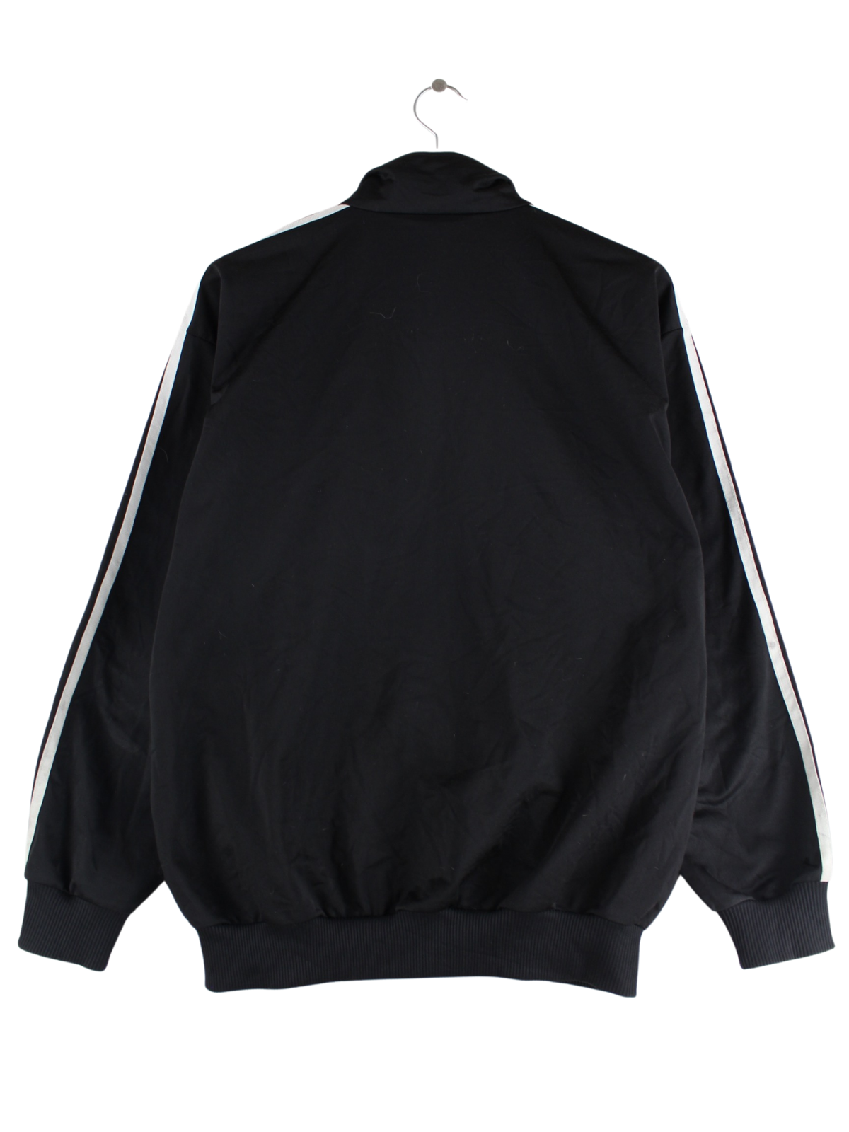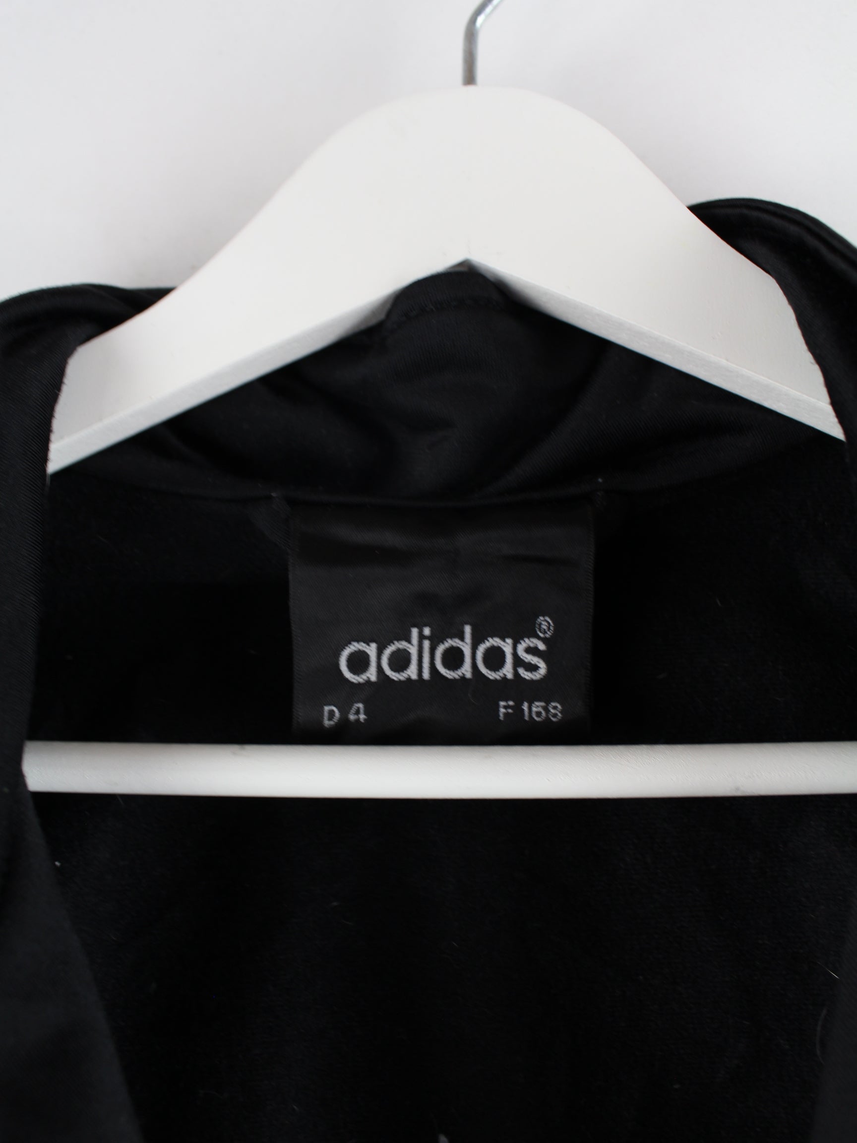 Schwarze Trainingsjacke aus dem Hause Adidas aus den 90'ern in Größe M. Sie ist aus Synthetik angefertigt. Den Zustand würden wir als 'In Ordnung' bezeichnen (vergl. Bilder).