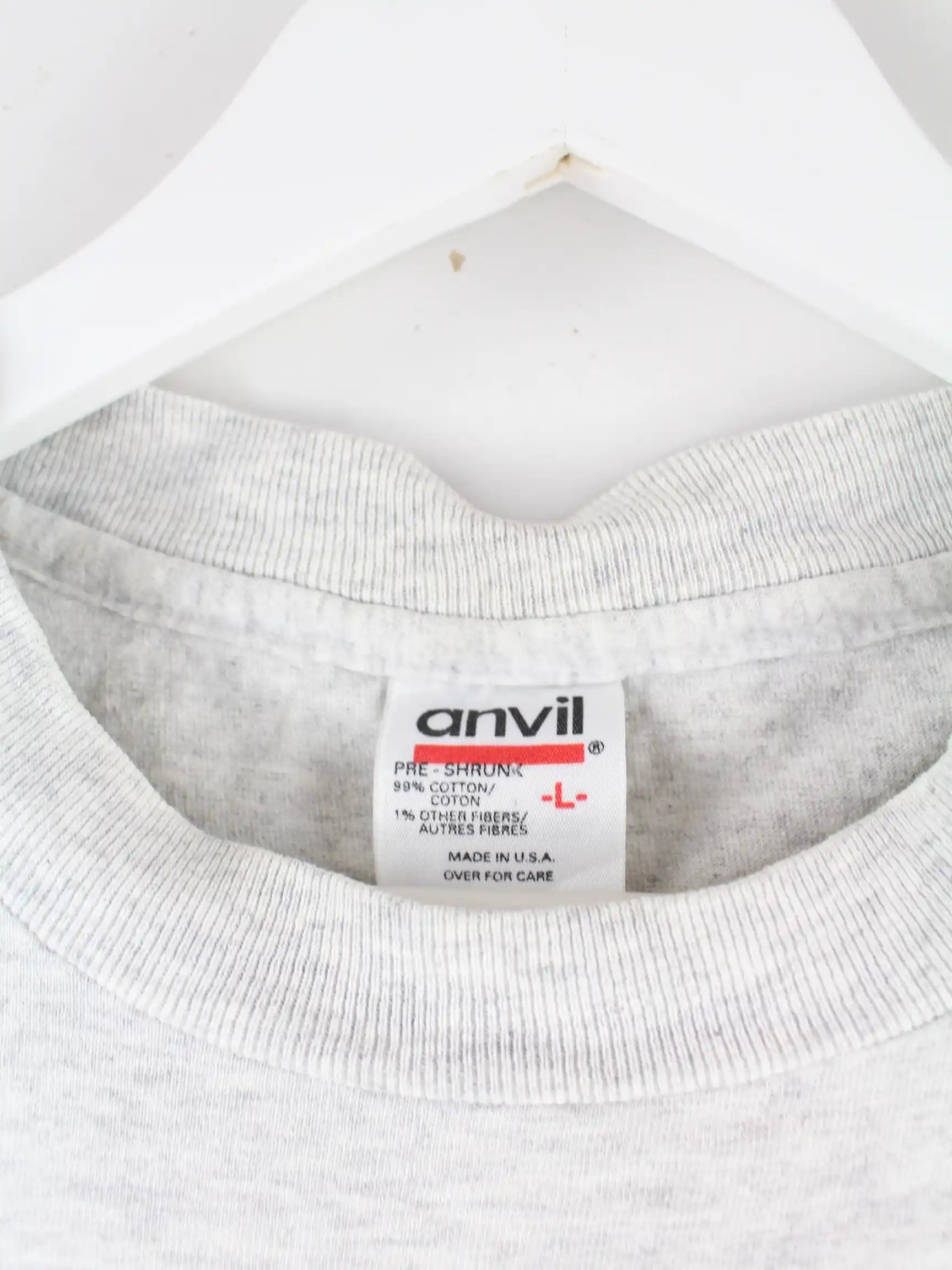 Graues T-Shirt der Brand Anvil aus den 90'ern in Größe L. Es ist aus Baumwolle gefertigt und in sehr gutem Zustand vorrätig. Mit schönem Vintage Print.