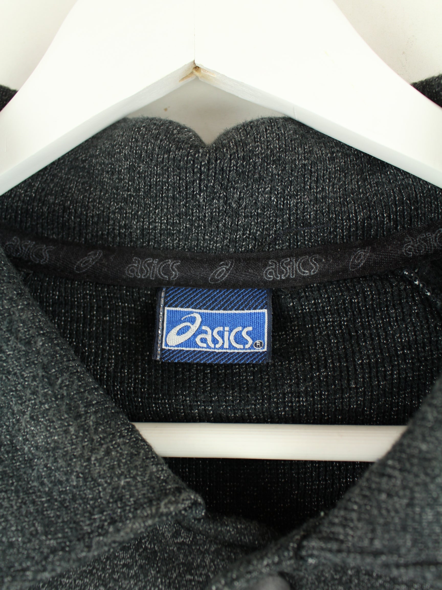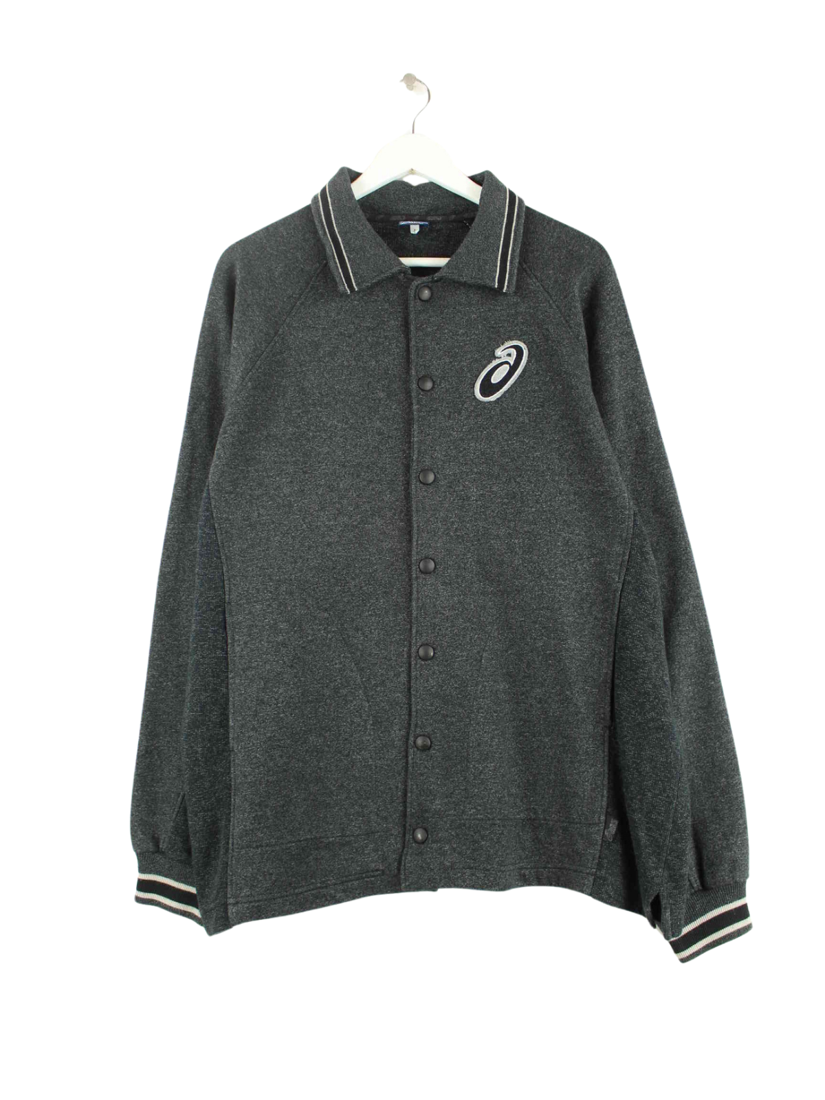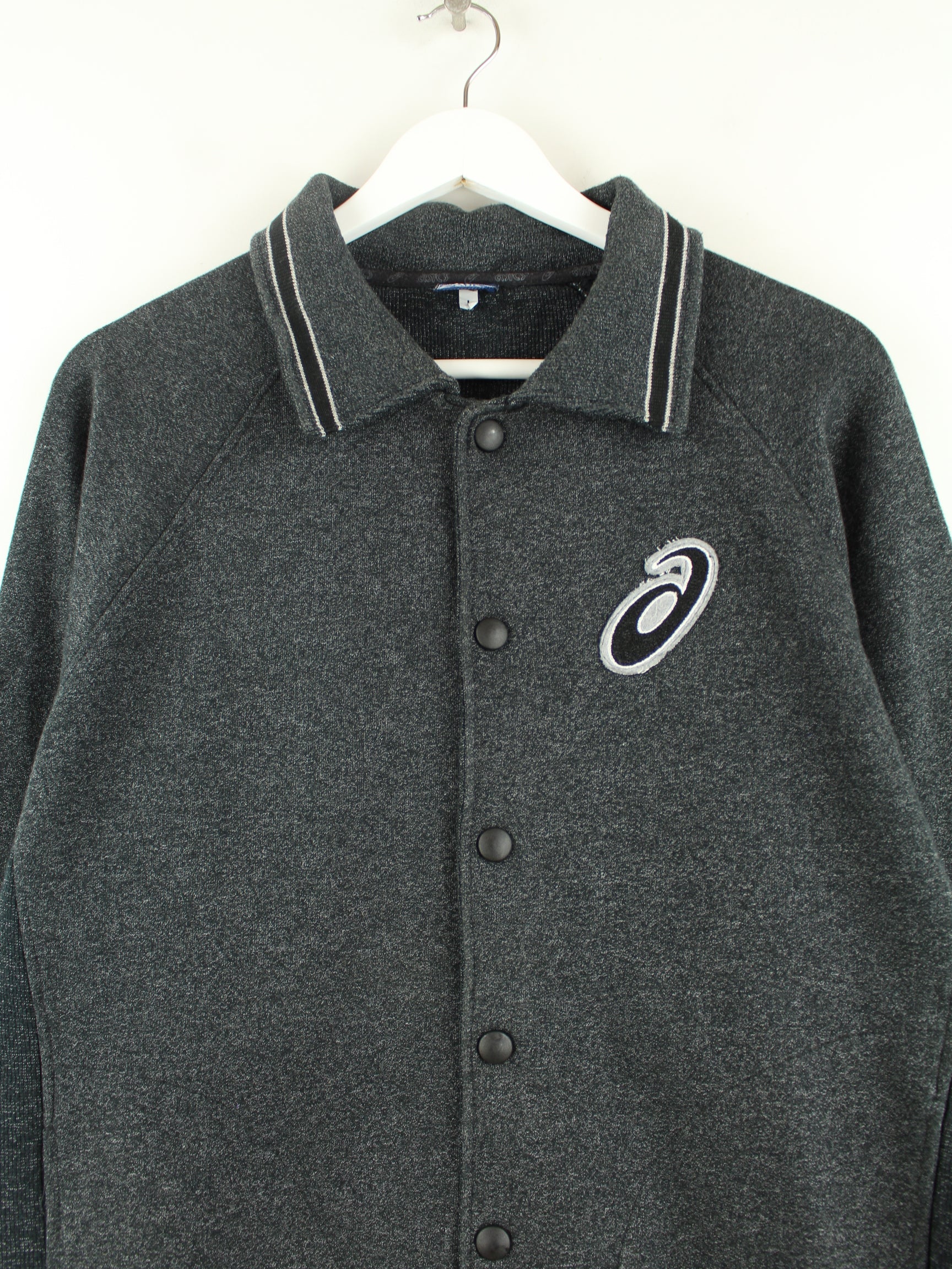 Sweatjacke des Labels Asics mit Stickereien in Größe L aus den 90'ern. Sie ist aus einer Baumwollmischung gefertigt und in Grau vorrätig.