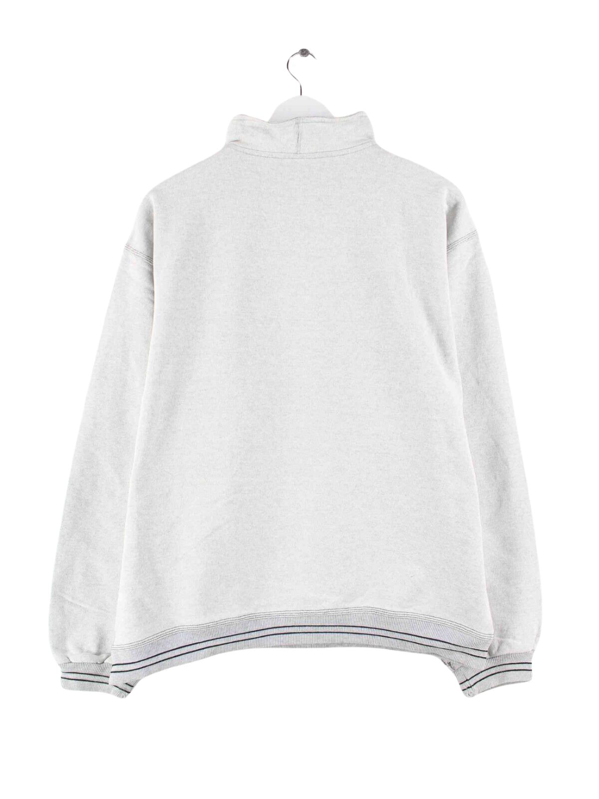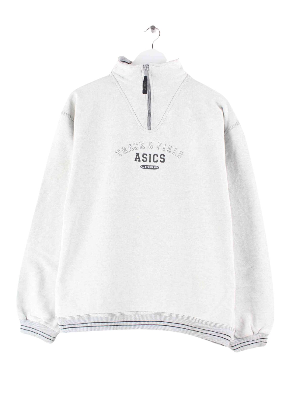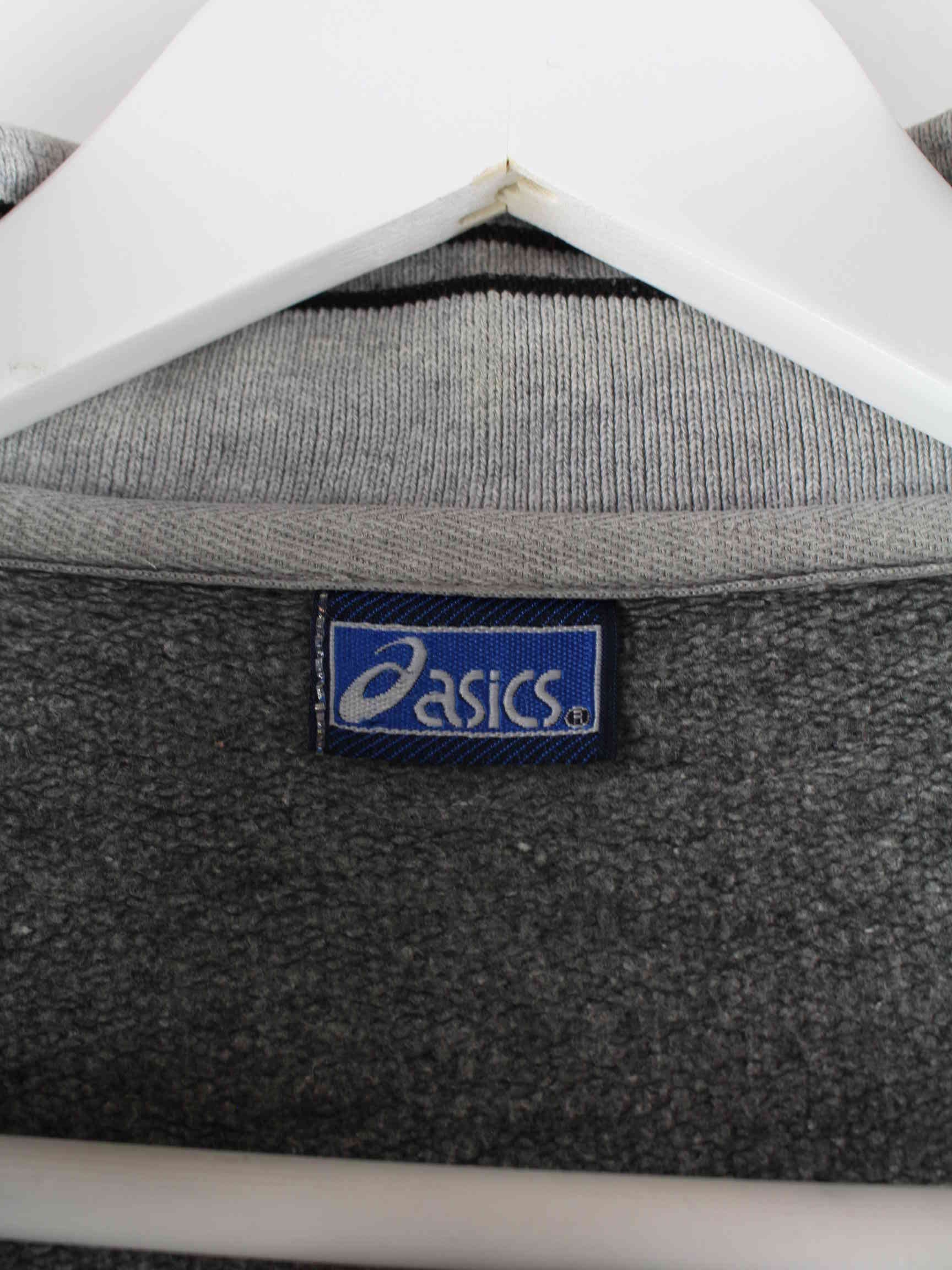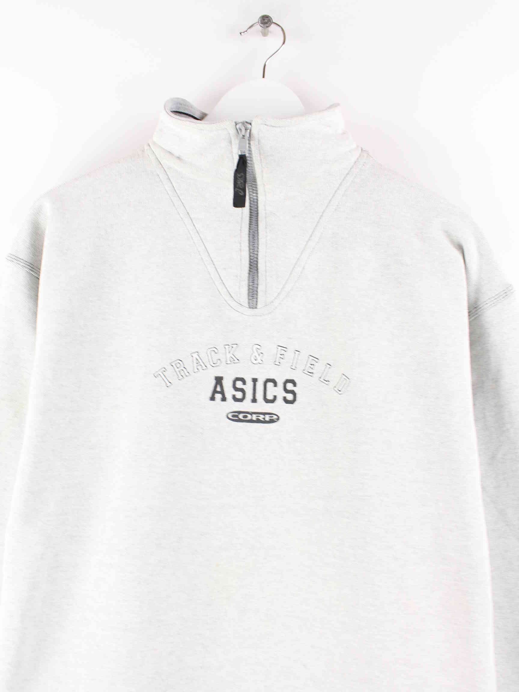 Grauer Sweater mit half Zip der Brand Asics aus den 90'ern in Größe L. Er ist aus einer Baumwollmischung hergestellt und in gutem Zustand in Stock.