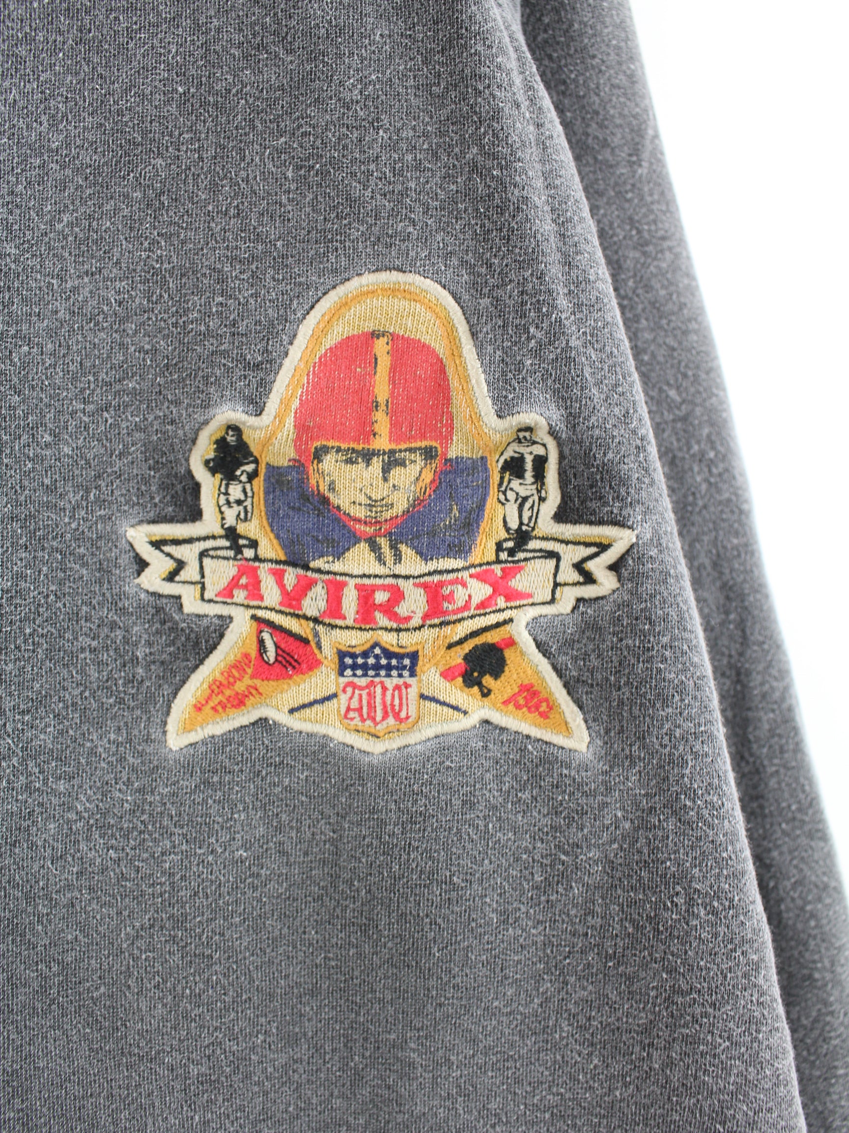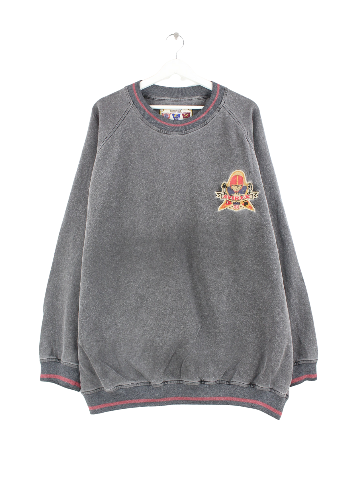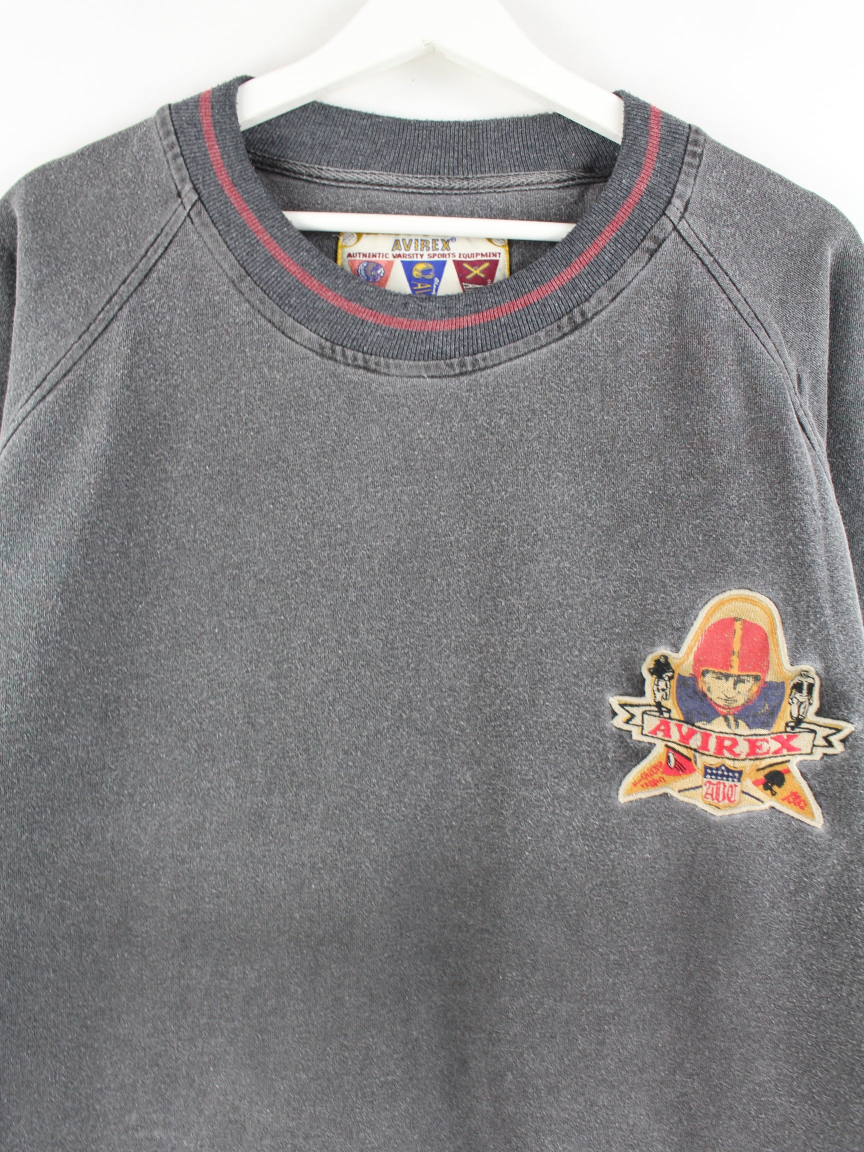 Sweater des Labels Avirex mit gestickten Motiven in Größe XXL aus den 90'ern. Er ist aus Baumwolle hergestellt und in Grau lieferbar.