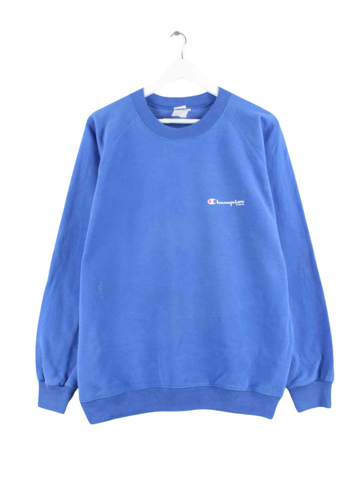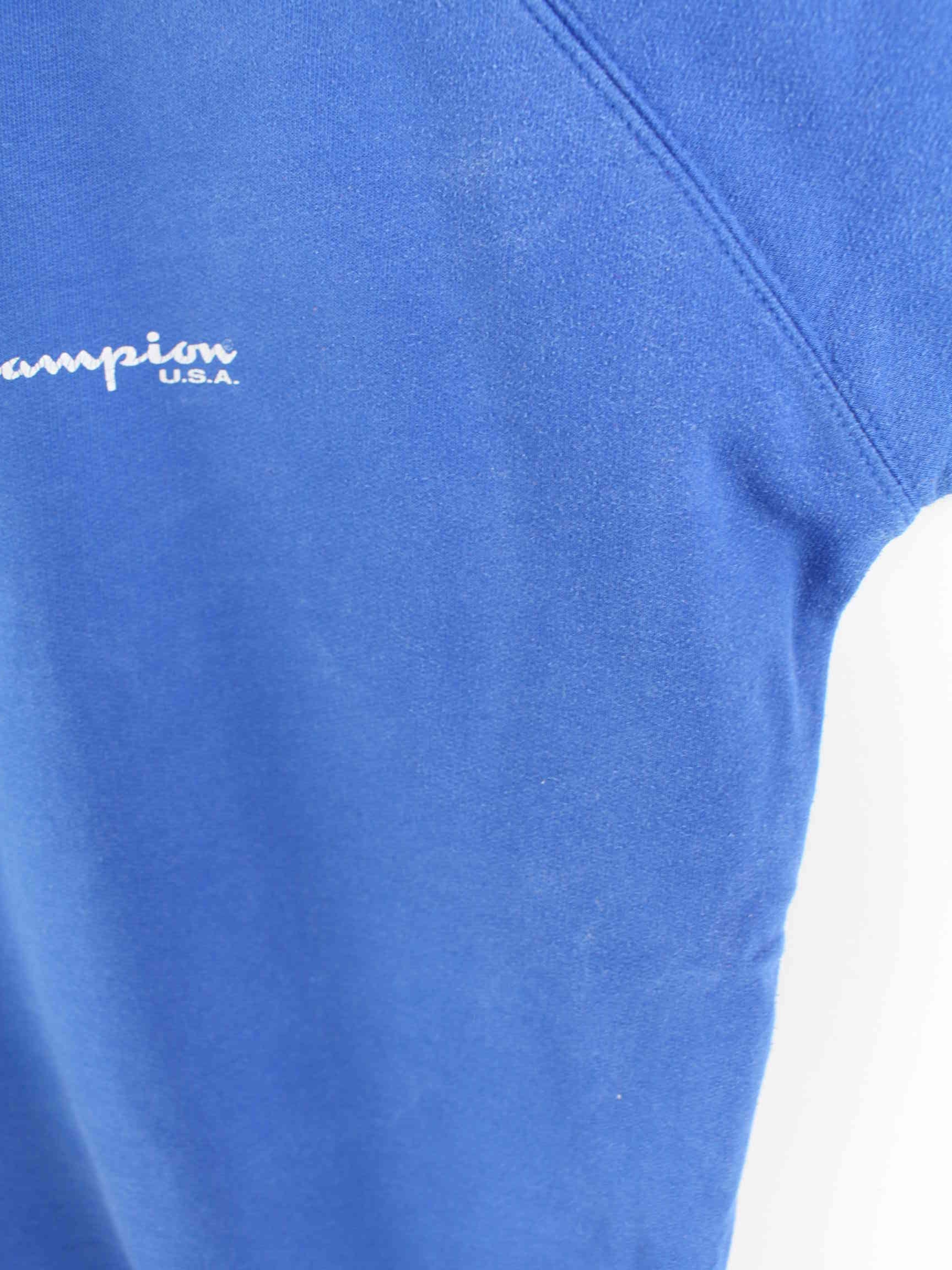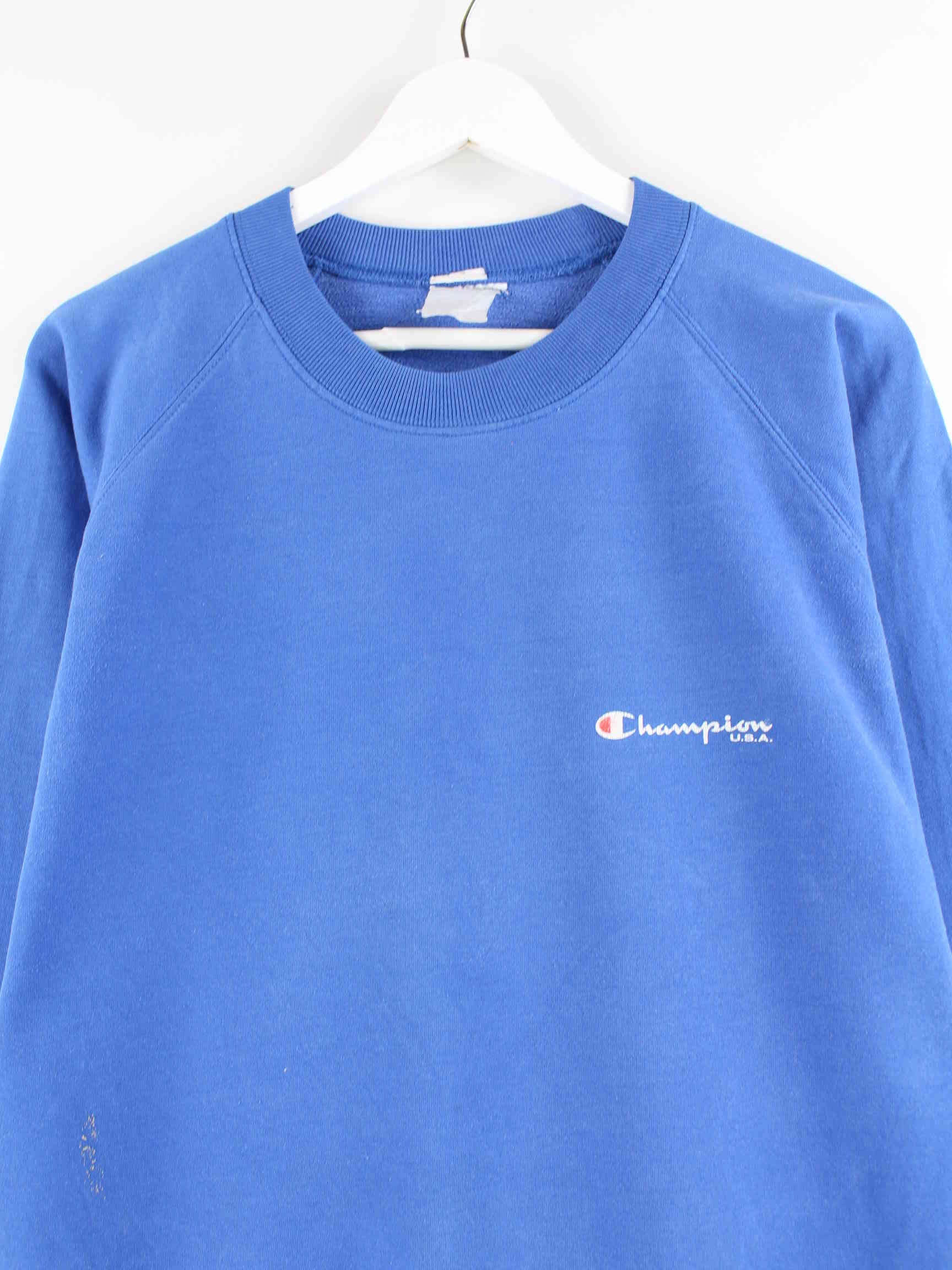Sweater der Brand Champion in Größe XL aus den 90'ern. Er ist aus einer Baumwollmischung und in Blau vorrätig. Mit tollem Vintage Print.