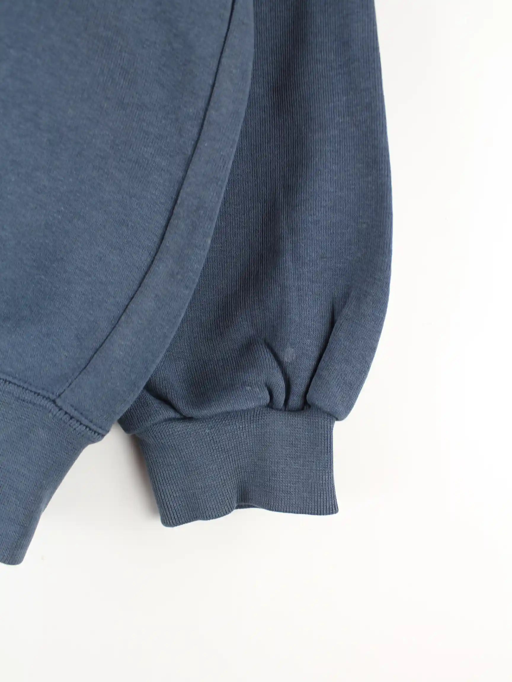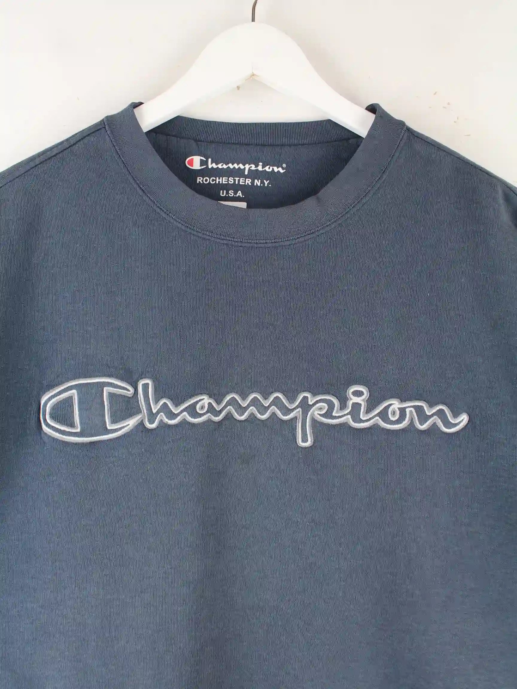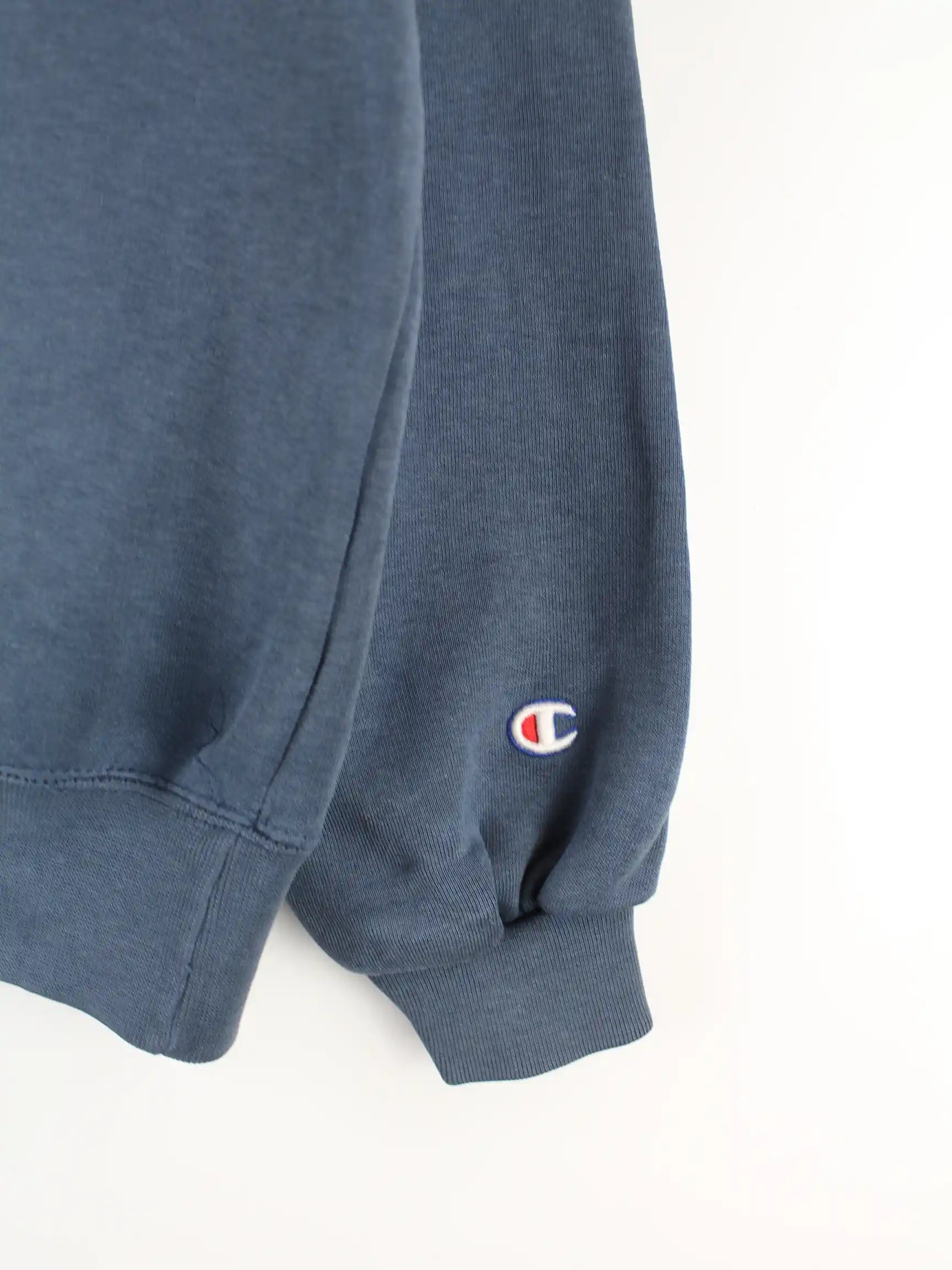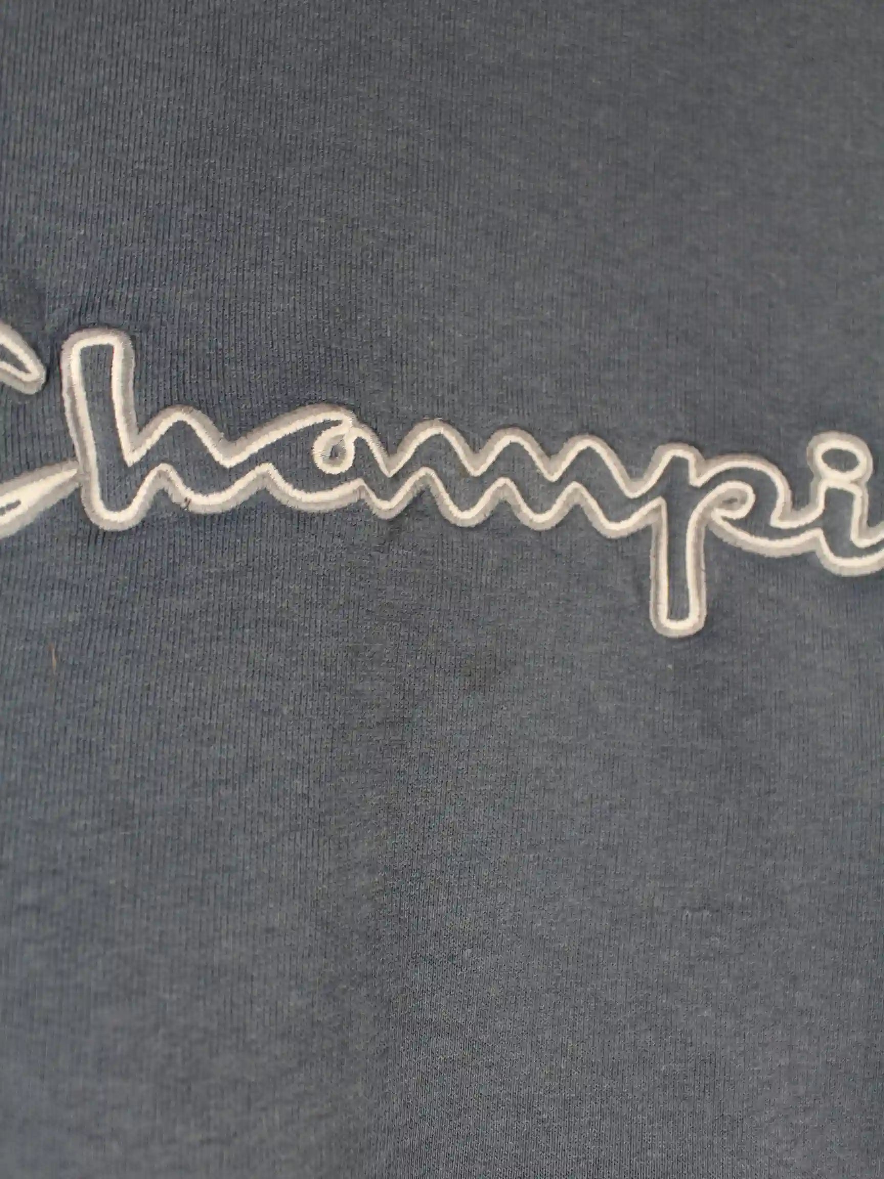 Blauer Sweater mit gesticktem Logo von Champion in Größe M. Er ist aus einer Baumwollmischung und in gutem Zustand vorrätig.