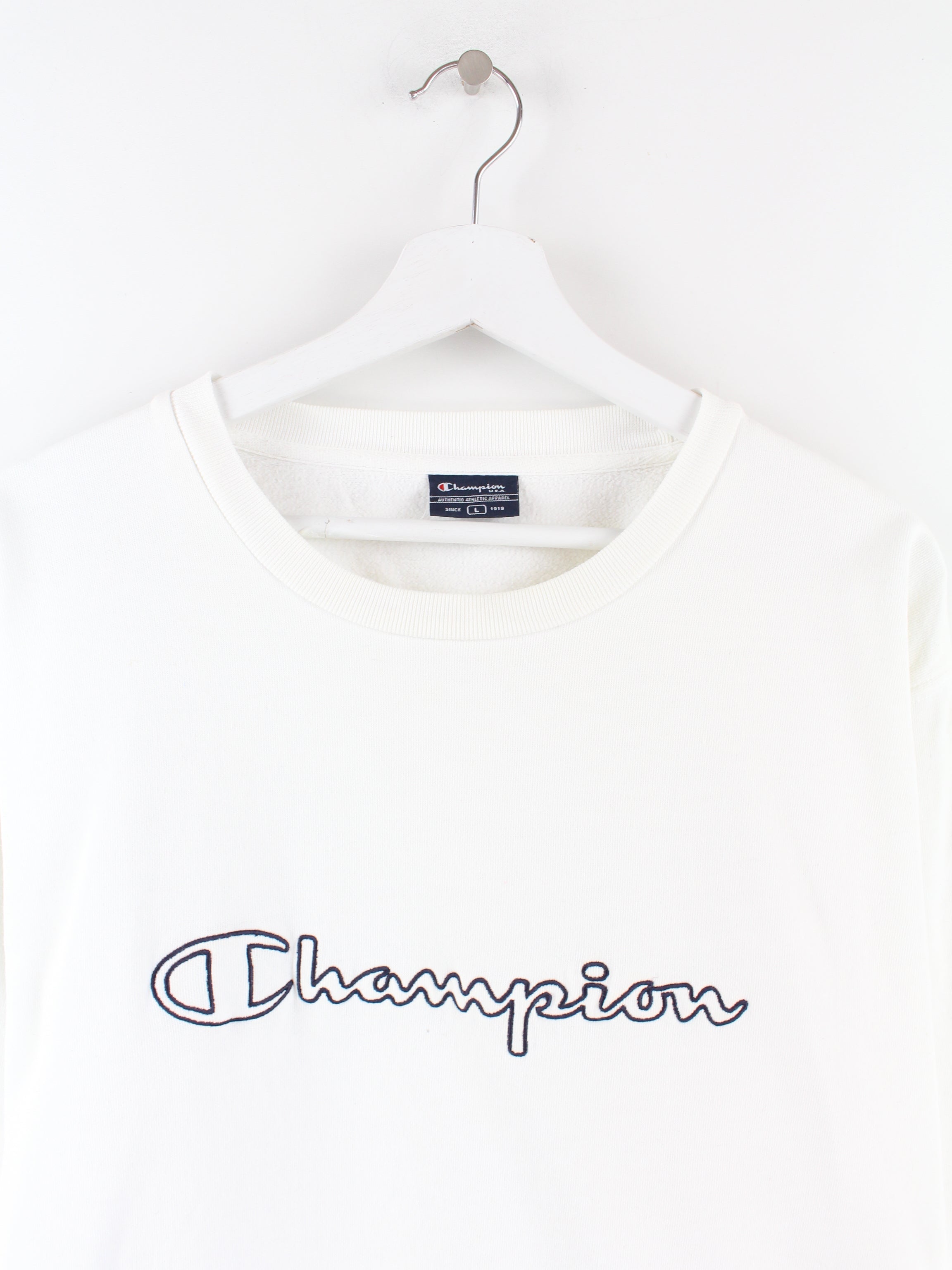 Weißer Sweater der Marke Champion mit aufgesticktem Logo.