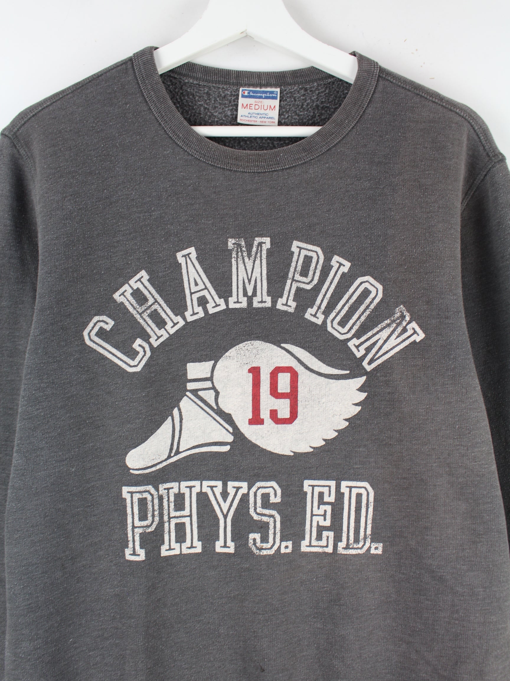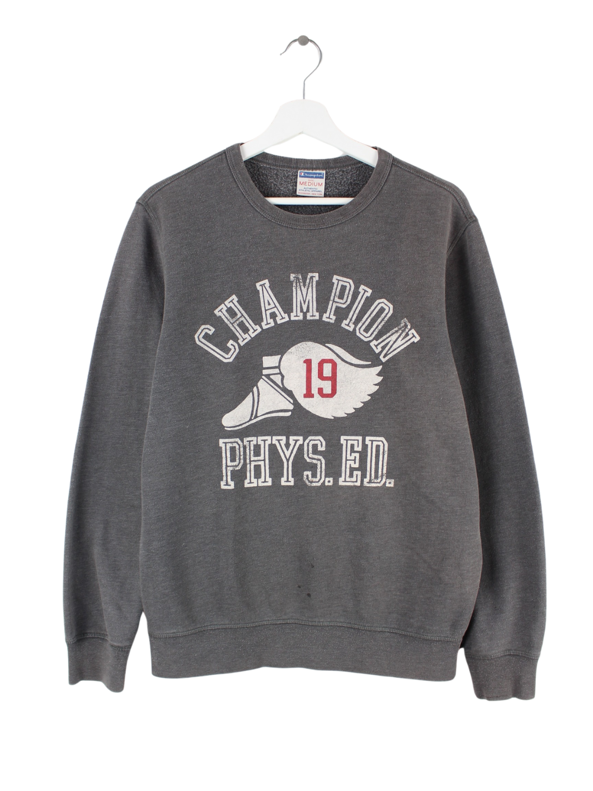 Grauer Sweater der Brand Champion in Größe M. Er ist aus einer Baumwollmischung gemacht. Den Zustand würden wir als 'In Ordnung' bezeichnen (vergl. Bilder).Mit schickem Print.