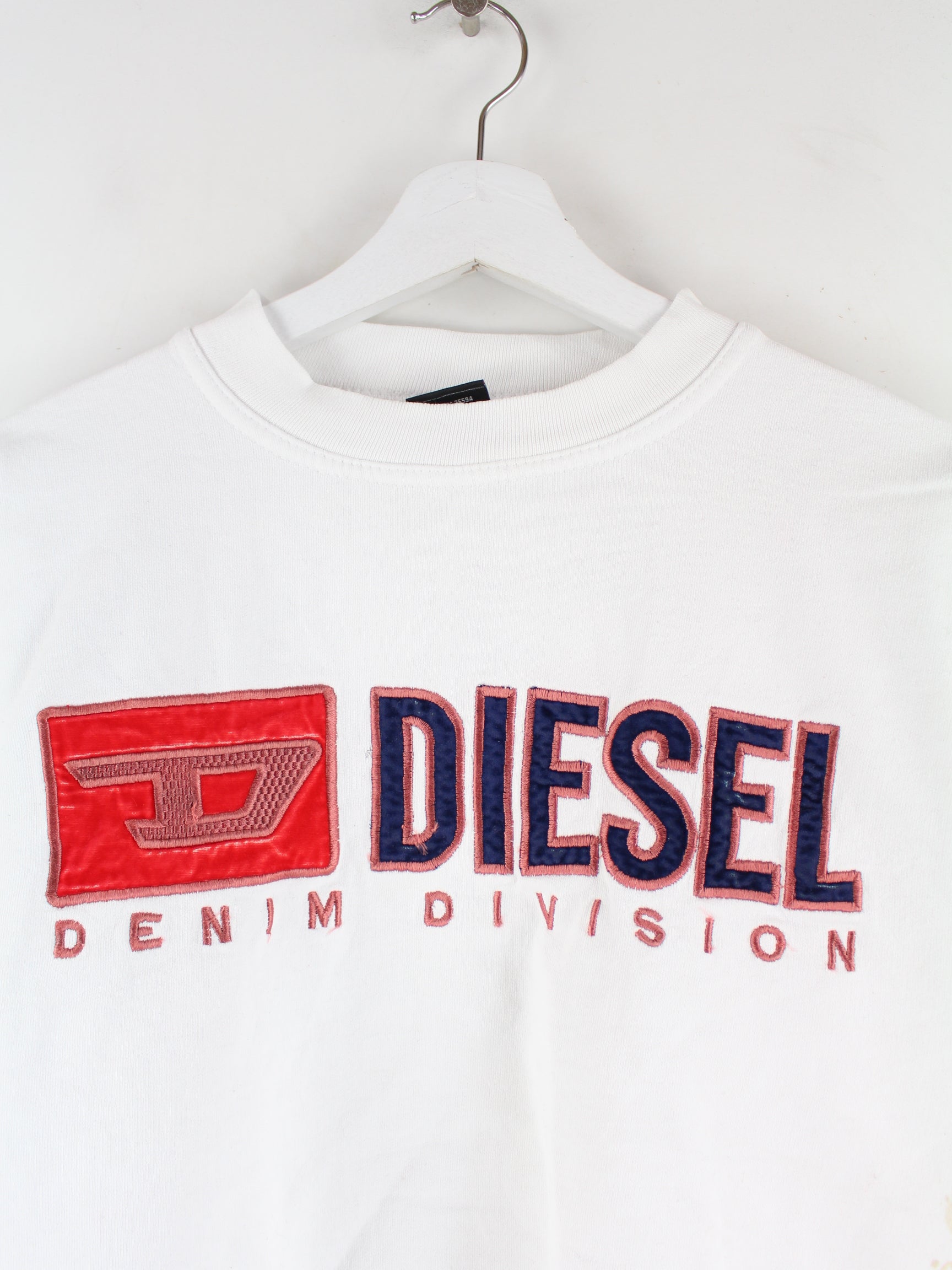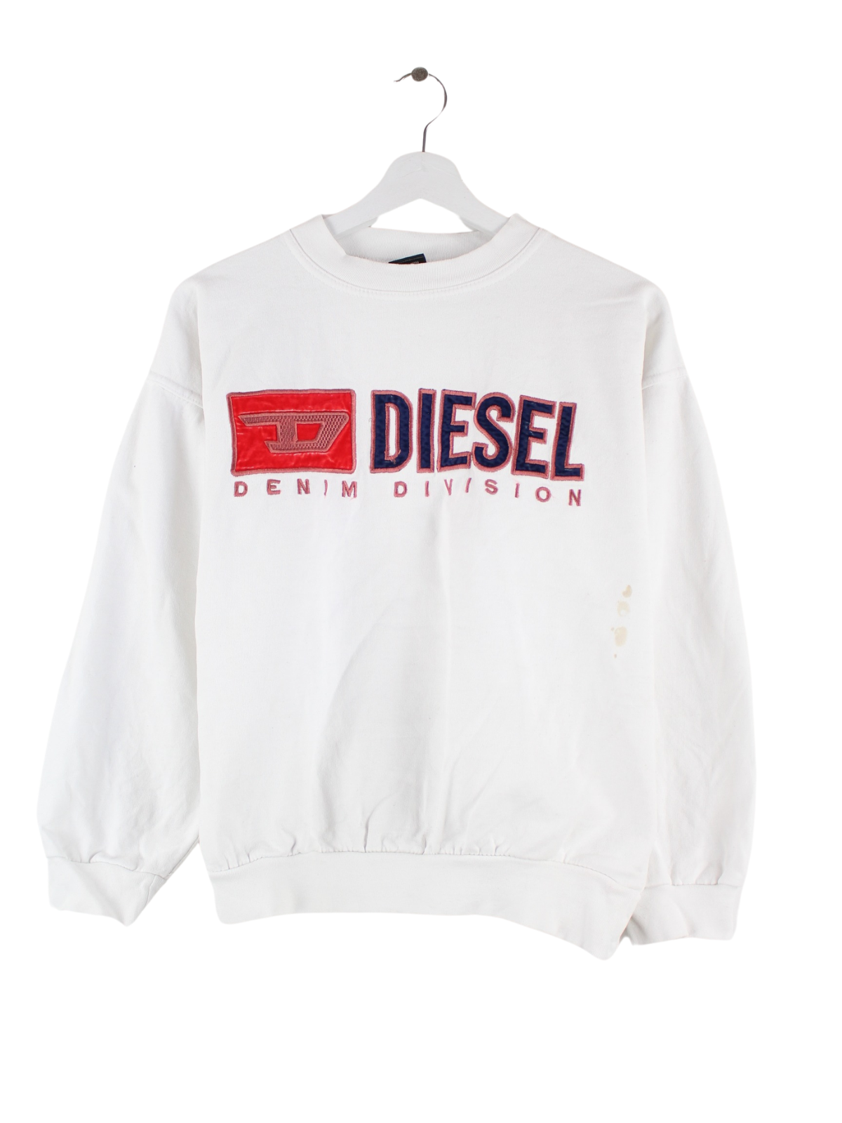 Weißer Sweater mit Stickereien von Diesel aus den 90'ern in Größe S. Er ist aus einer Baumwollmischung und in gutem Zustand vorrätig.