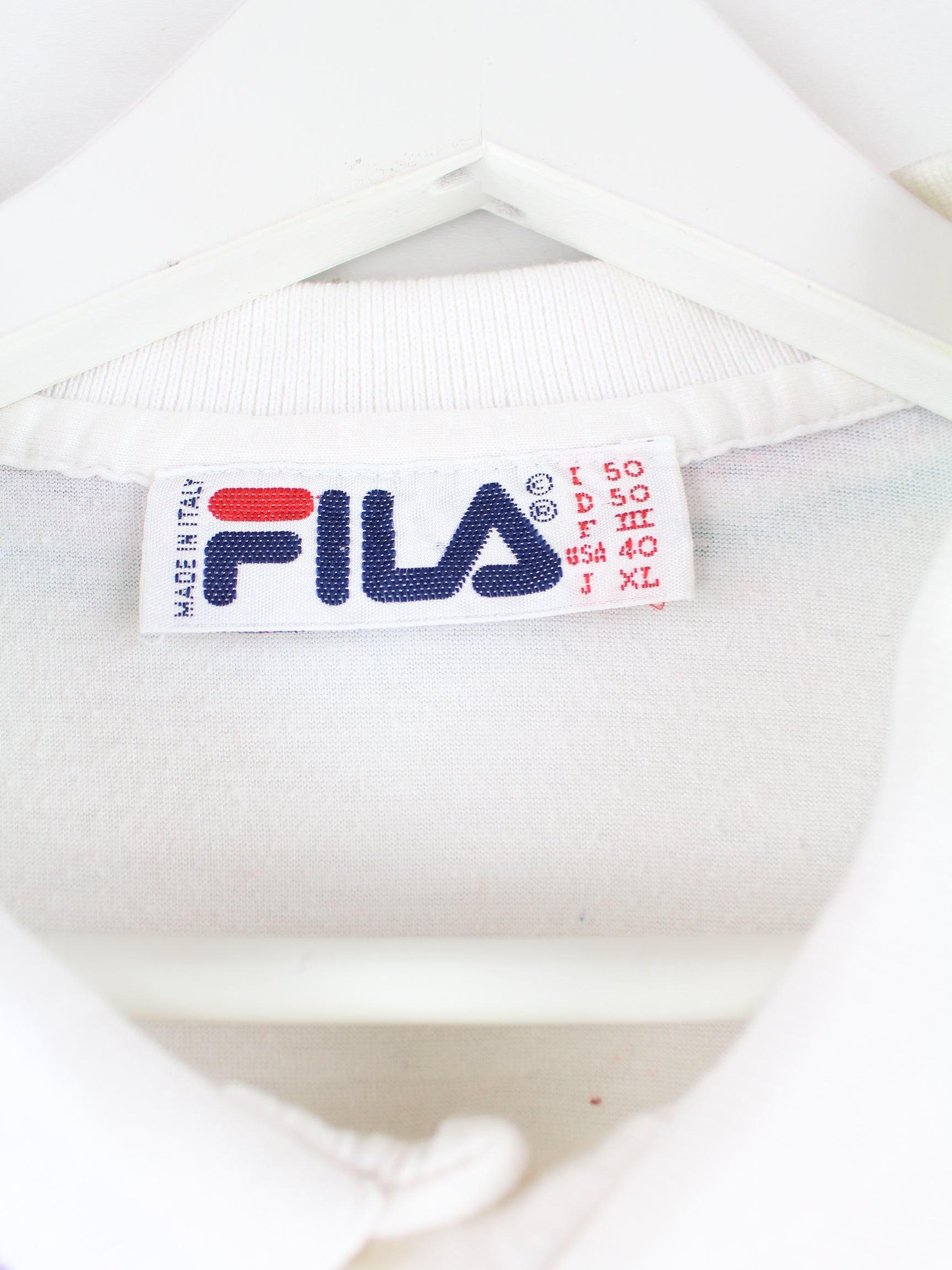 Poloshirt aus dem Hause Fila in Größe L aus den 90'ern. Es ist aus Baumwolle gefertigt und in Weiß bei uns vorrätig.