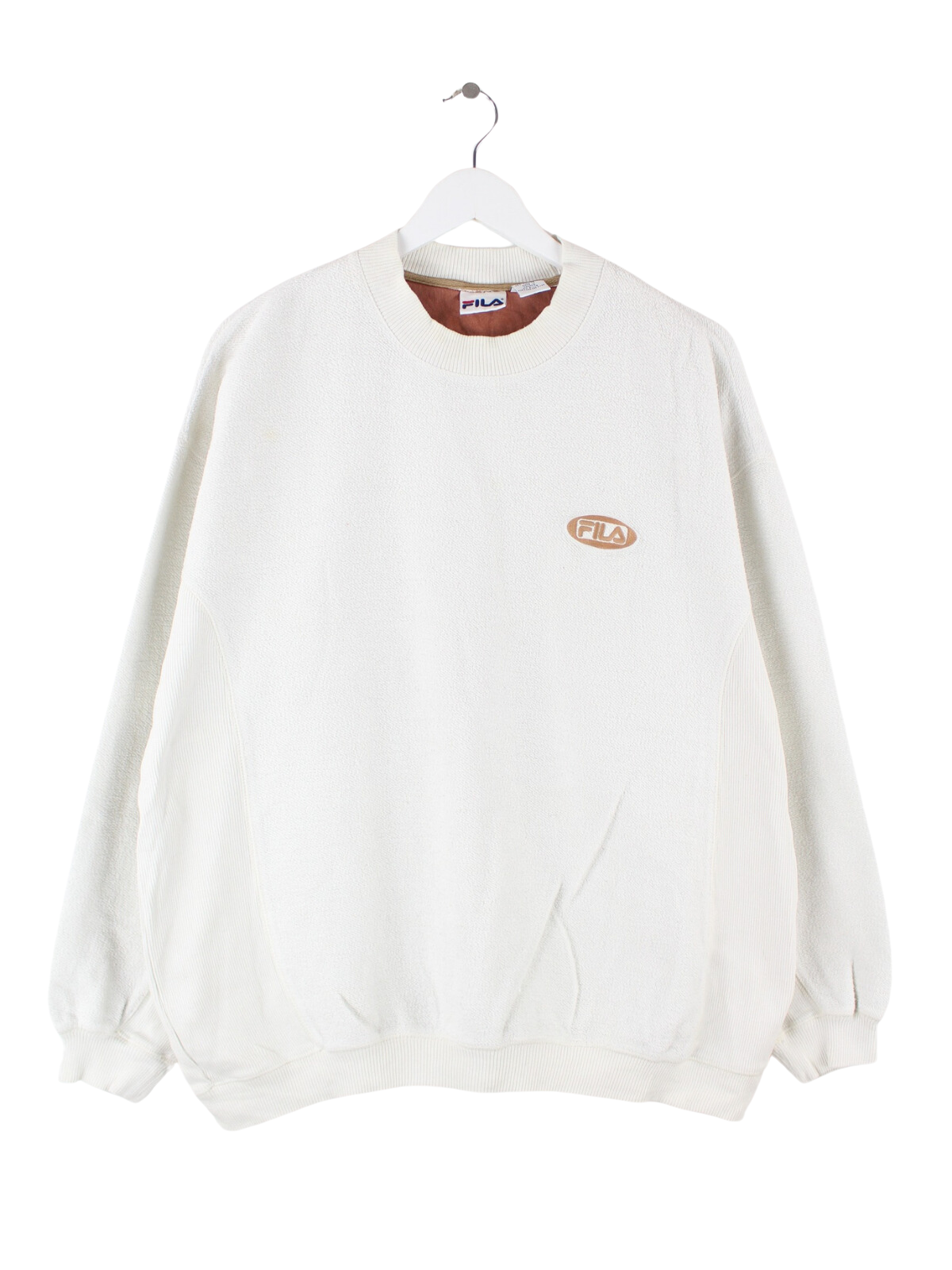 Beigefarbener Sweater der Marke Fila aus den 90'ern in Größe L. Er ist aus einer Baumwollmischung hergestellt. Den Zustand würden wir als 'In Ordnung' bezeichnen (vergl. Bilder).