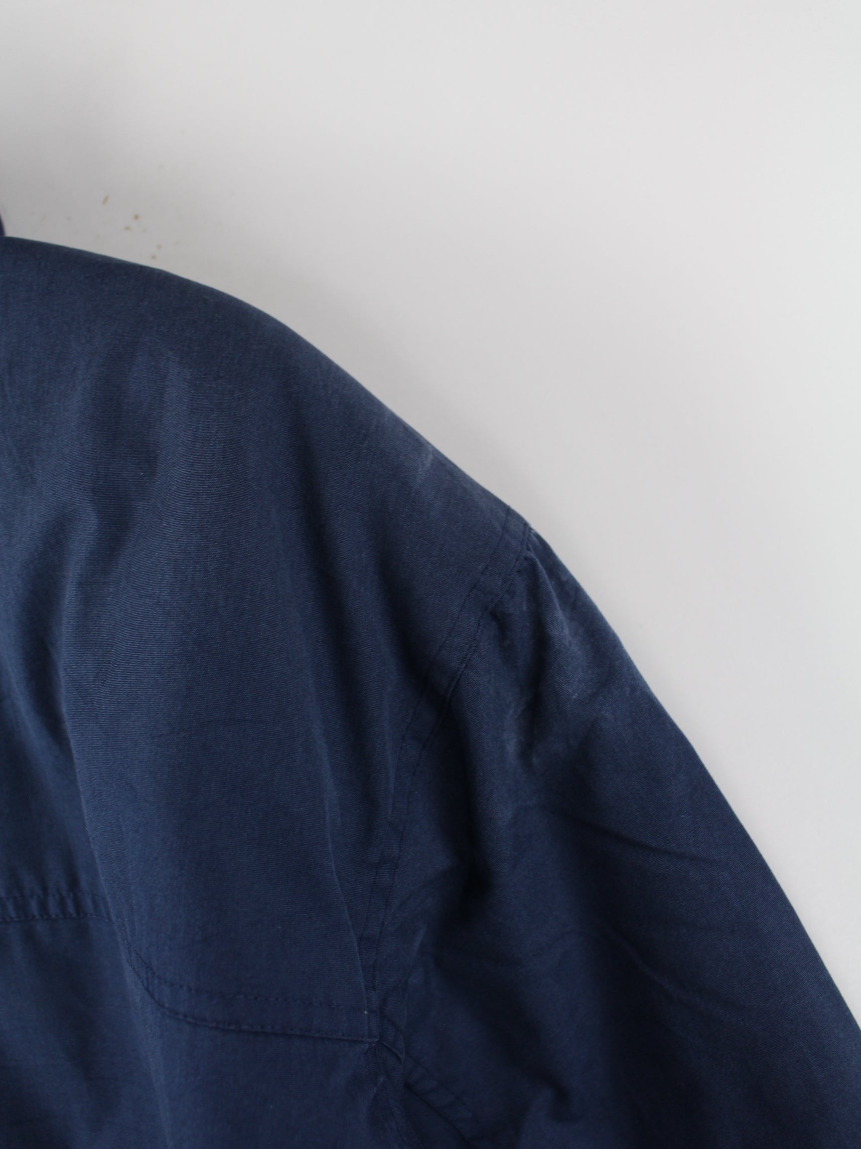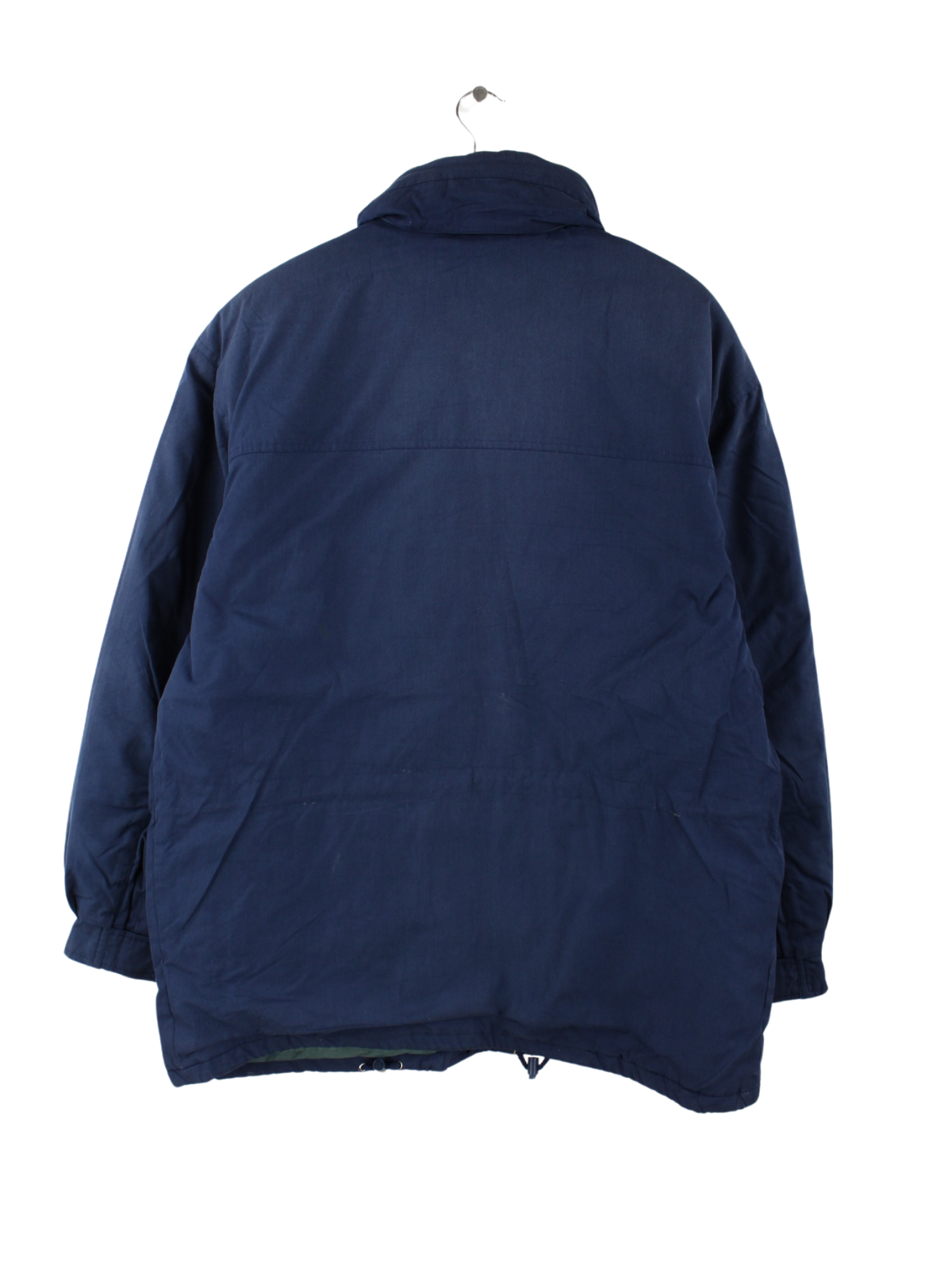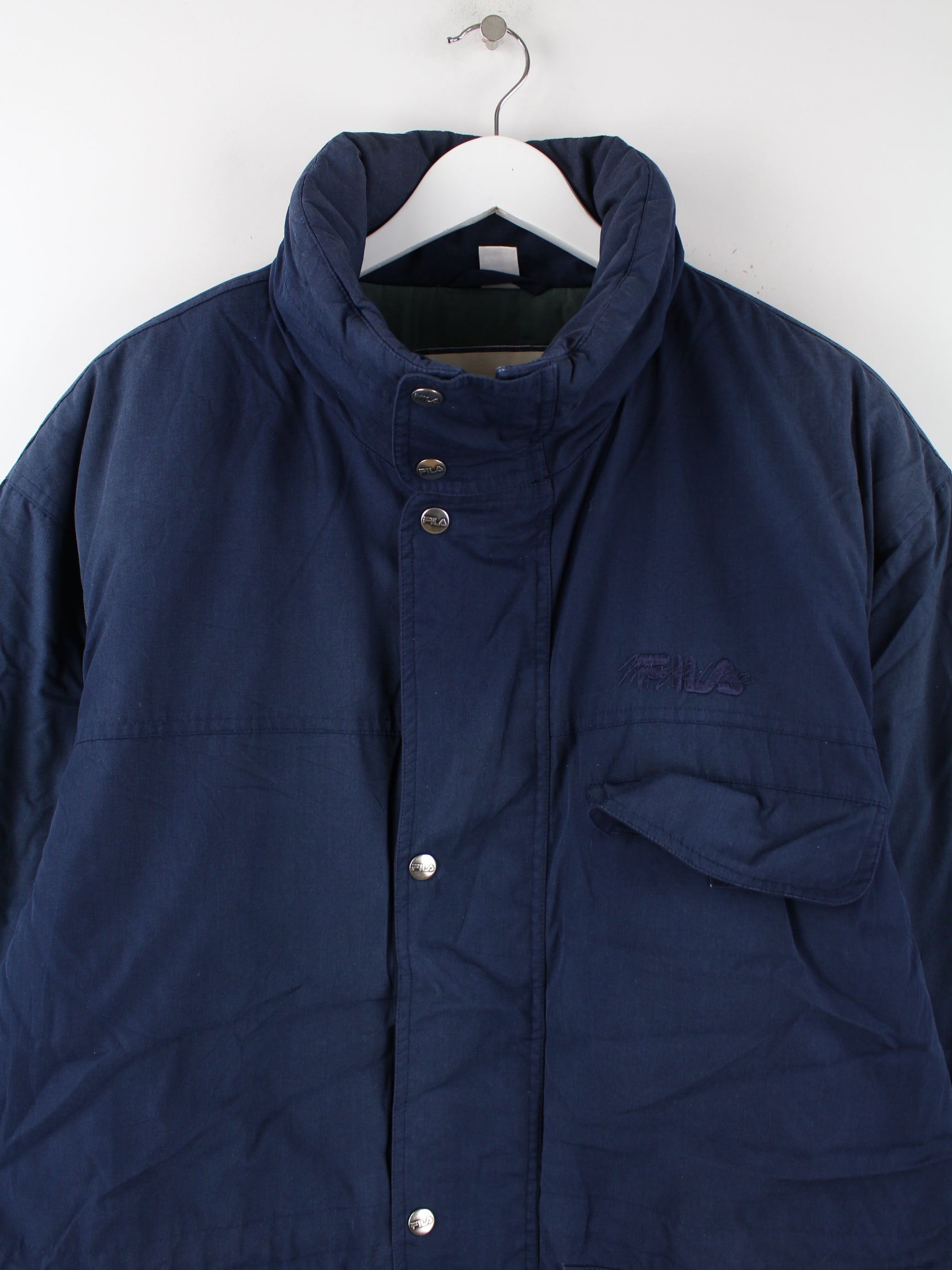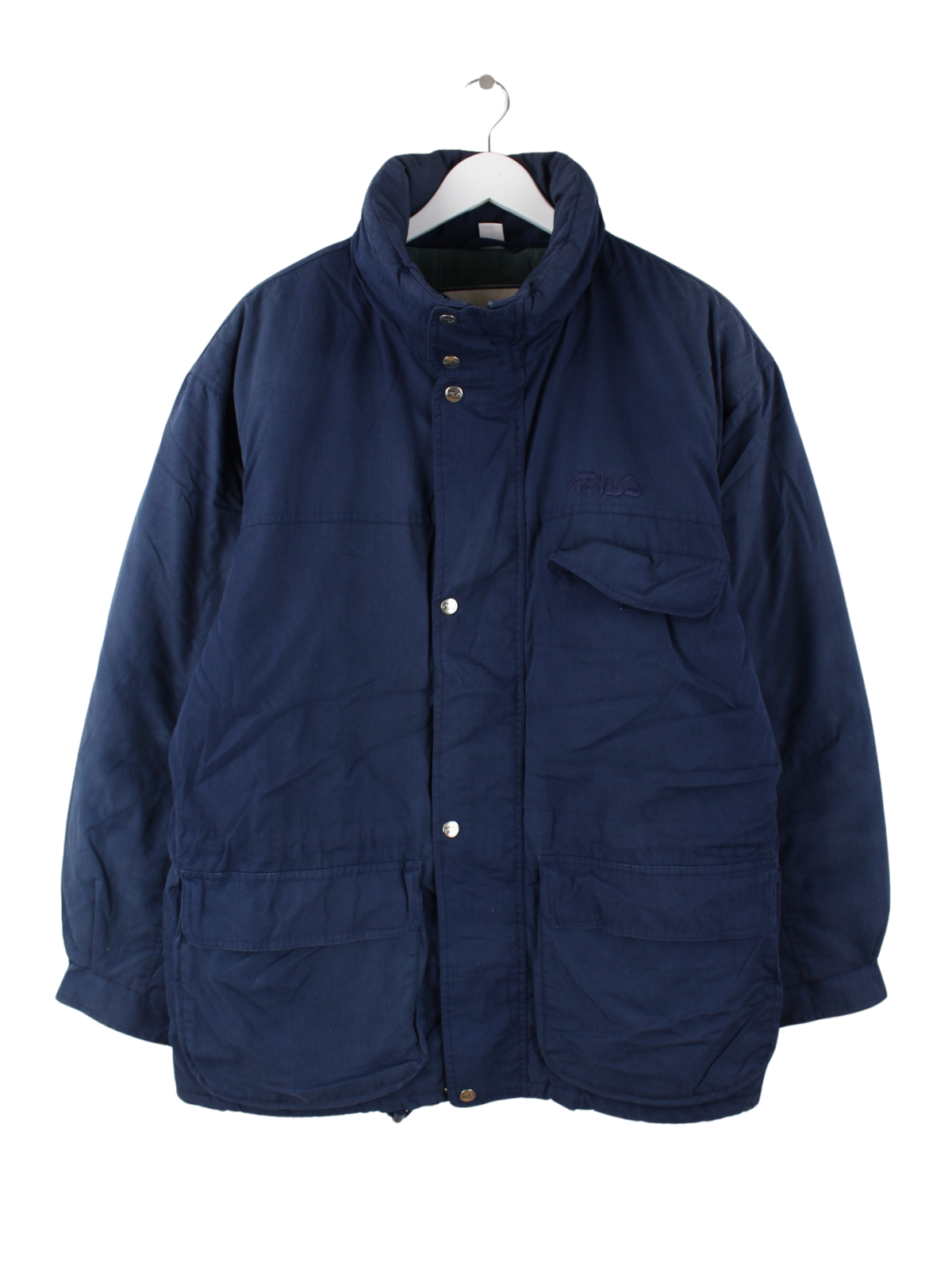 Blaue Jacke von Fila aus den 90'ern in Größe XXL. Sie ist aus Synthetik produziert und in gutem Zustand bei uns vorrätig.