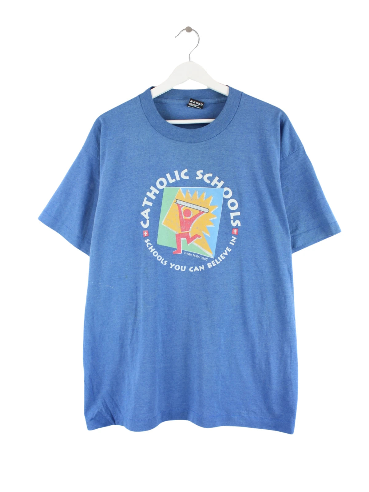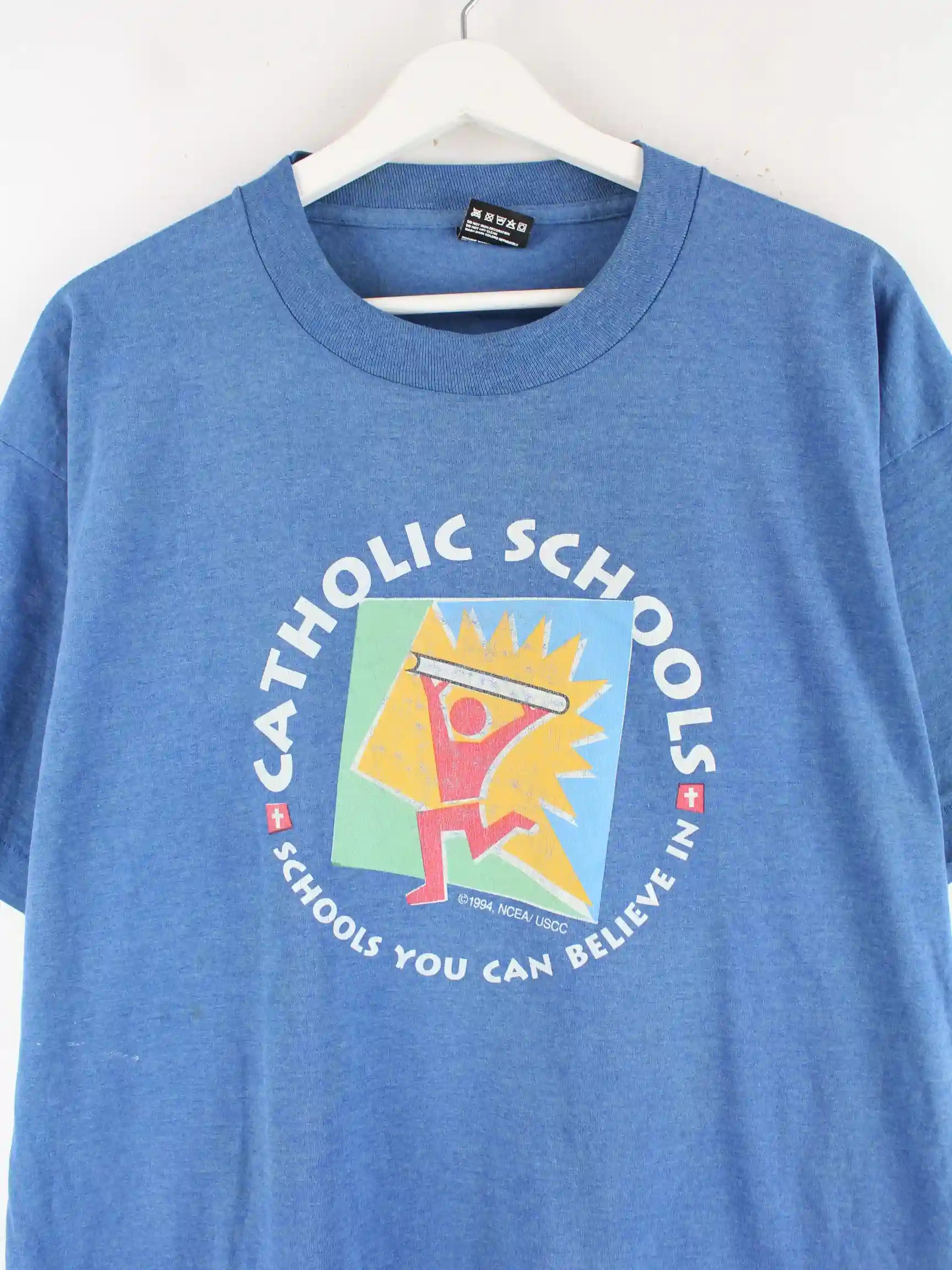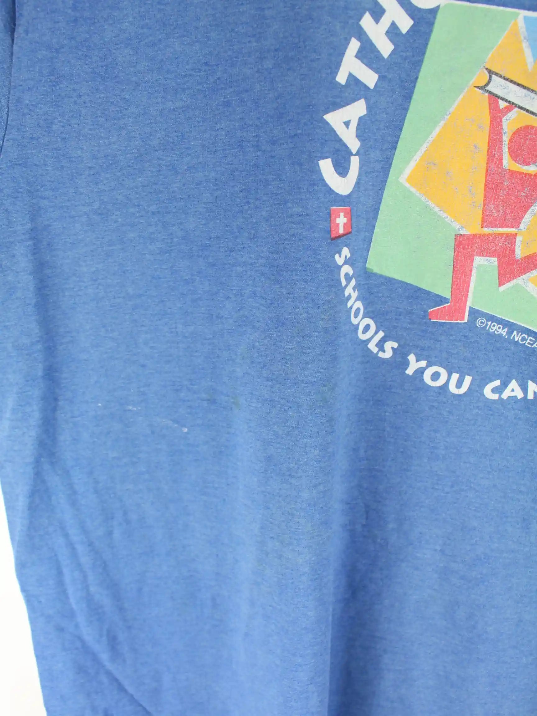 Fruit of the Loom 1994 Vintage Chatolic Print Single Stitch T-Shirt Blau XL