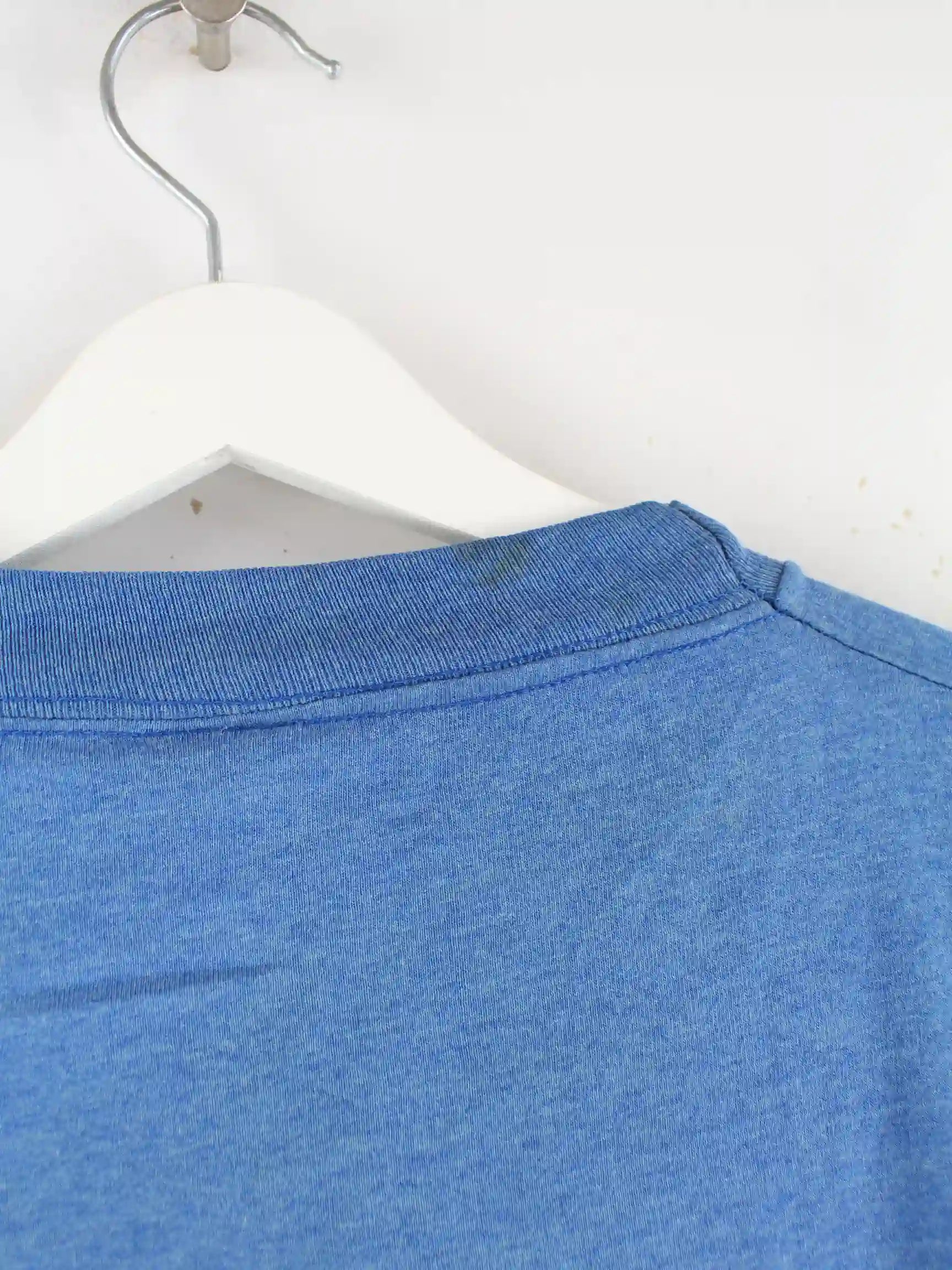 Blaues T-Shirt des Labels Fruit of the Loom in Größe XL. Es ist aus Baumwolle angefertigt. Den Zustand würden wir als 'In Ordnung' bezeichnen (vergl. Bilder).Mit seltenem Chatolic Print.