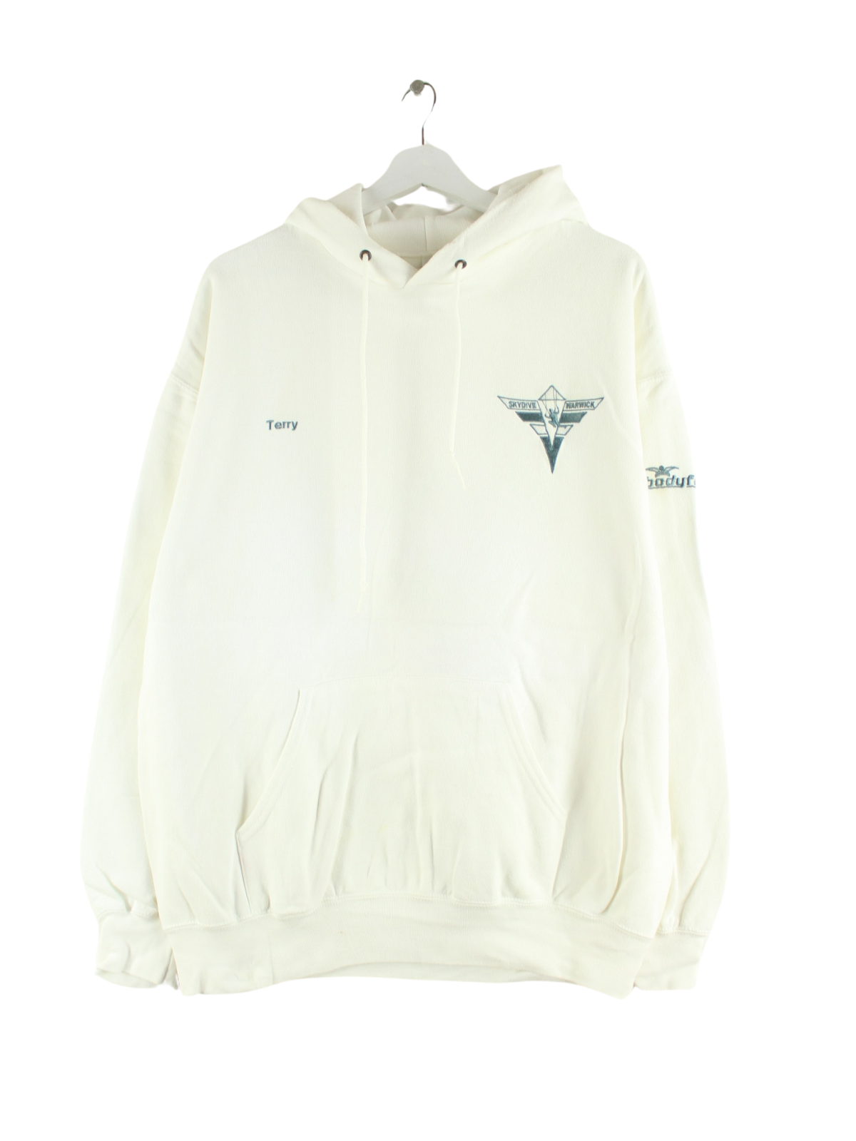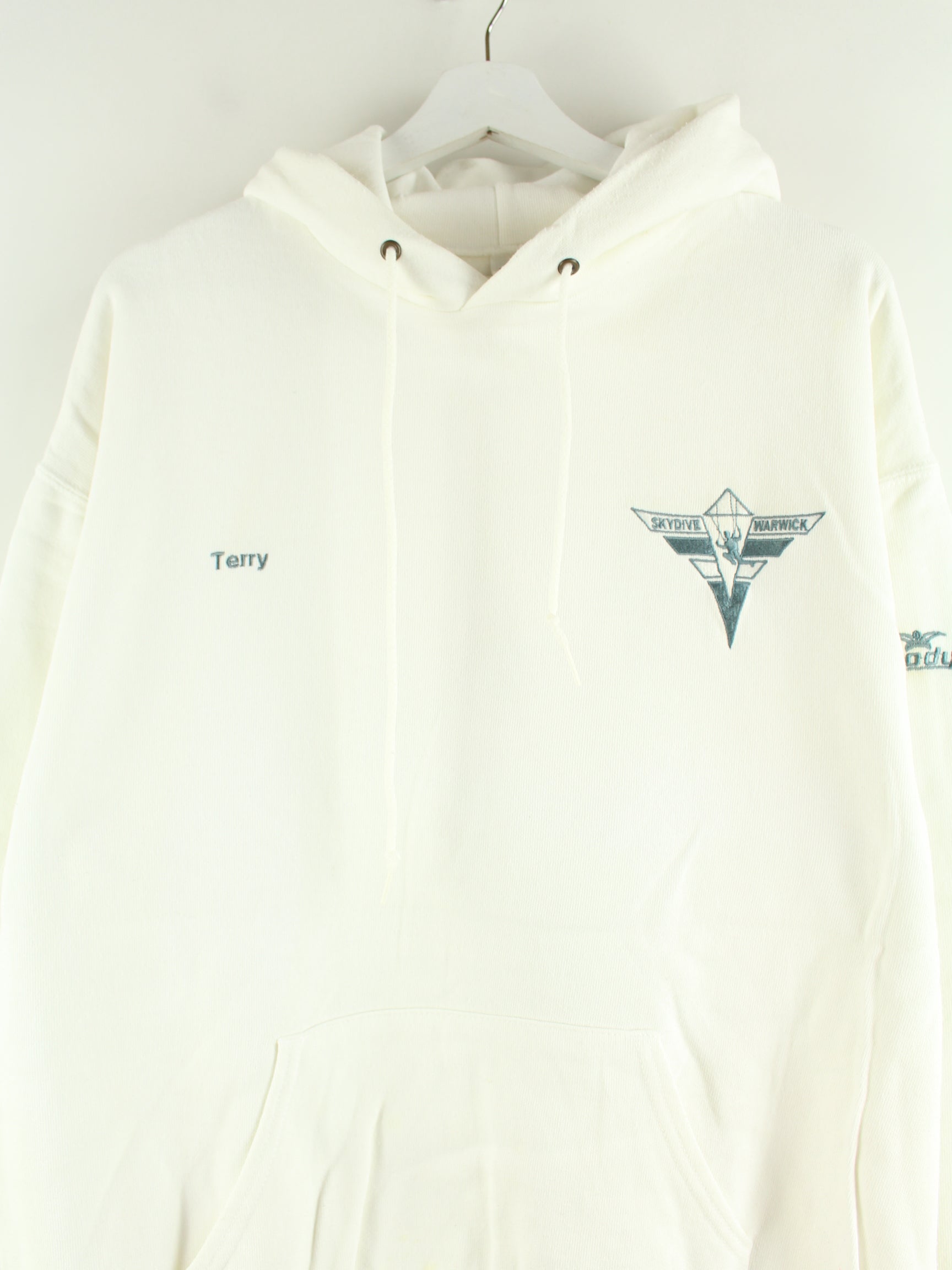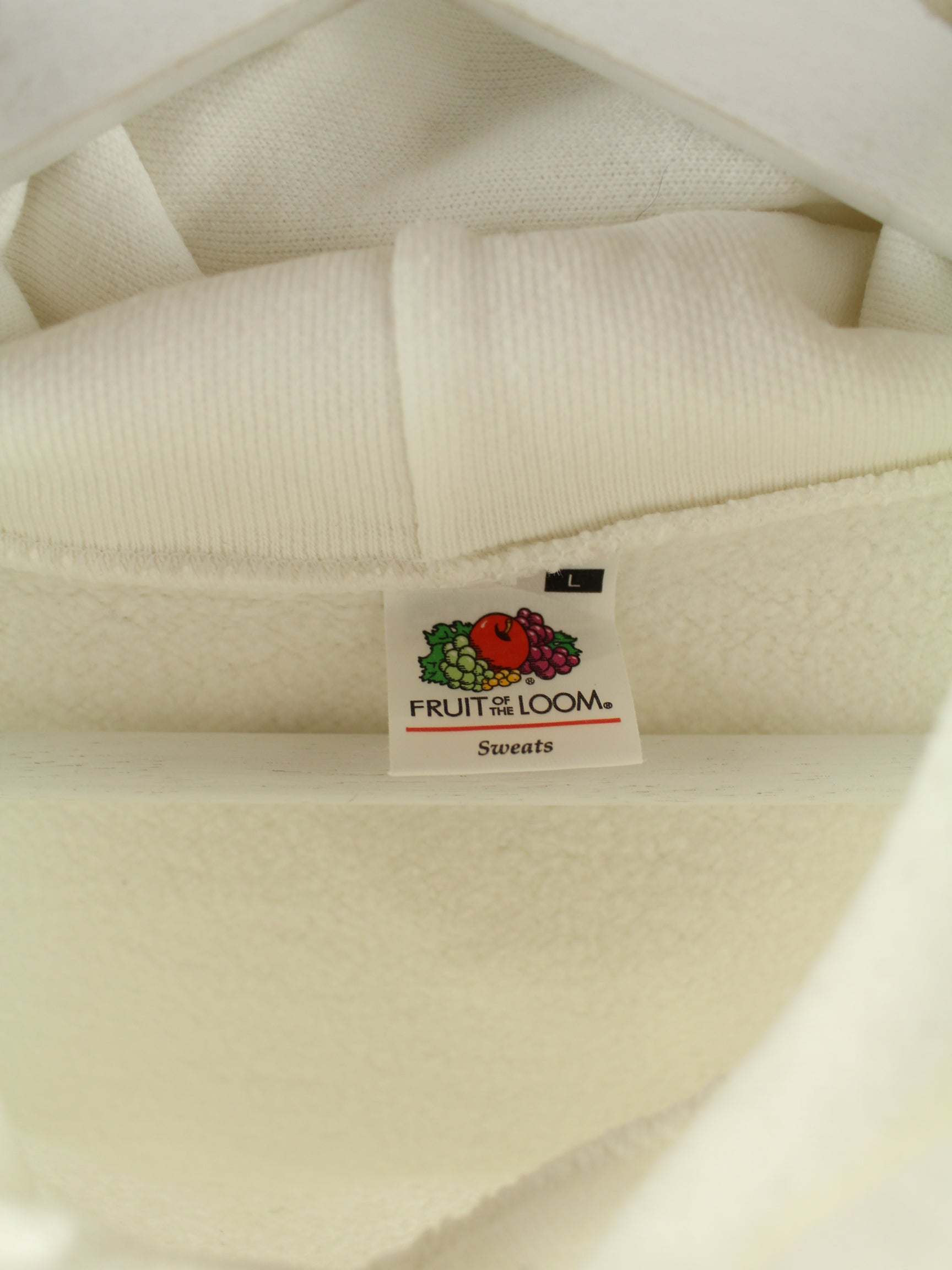 Weißer Hoodie von Fruit of the Loom in Größe L. Er ist aus einer Baumwollmischung und in gutem Zustand im Bestand. Mit seltenem Skydiving Print.
