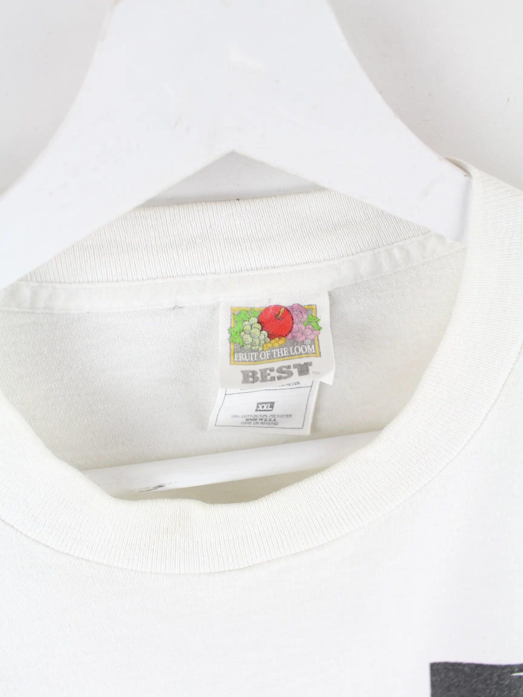 T-Shirt der Brand Fruit of the Loom in Größe XXL aus den 90'ern. Es ist aus Baumwolle gefertigt und in Weiß in Stock. Mit seltenem Free Print.