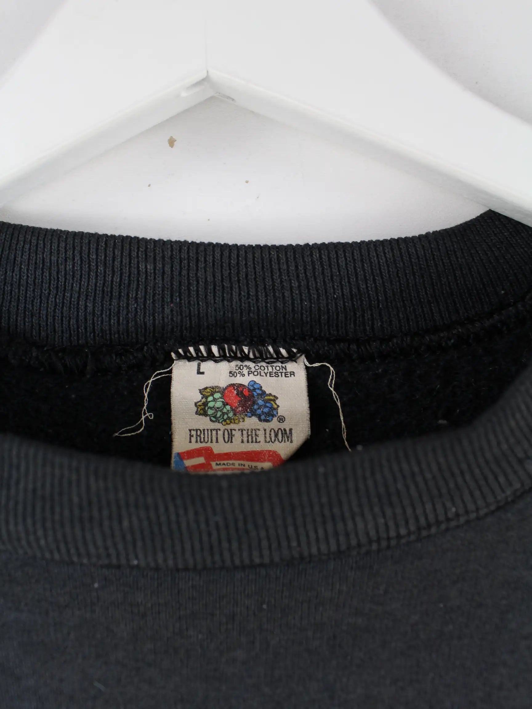 Sweater vom Label Fruit of the Loom mit gesticktem Logo in Größe L aus den 90'ern. Er ist aus einer Baumwollmischung hergestellt und in Schwarz zu bekommen.