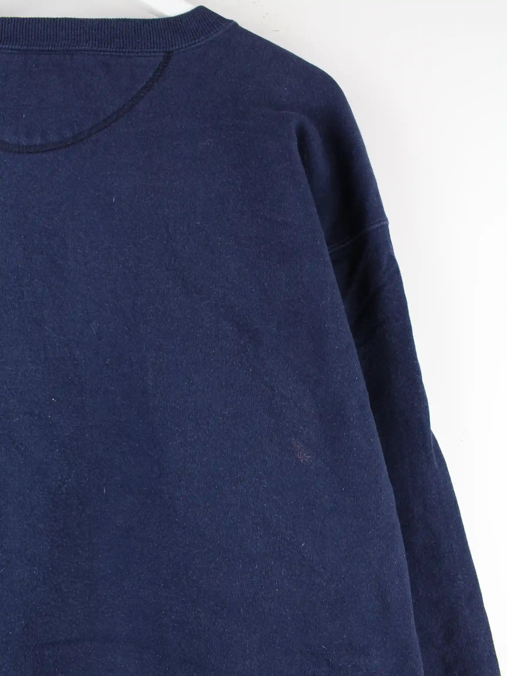 Sweater des Labels Genus mit gestickten Motiven in Größe 3XL aus den 90'ern. Er ist aus einer Baumwollmischung angefertigt und in Blau in Stock.