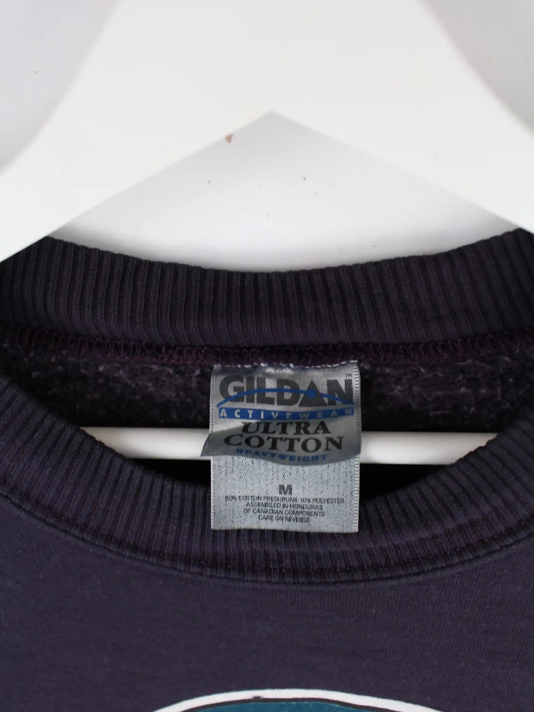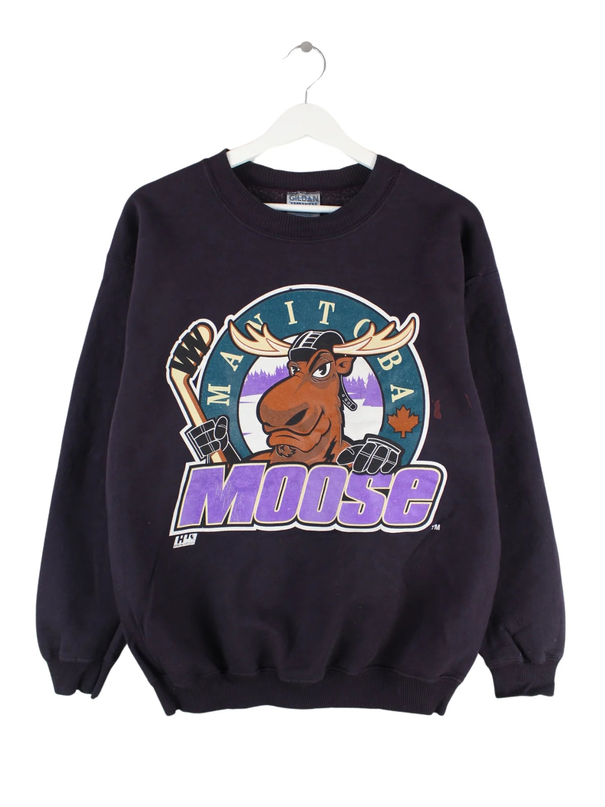 Sweater vom Brand Gildan in Größe M aus den 90'ern. Er ist aus einer Baumwollmischung produziert und in Blau in Stock. Mit schickem Moose Print.