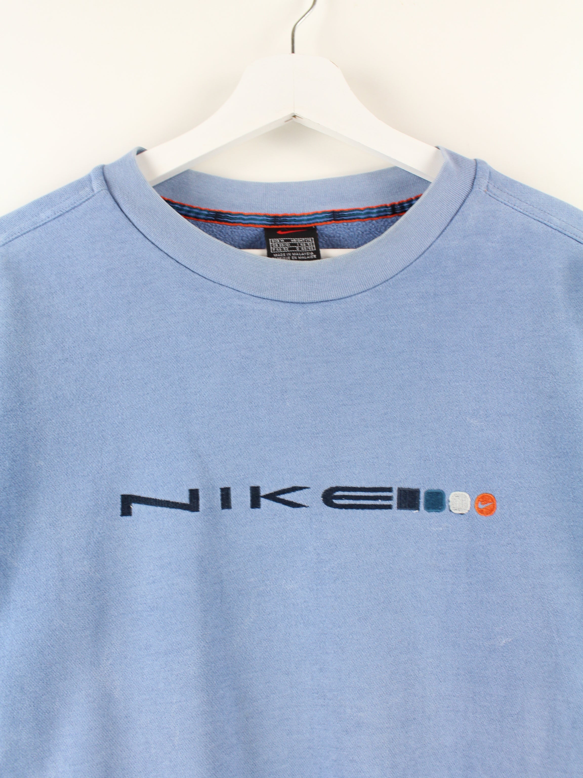 Blauer Vintage Nike Sweater mit aufgesticktem Logo.
