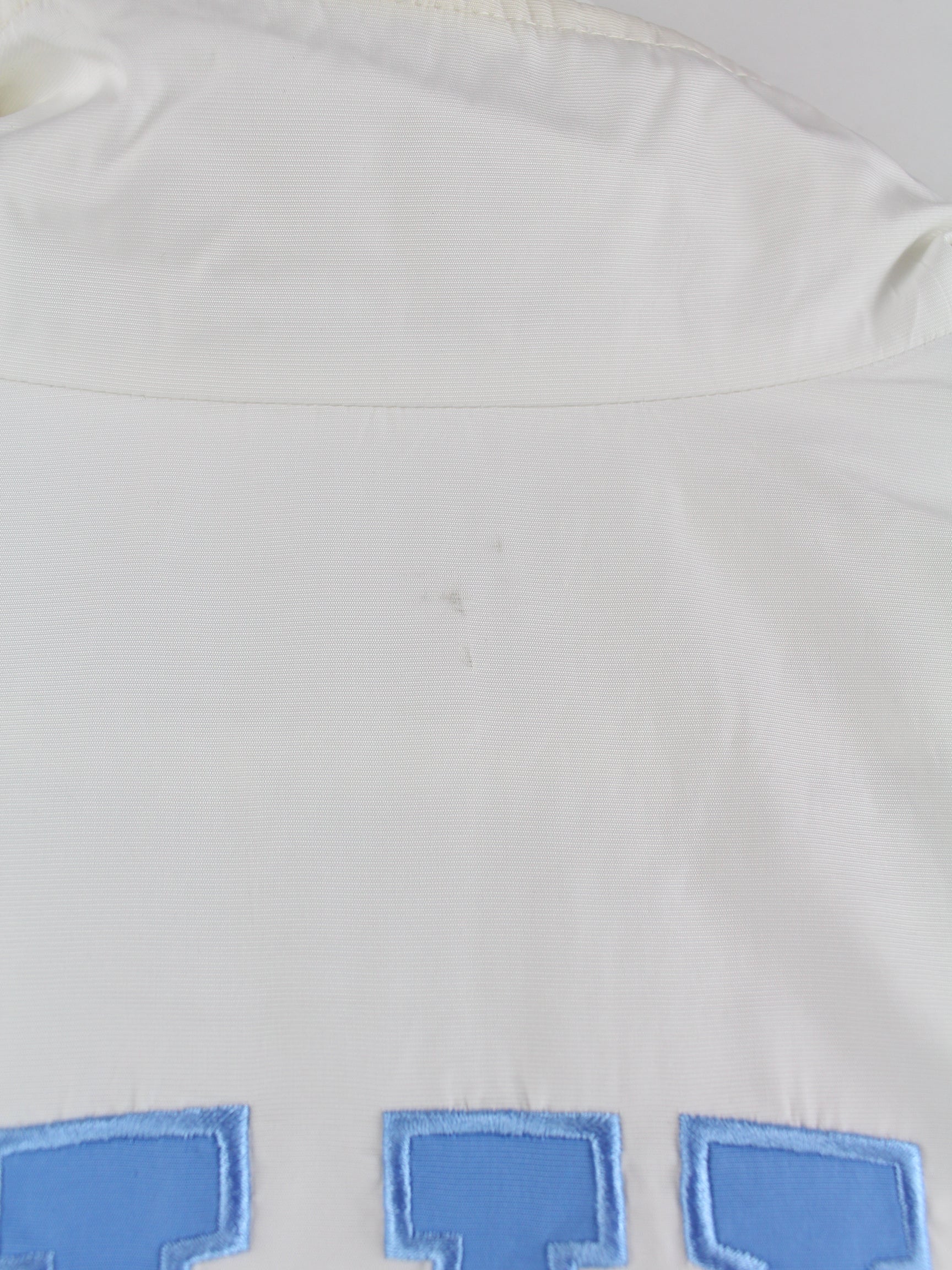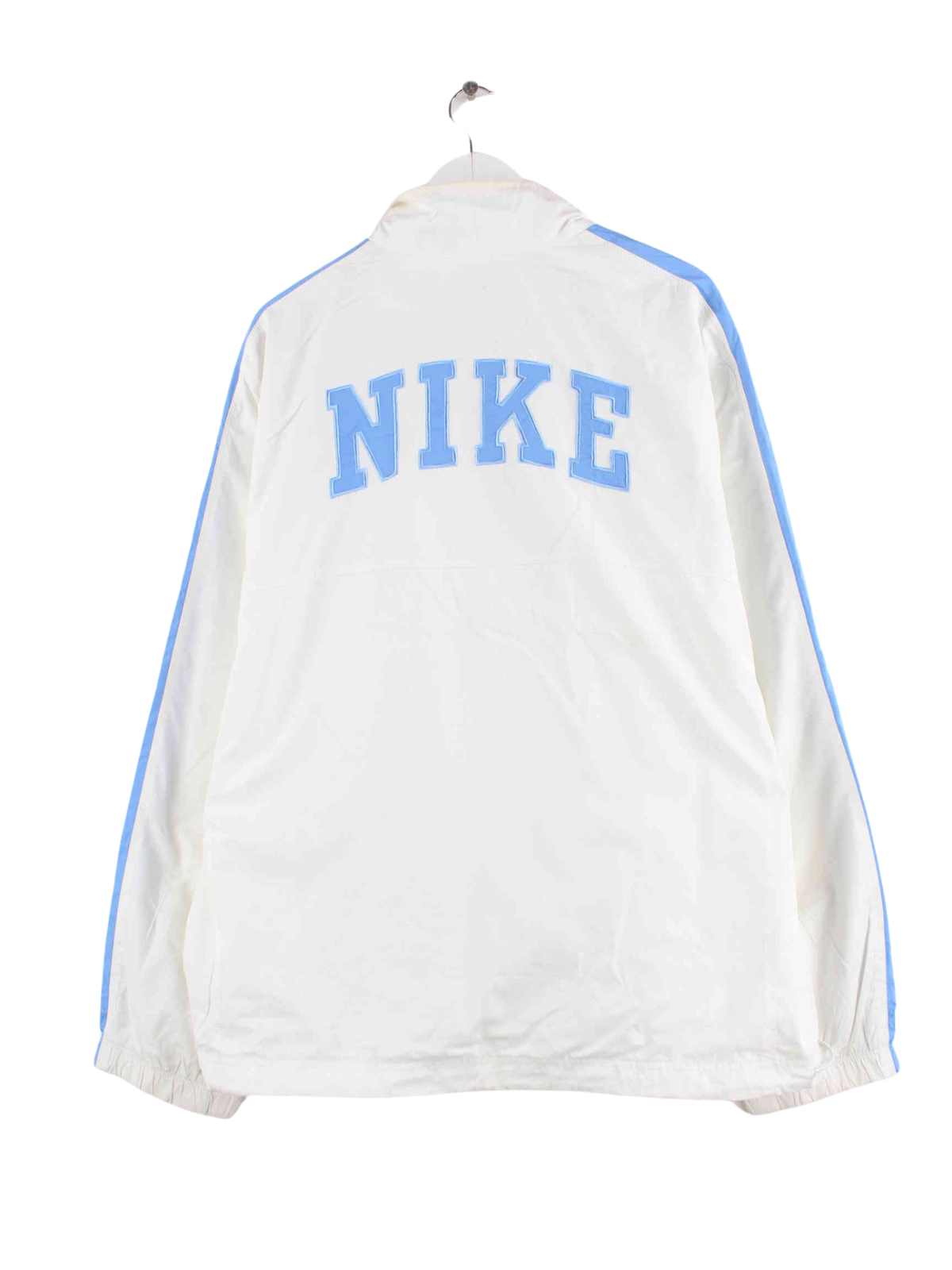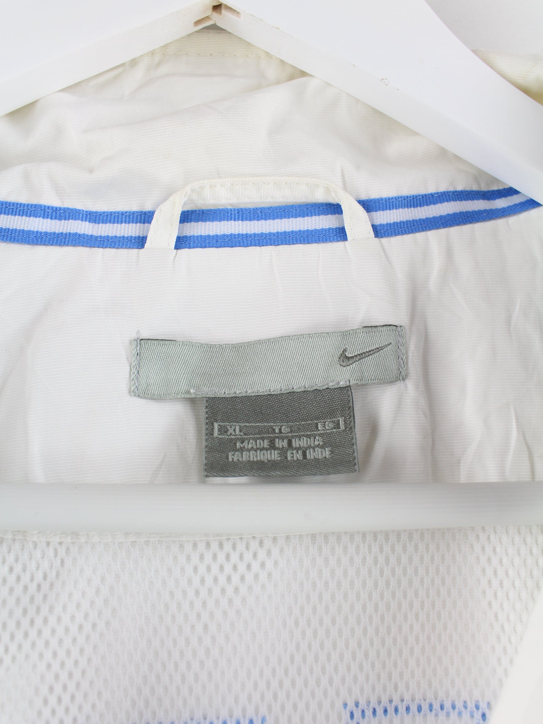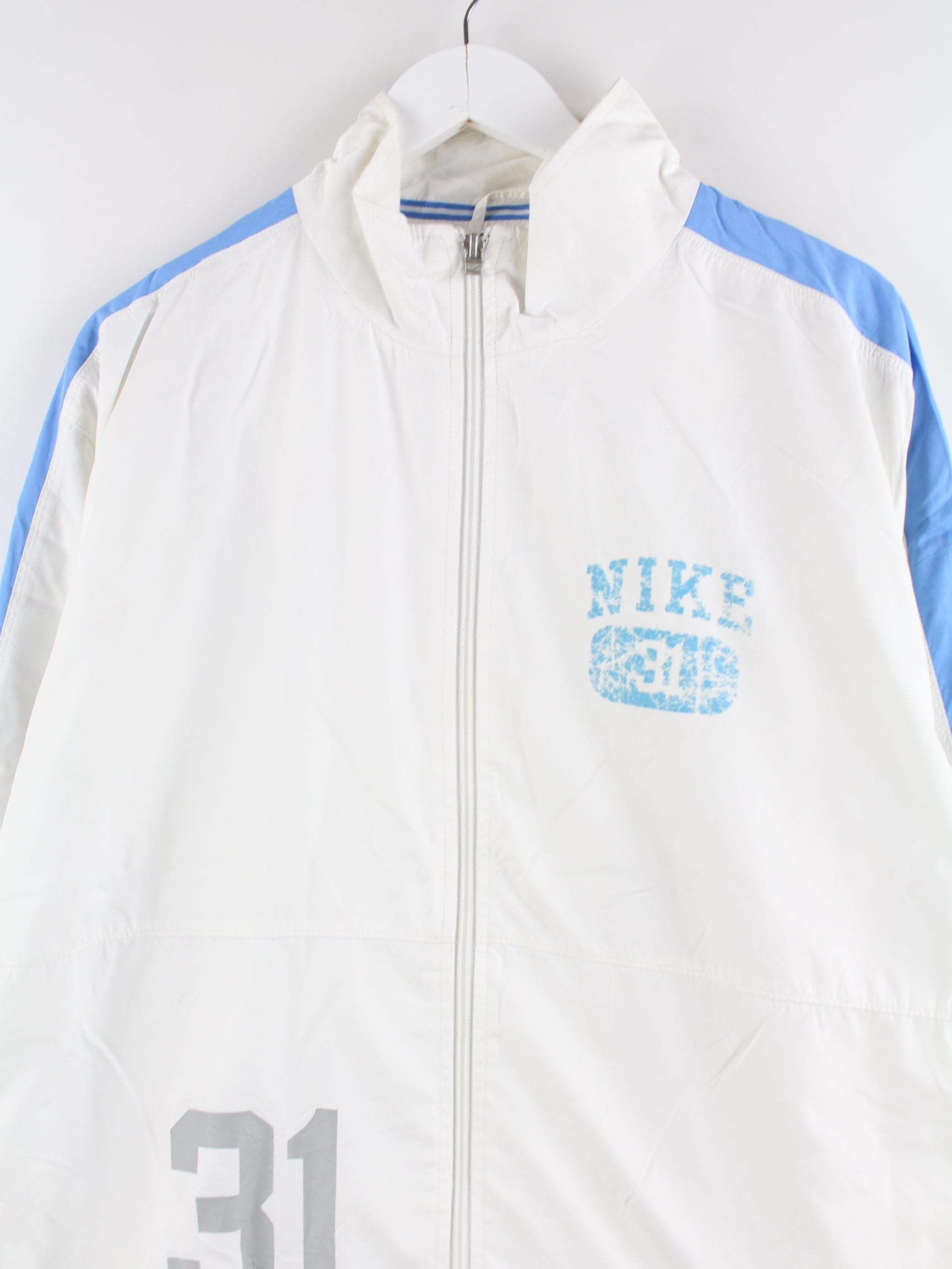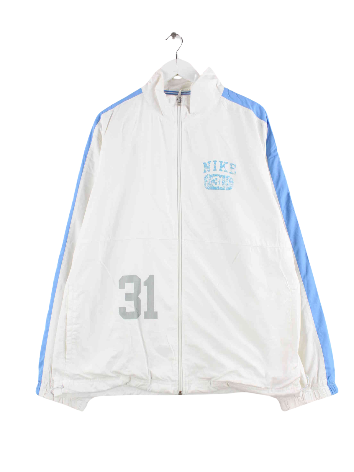 Gefällige Trainingsjacke von Nike in Größe XL aus Anfang der 2000'er. Sie ist aus Synthetik gemacht und in Weiß im Bestand. Mit schönem Vintage Print.